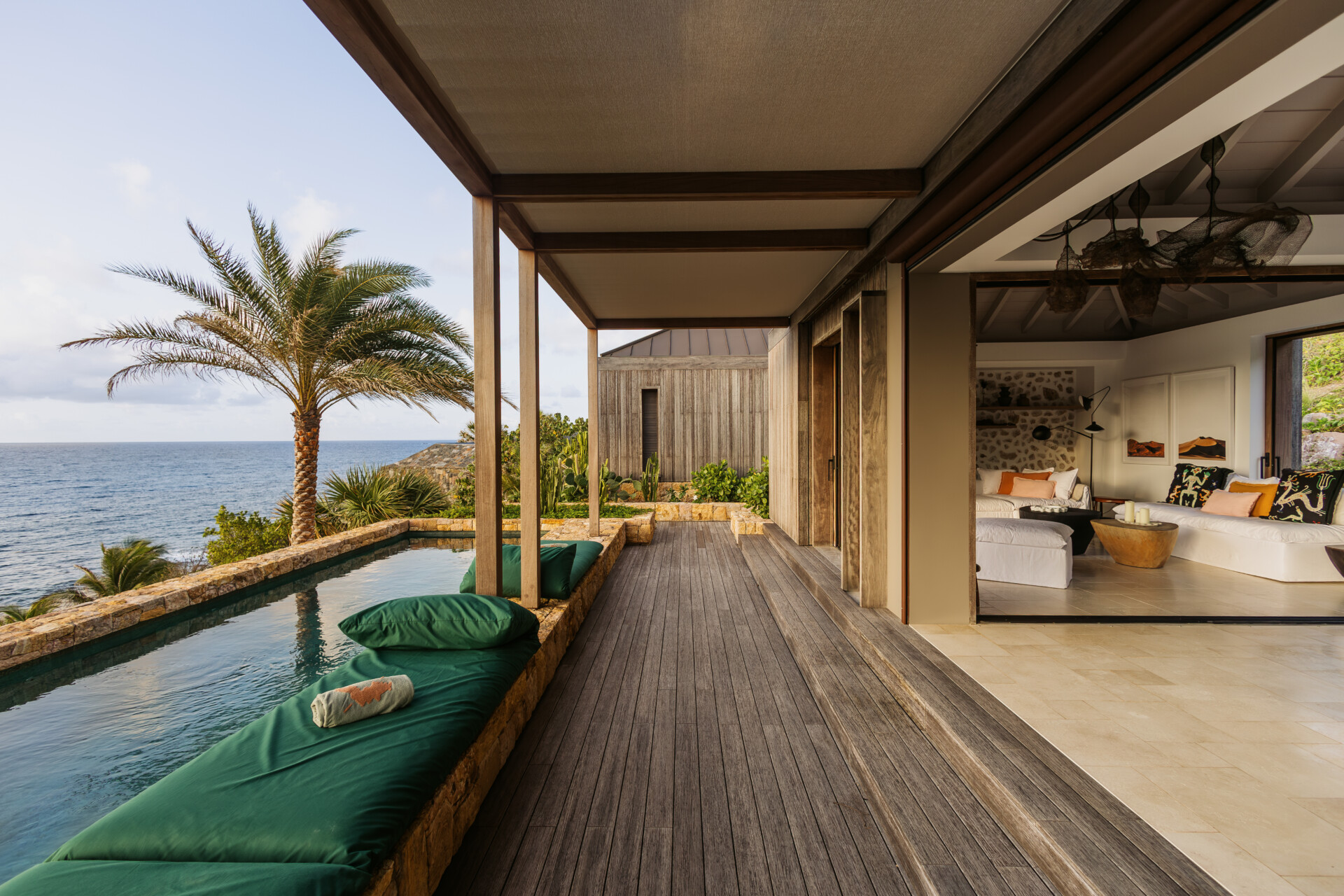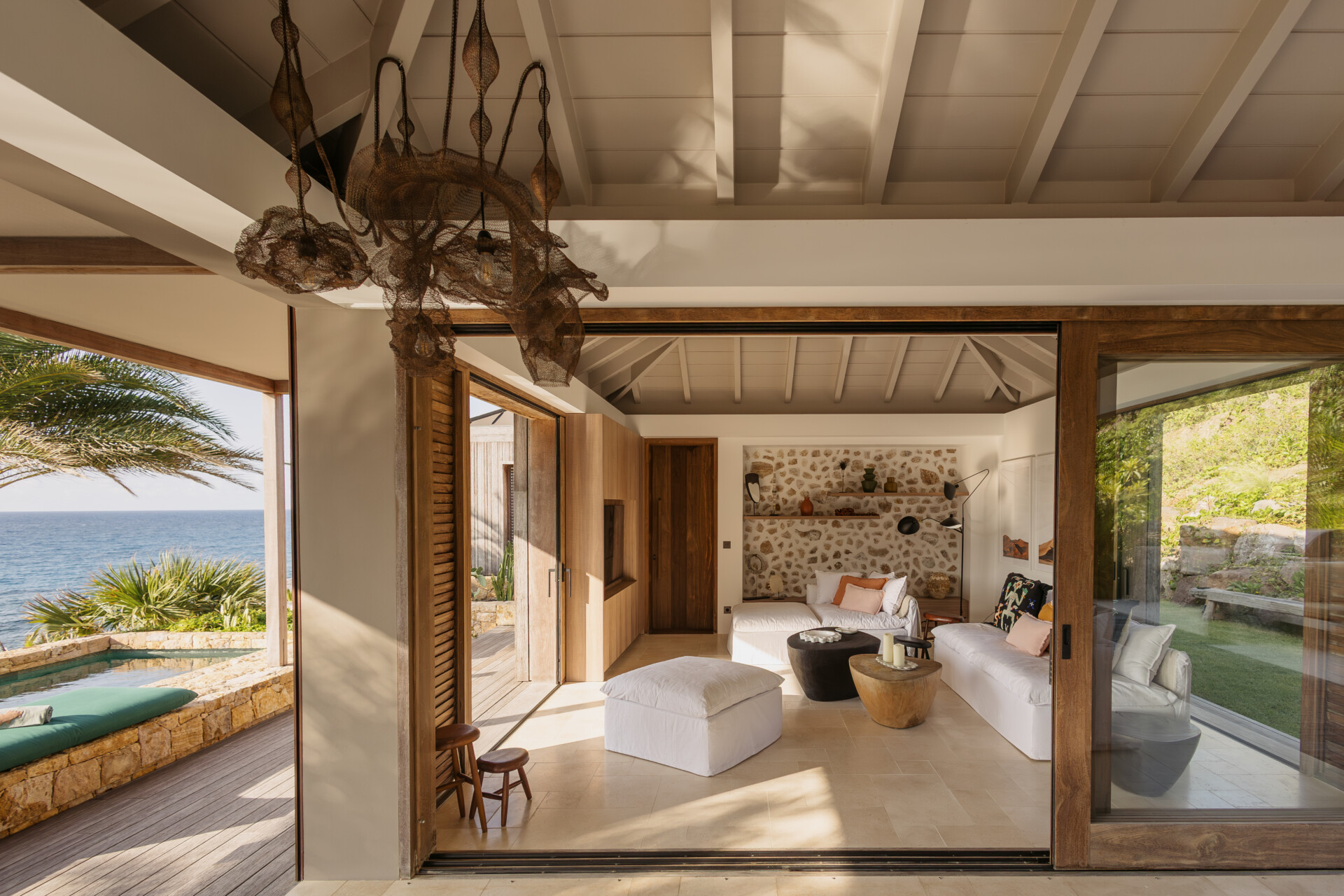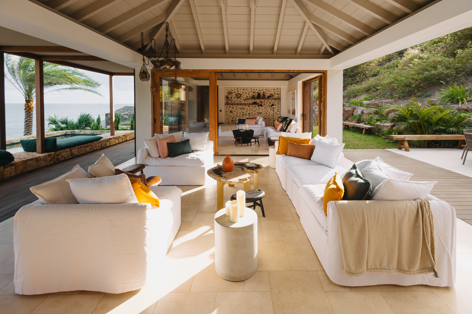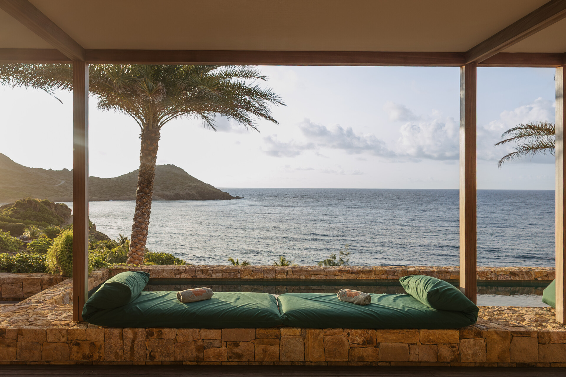 Set on the wild coast of Toiny, Villa Anima blends sculptural stone textures and natural wood with sleek contemporary lines, creating an atmosphere that is both striking and warm. Designed for ease and comfort, the villa makes the most of its hillside position with sweeping sea views and soft morning light.