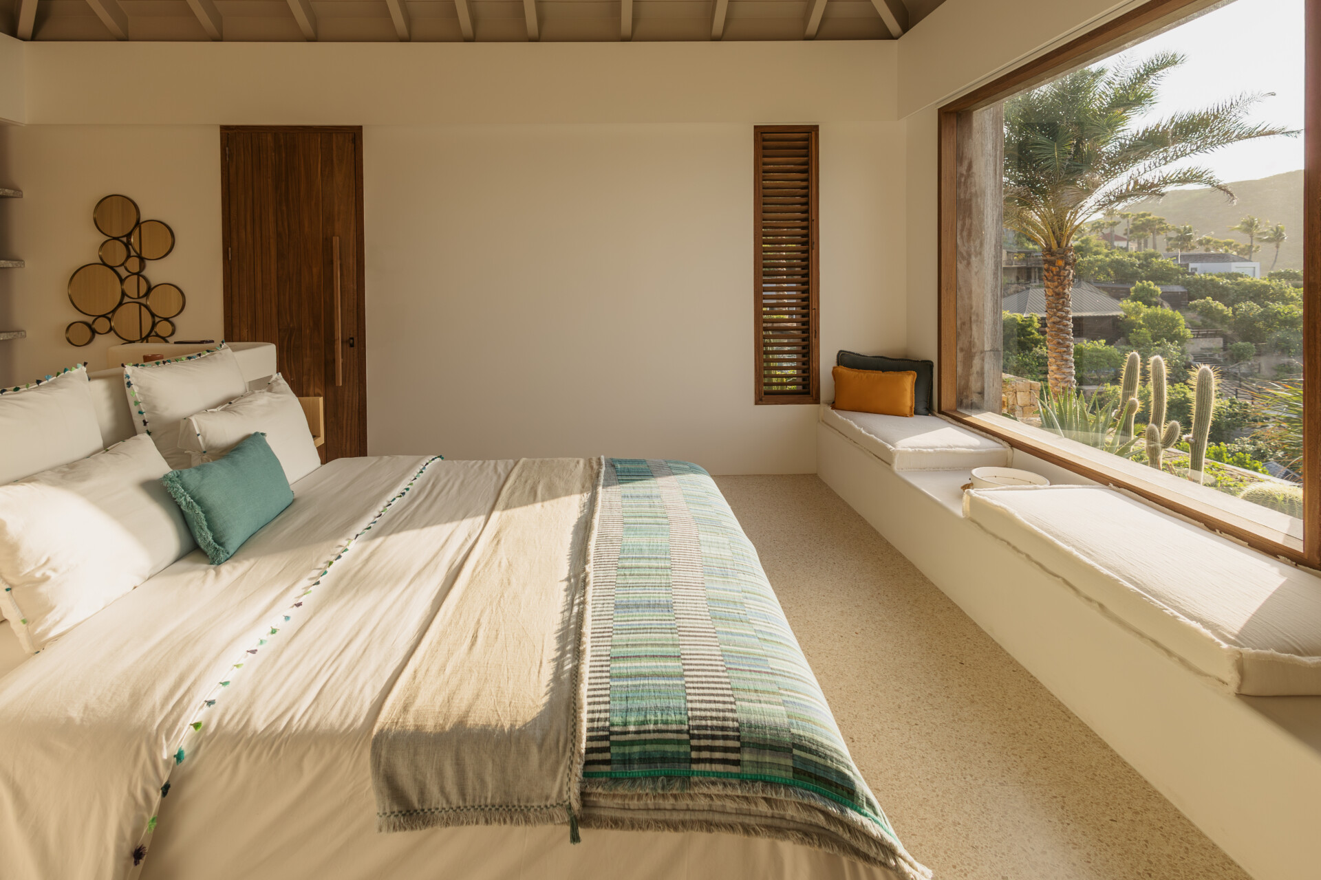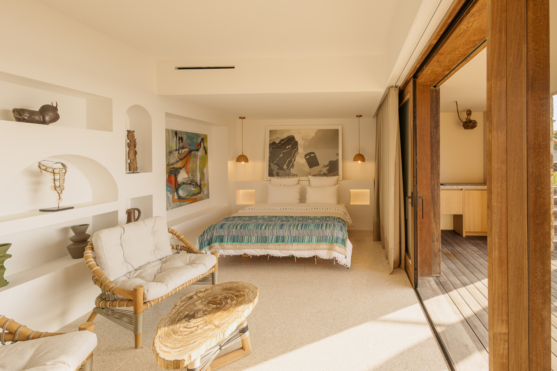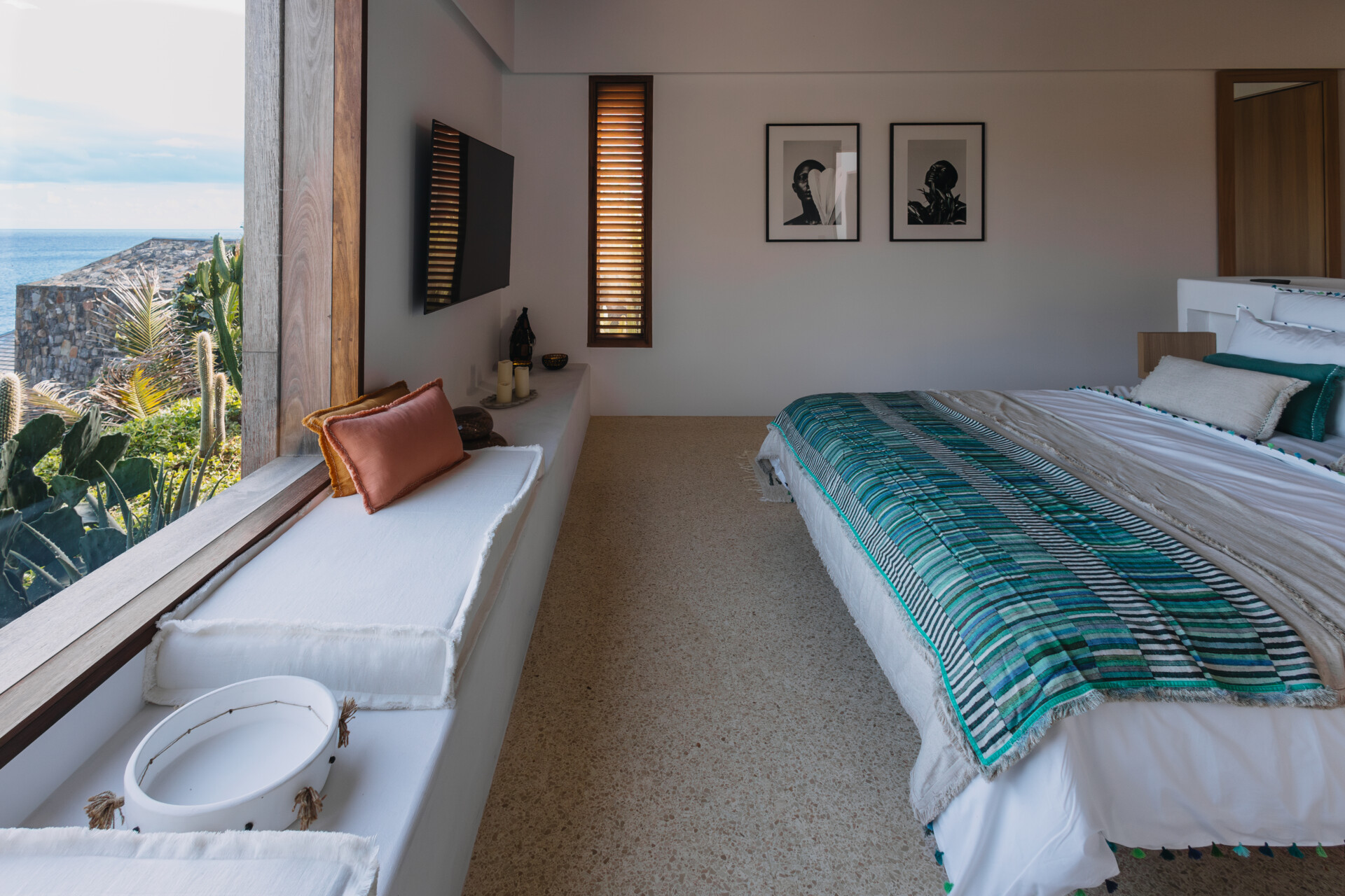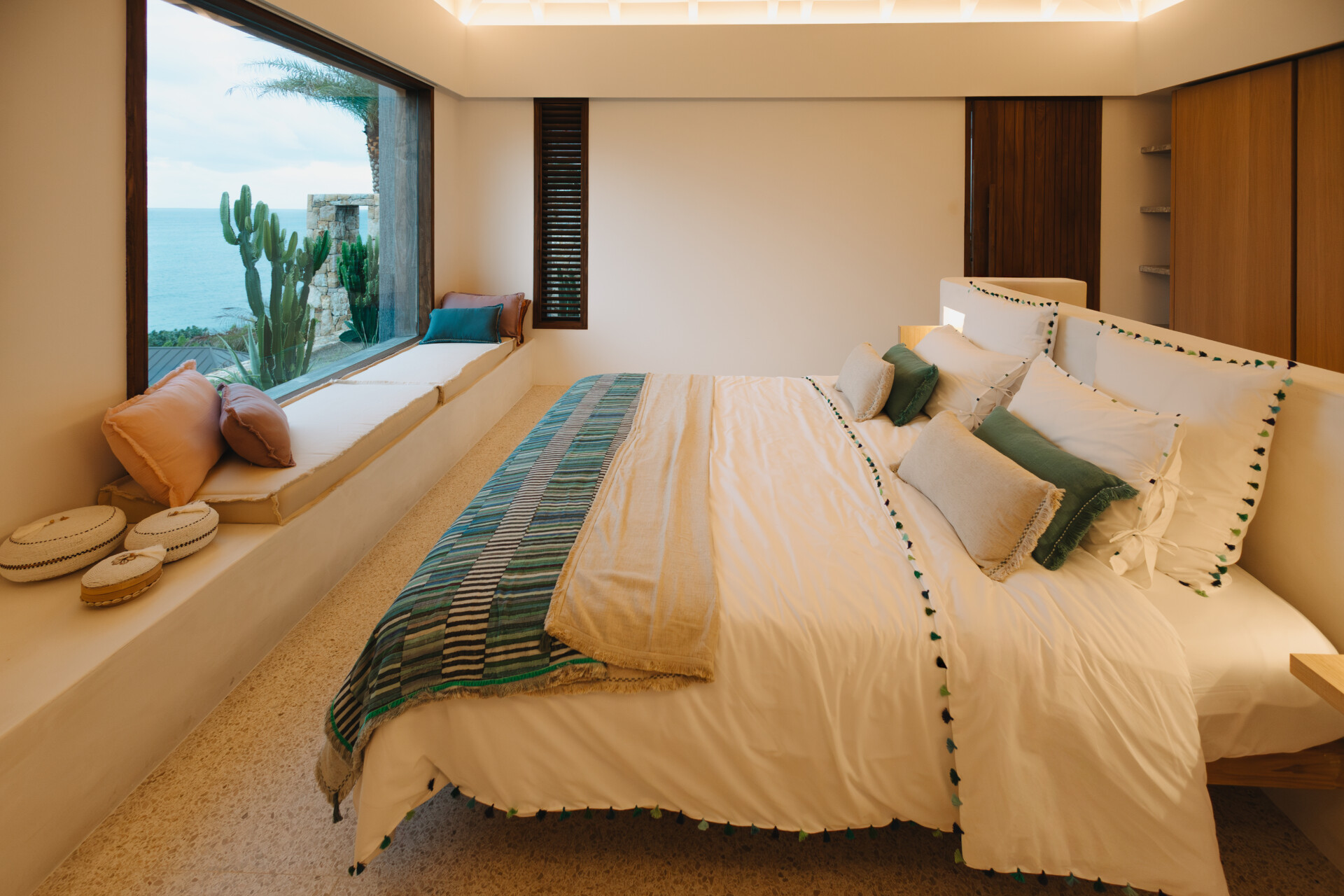 Four bedrooms are thoughtfully arranged for both privacy and connection. Two are located on either side of the main living spaces, while the third and fourth are situated on the lower level. Bedroom three has its own outdoor kitchenette and terrace. Each includes a king-size bed, ensuite bathroom, and a refined, neutral décor, with sea views framed by integrated greenery.
