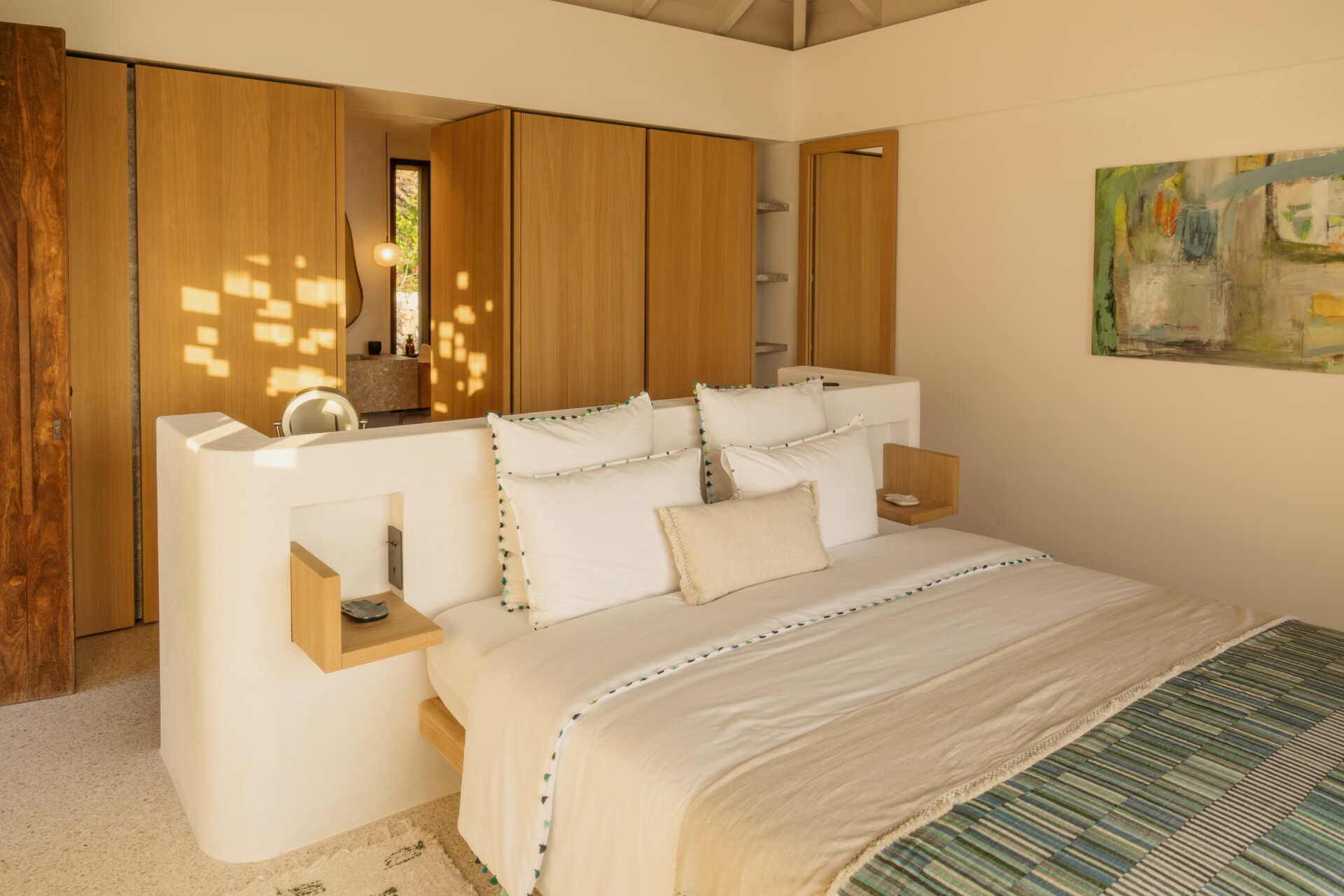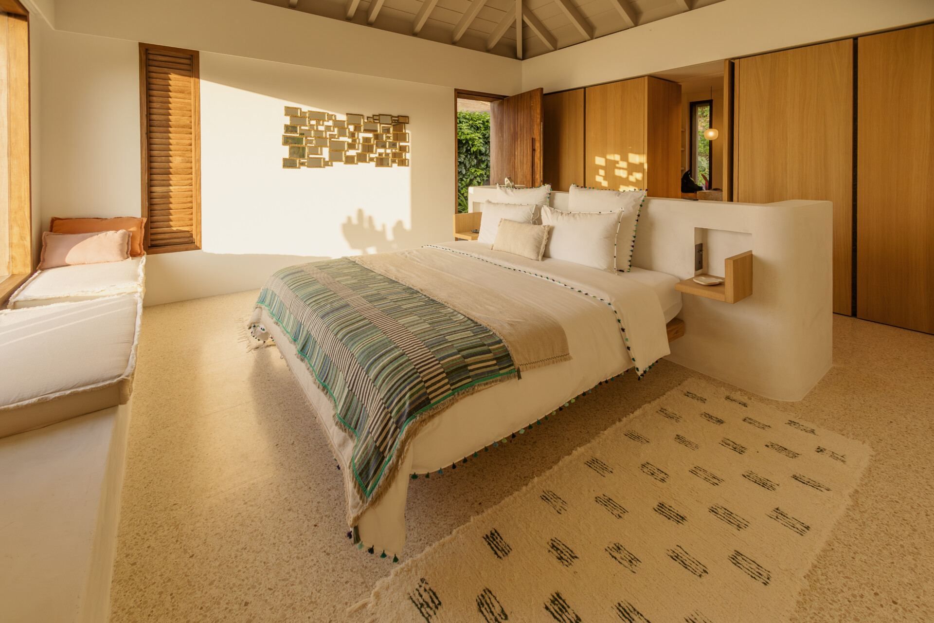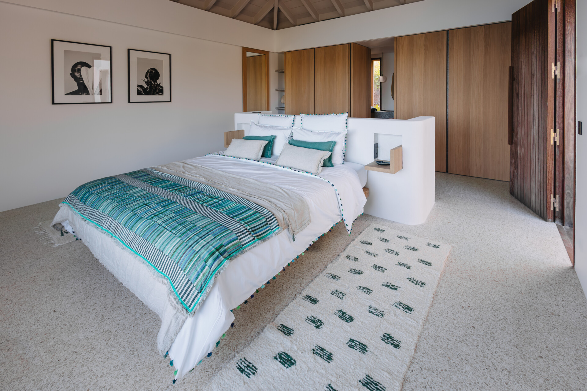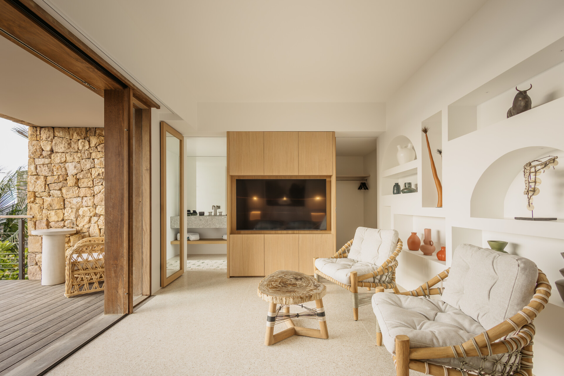 Four bedrooms are thoughtfully arranged for both privacy and connection. Two are located on either side of the main living spaces, while the third and fourth are situated on the lower level. Bedroom three has its own outdoor kitchenette and terrace. Each includes a king-size bed, ensuite bathroom, and a refined, neutral décor, with sea views framed by integrated greenery.