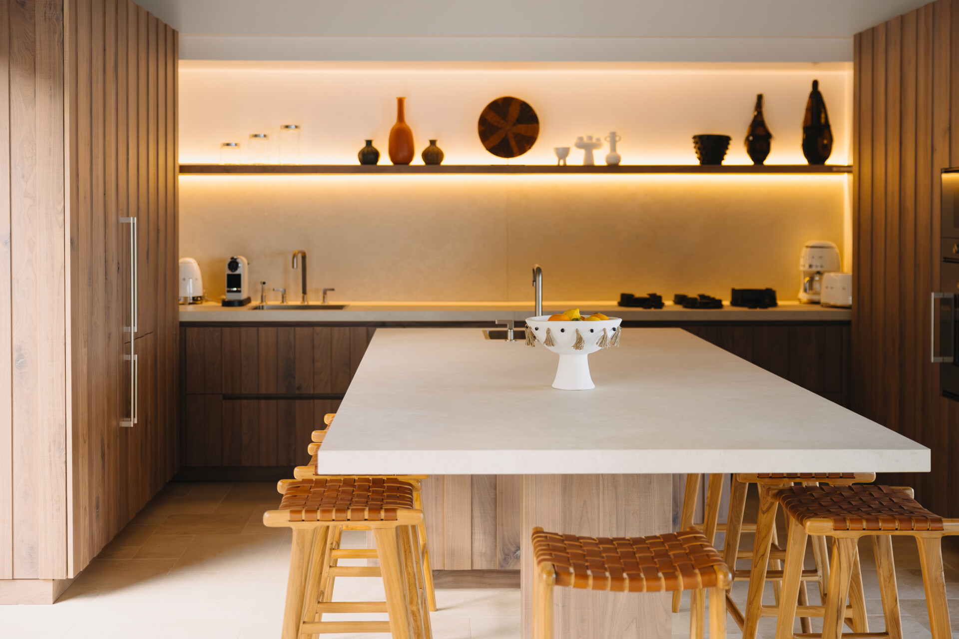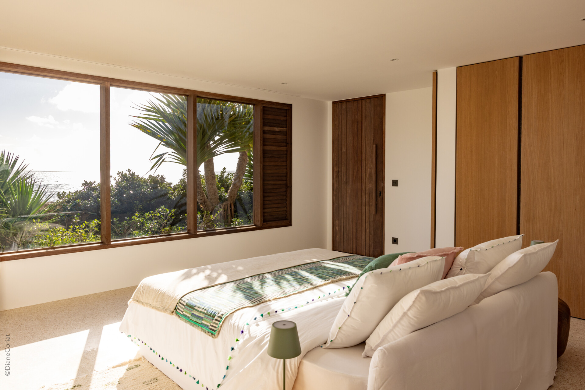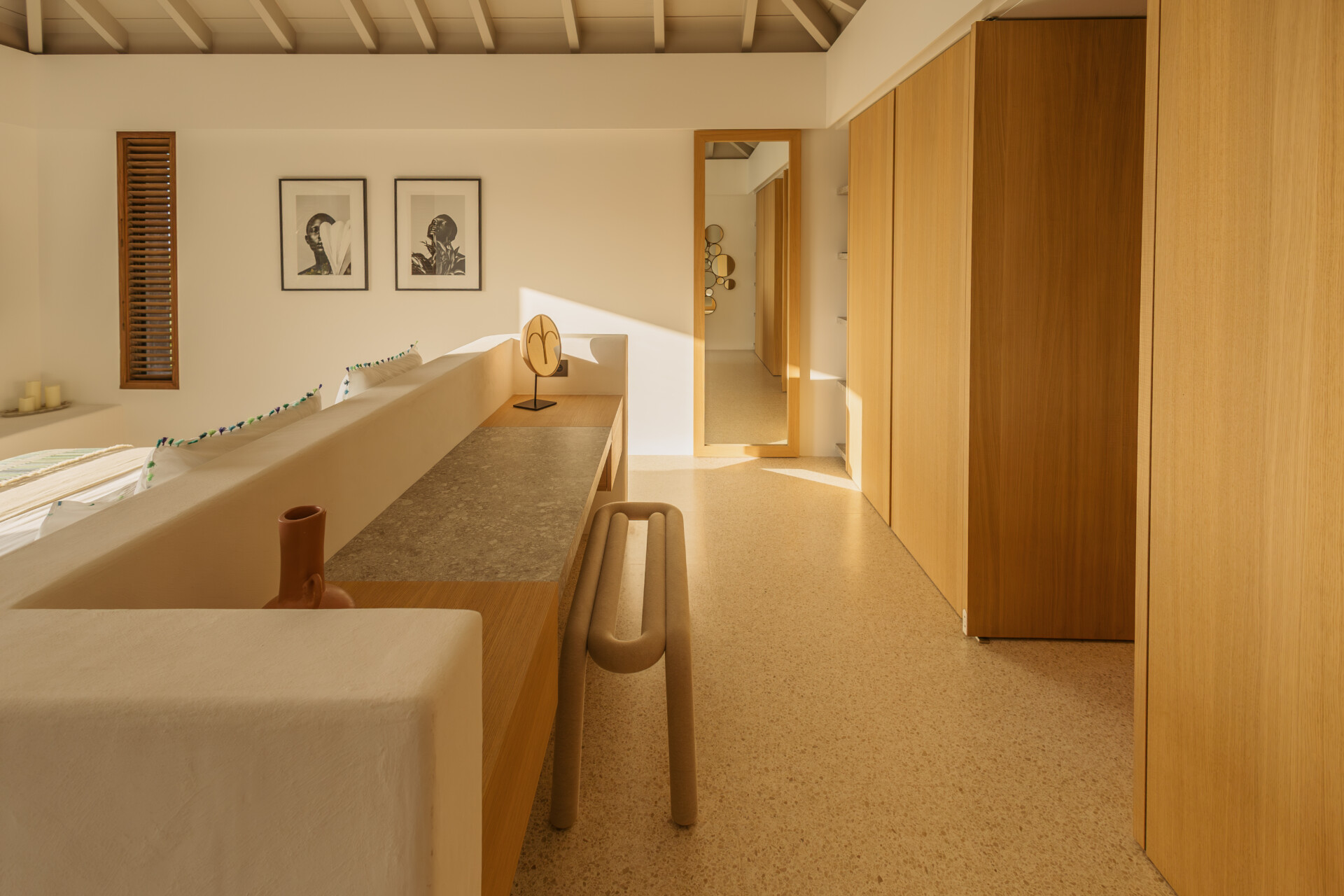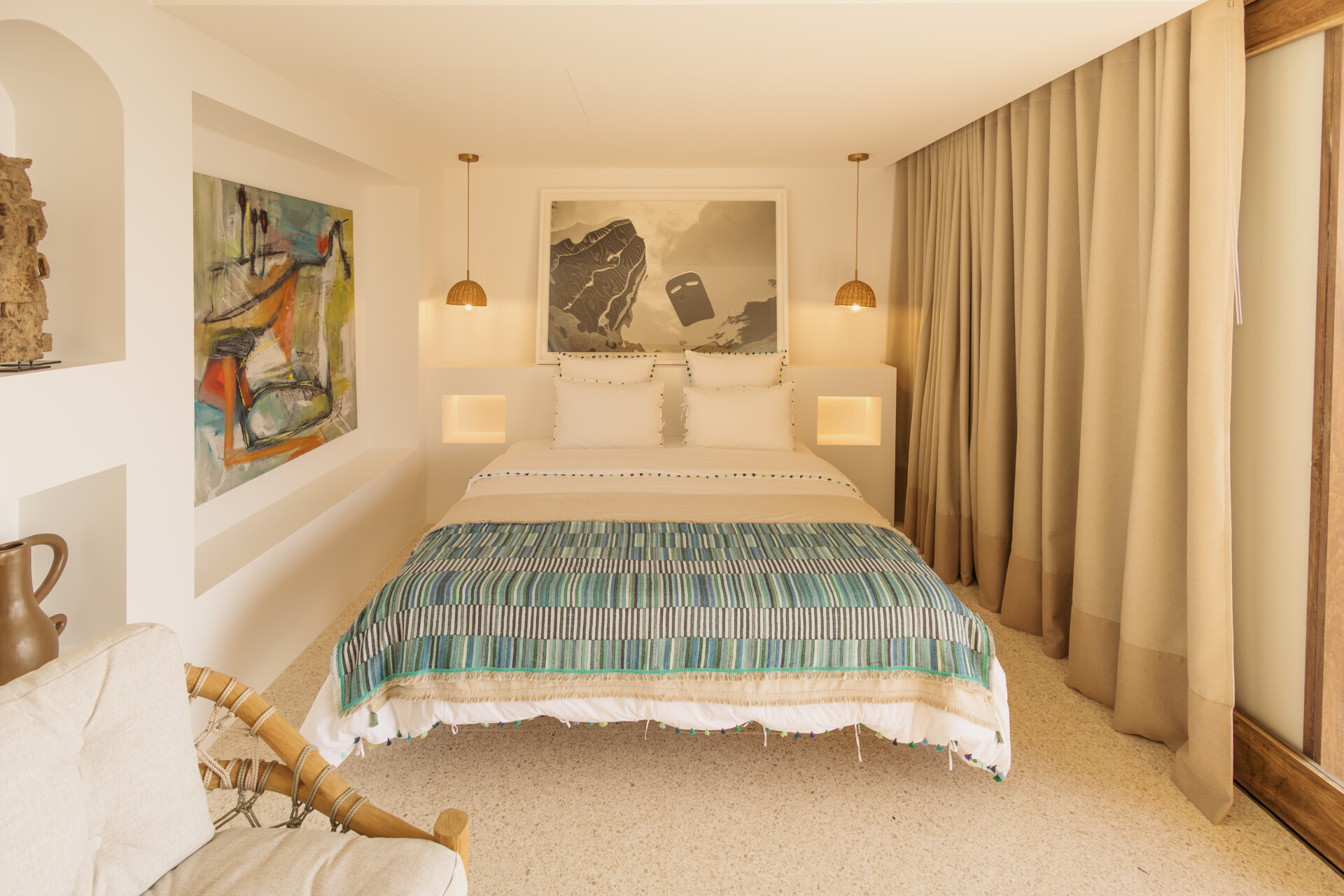 Four bedrooms are thoughtfully arranged for both privacy and connection. Two are located on either side of the main living spaces, while the third and fourth are situated on the lower level. Bedroom three has its own outdoor kitchenette and terrace. Each includes a king-size bed, ensuite bathroom, and a refined, neutral décor, with sea views framed by integrated greenery.