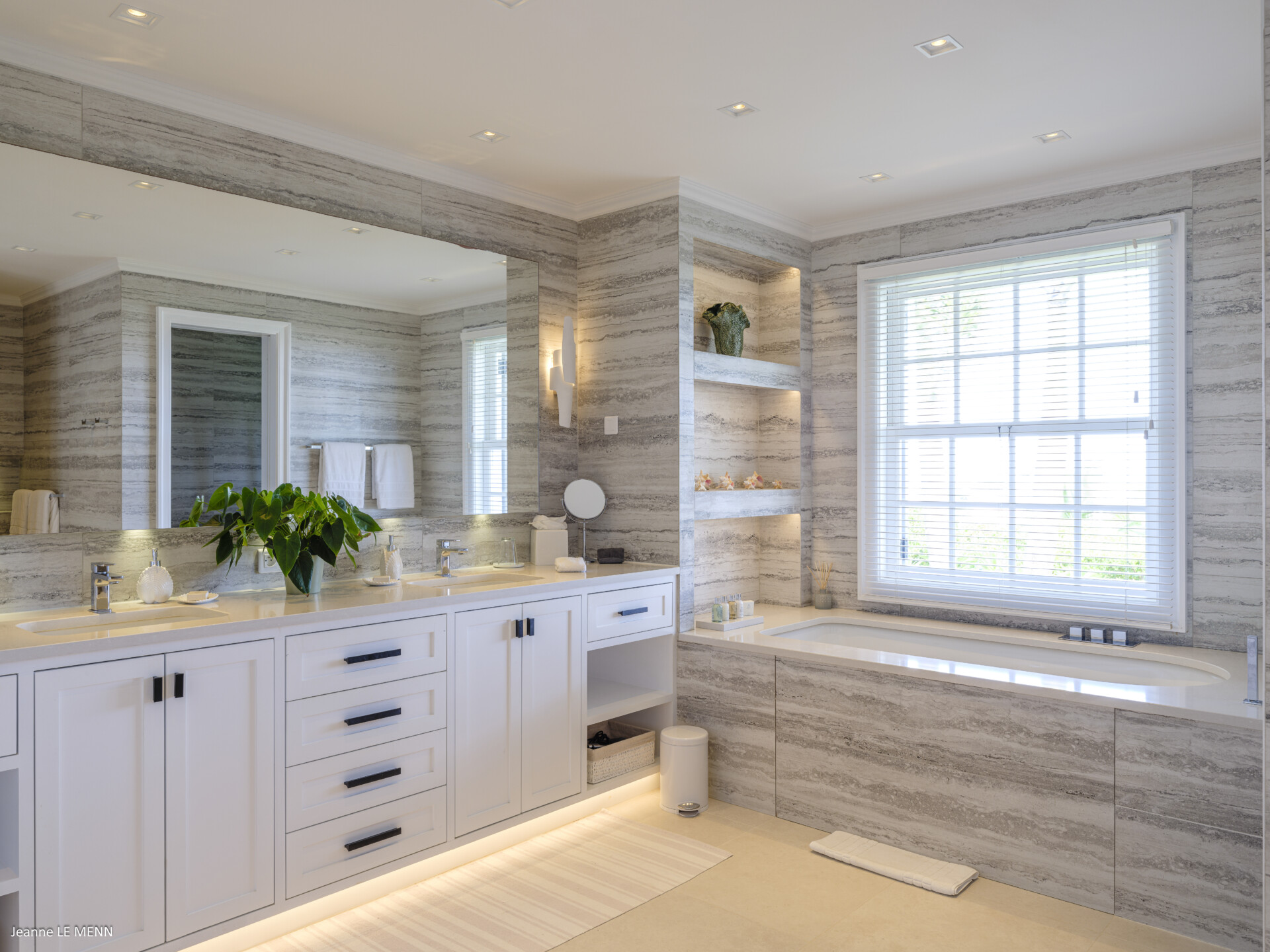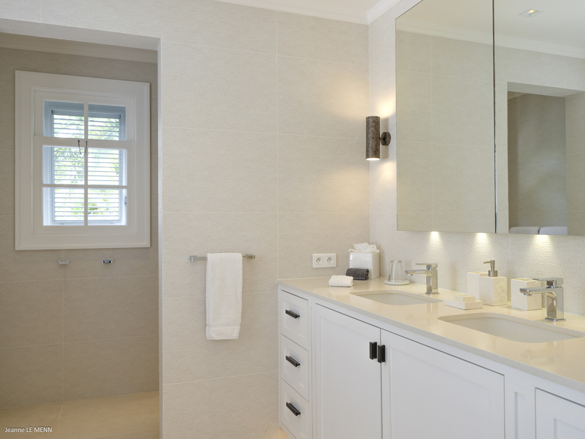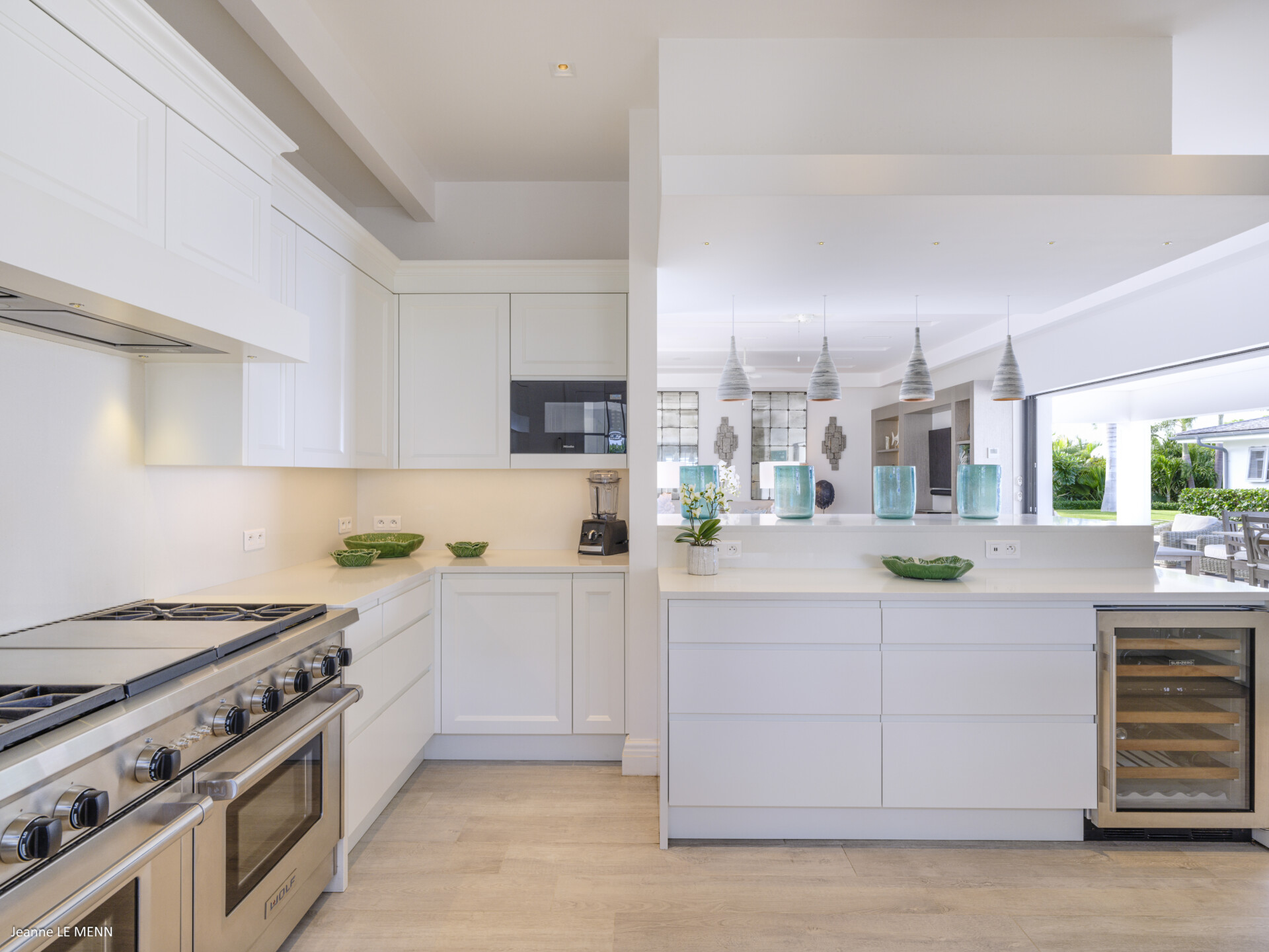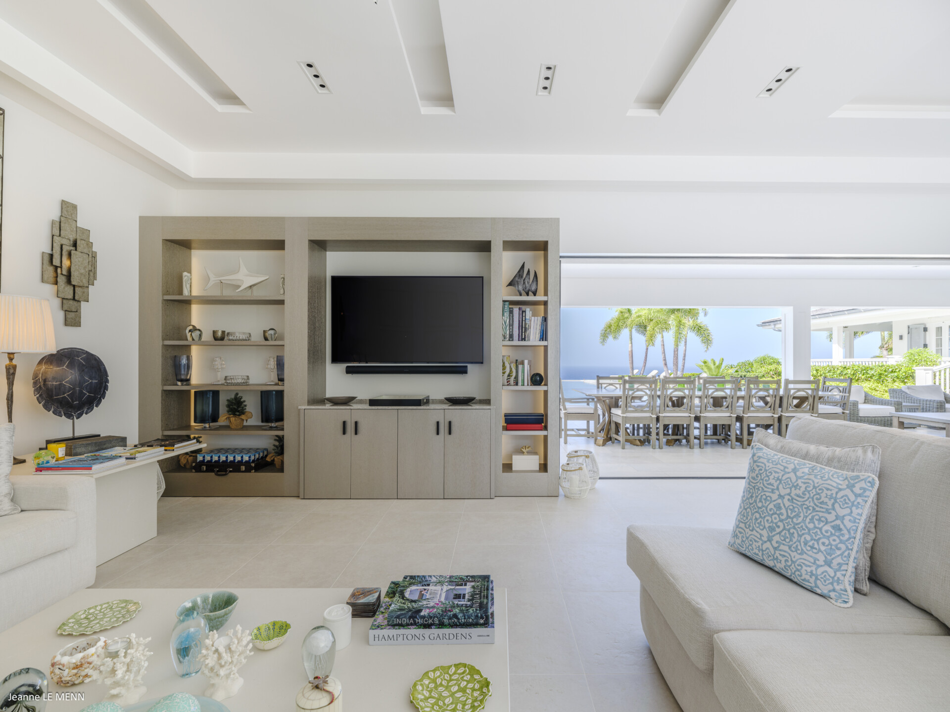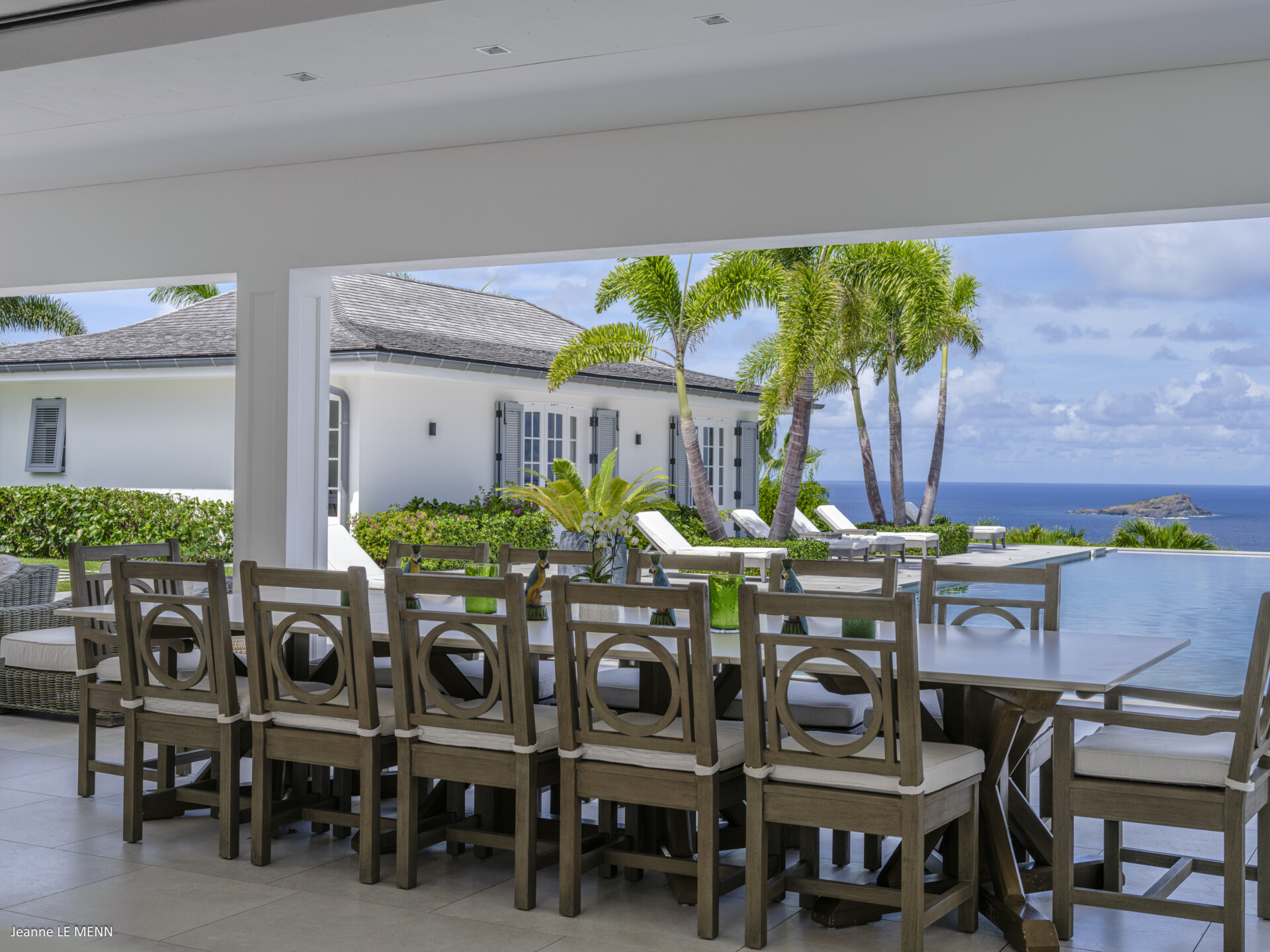 Decorated in natural tones, the living area is open to the luxurious kitchen, which has every modern appliance and a breakfast bar. In front of these spaces, there are two wonderful dining pavilions, which are perfect for entertaining or for simply enjoying the marvelous views over the ocean.