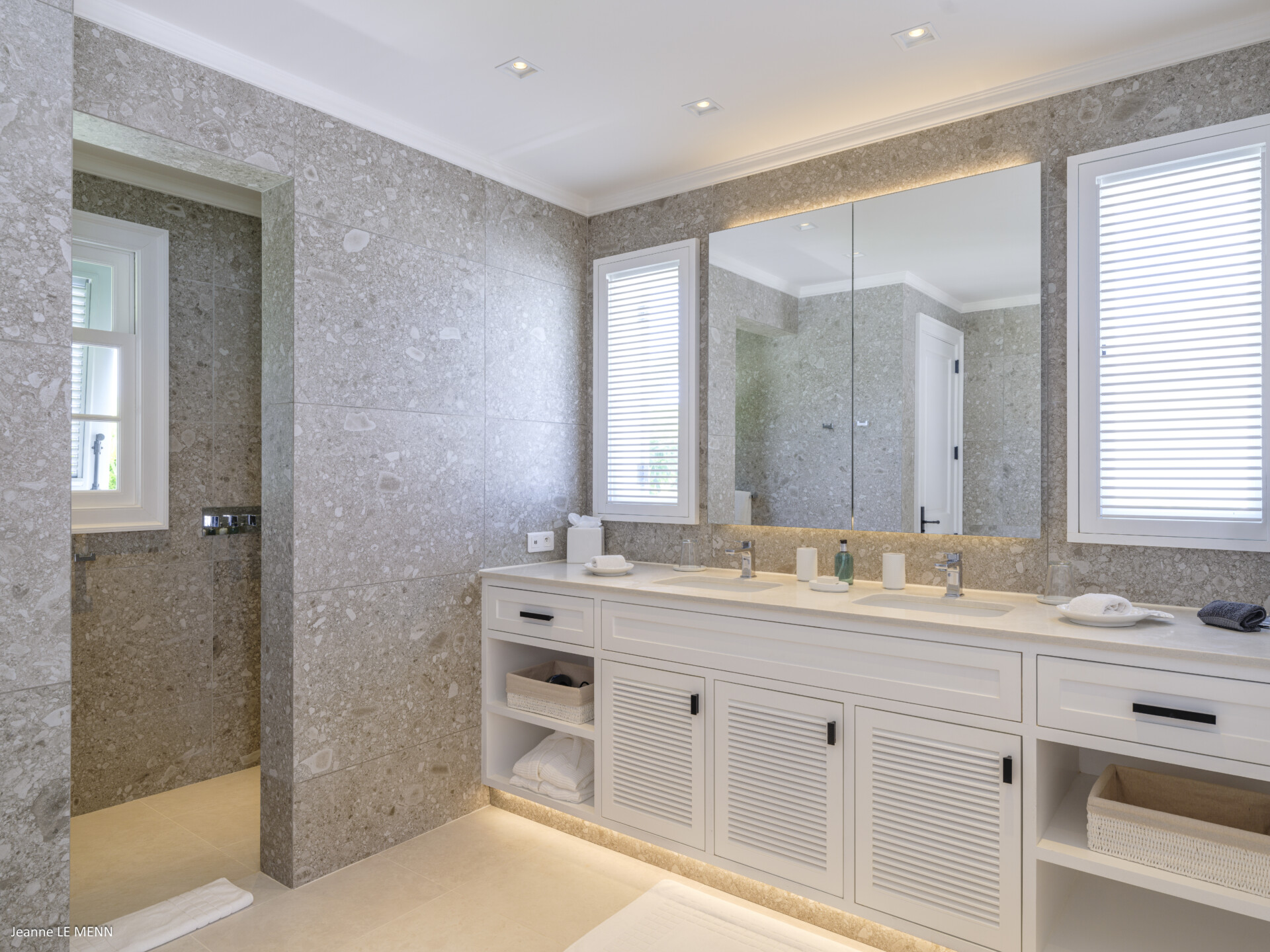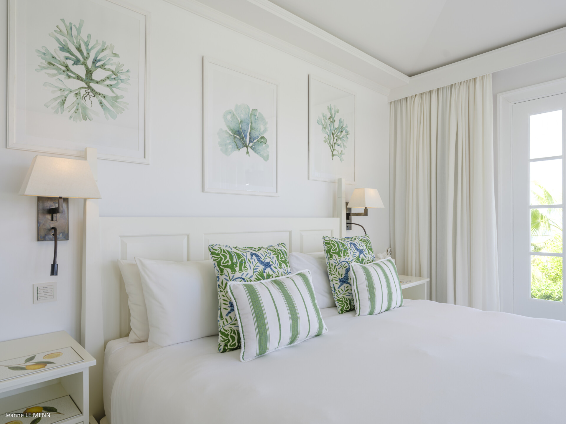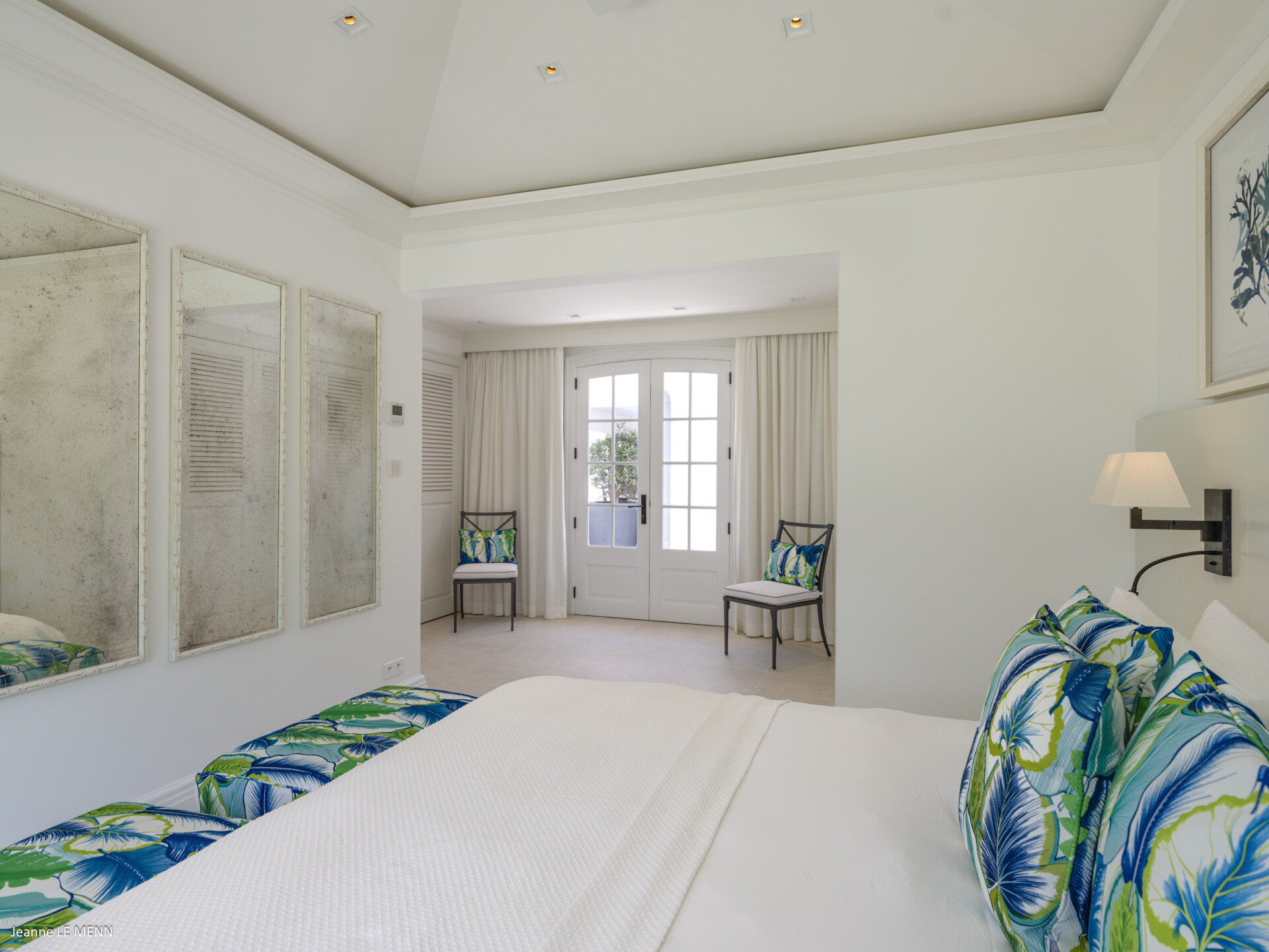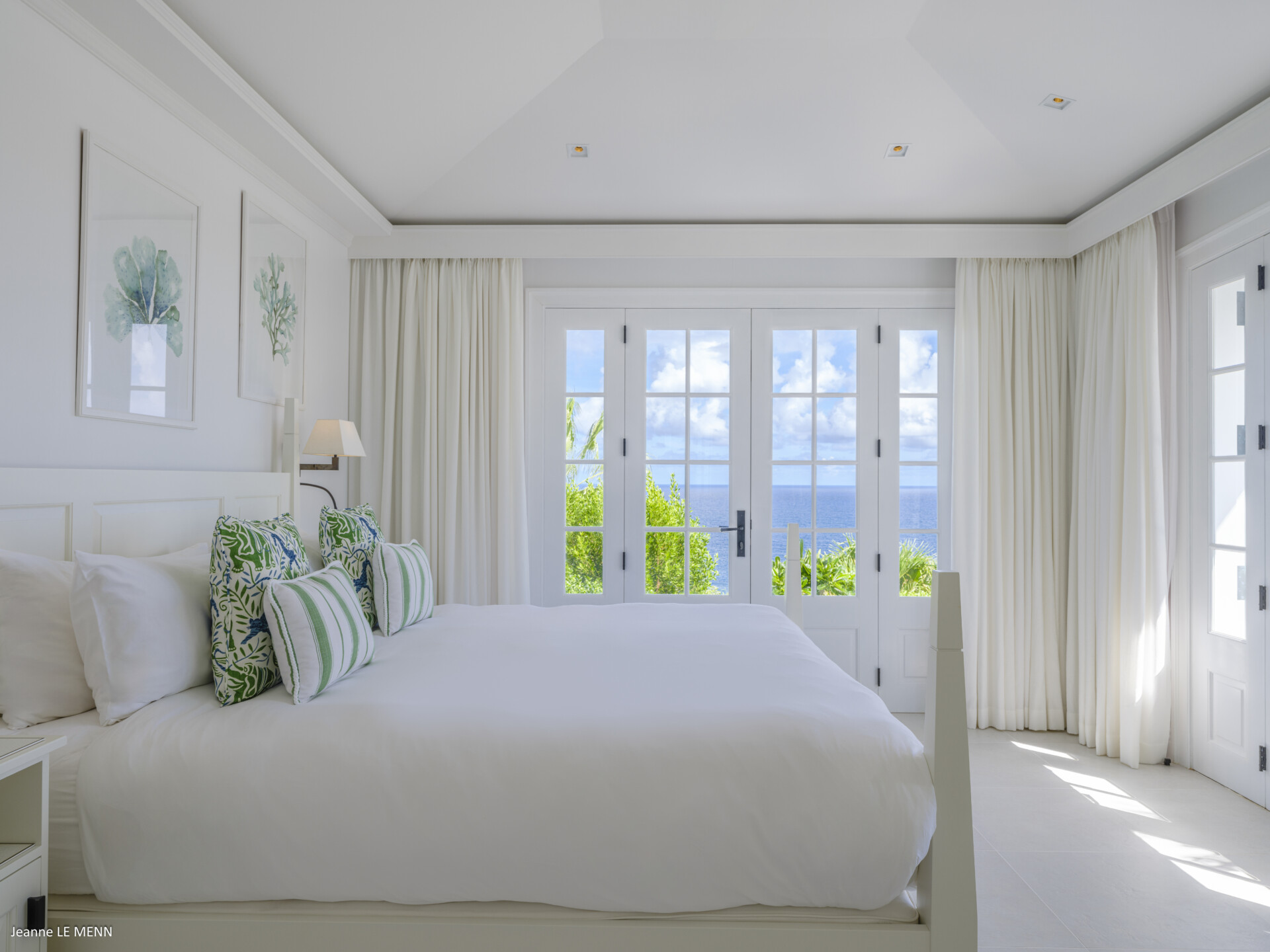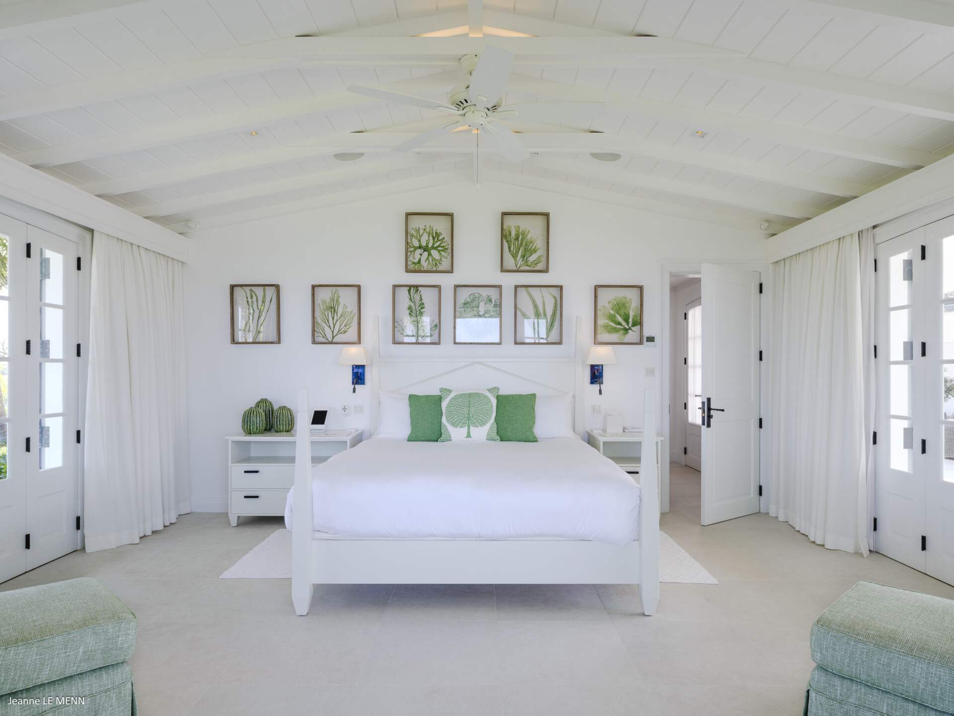 The master bedroom is very private, on its own side of the pool with a wrap-around covered terrace with lovely white wicker furniture and a swing seat, with views out to sea and the surrounding gardens. The four other beautifully decorated double bedrooms each have a king-size bed and an ensuite bathroom, making Villa Antares a perfect place for five couples.
