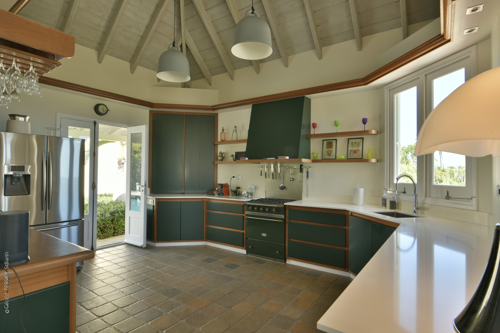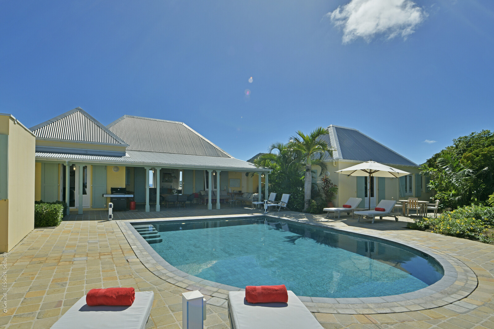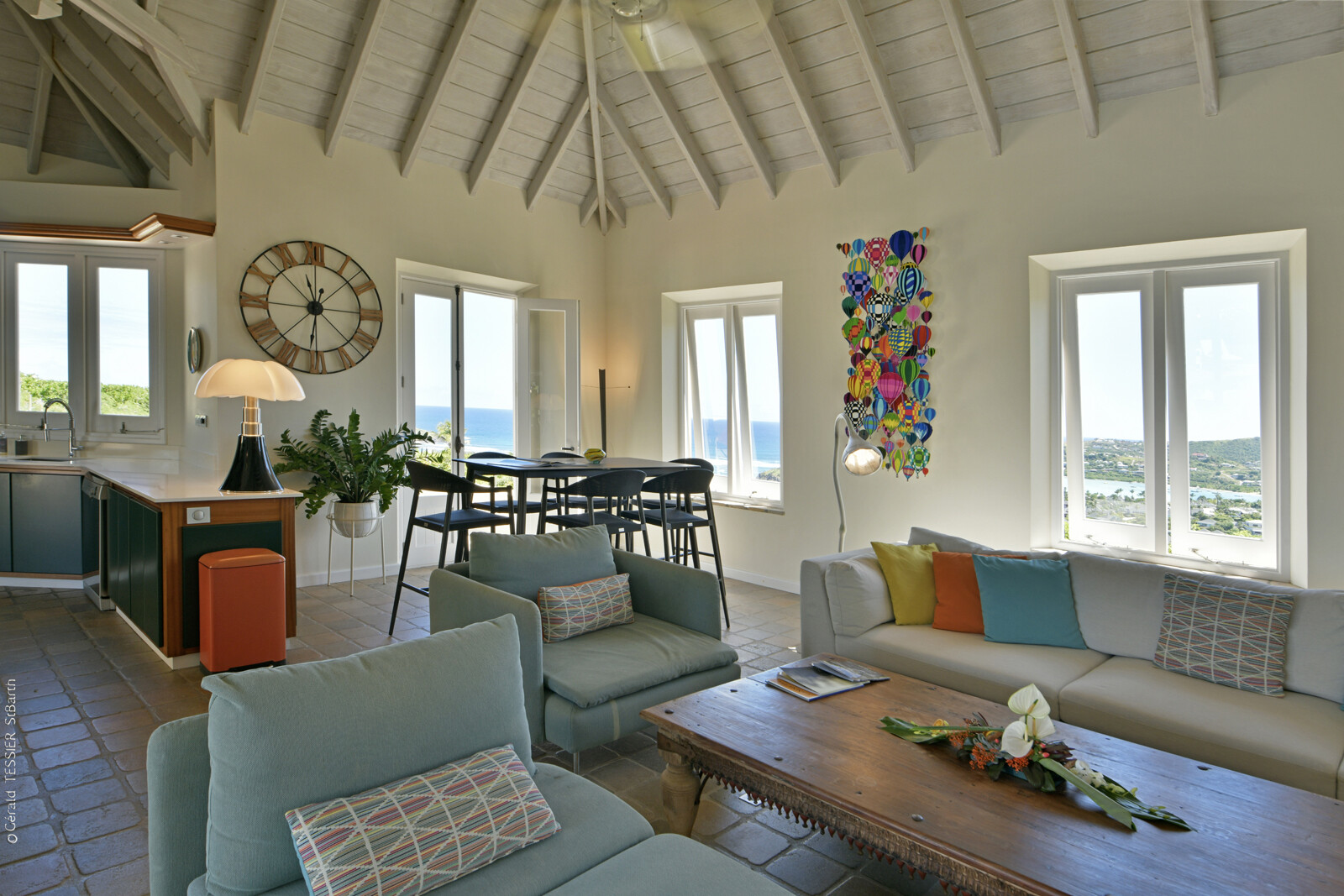 Earthy, welcoming, and spectacularly private and comfortable, Avel ar Mor (AVE) is jewel atop a hill in the exclusive, gated Mont Jean community of private villas. You’re seduced before you even step inside, thanks to the luscious tropical garden that surrounds the villa. Once you’re stepped through the green-shuttered front door, you’ll discover a tranquil, spacious, sun-splashed home with simple-chic furnishings, cool tile floors, and a gracious outdoor dining area.