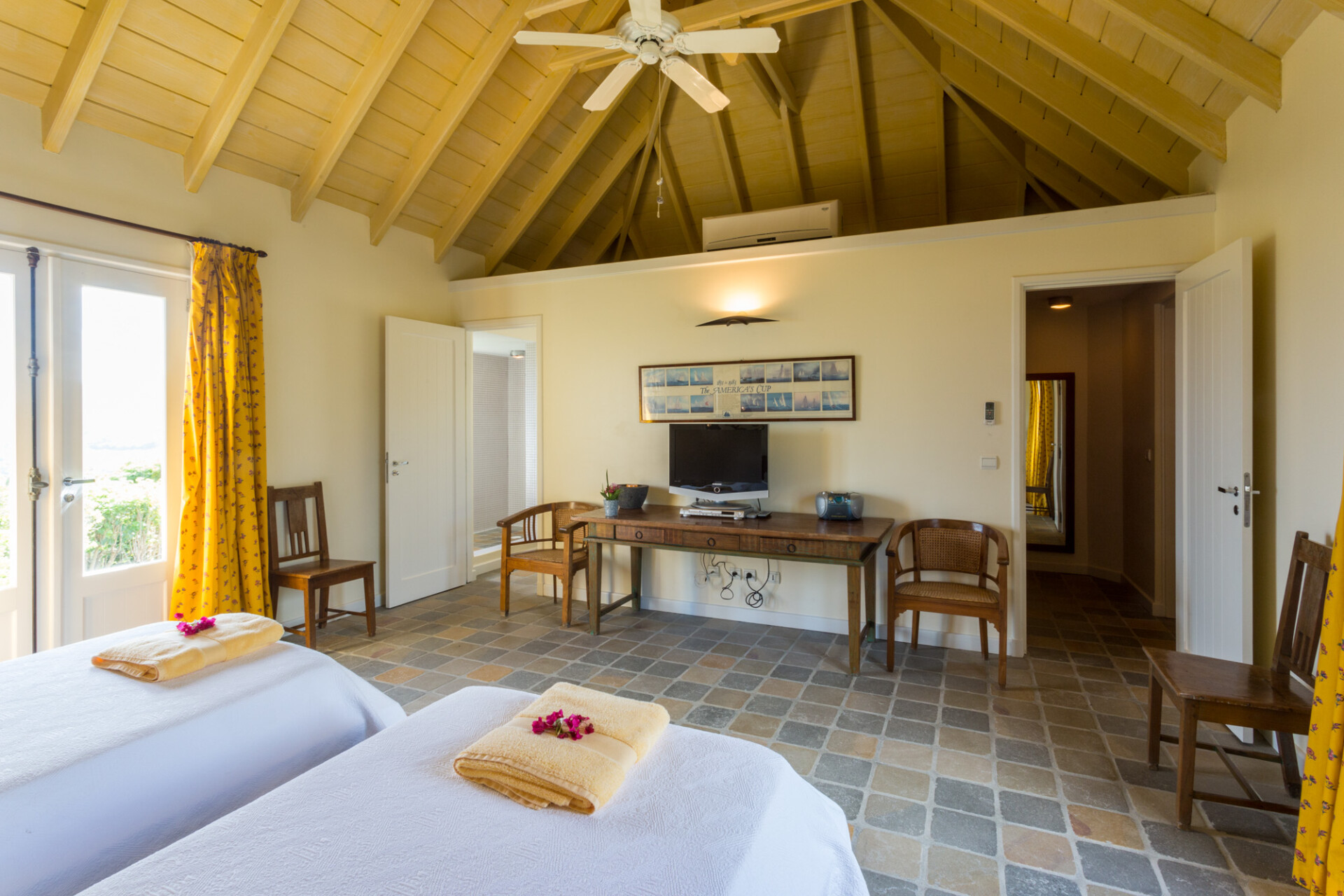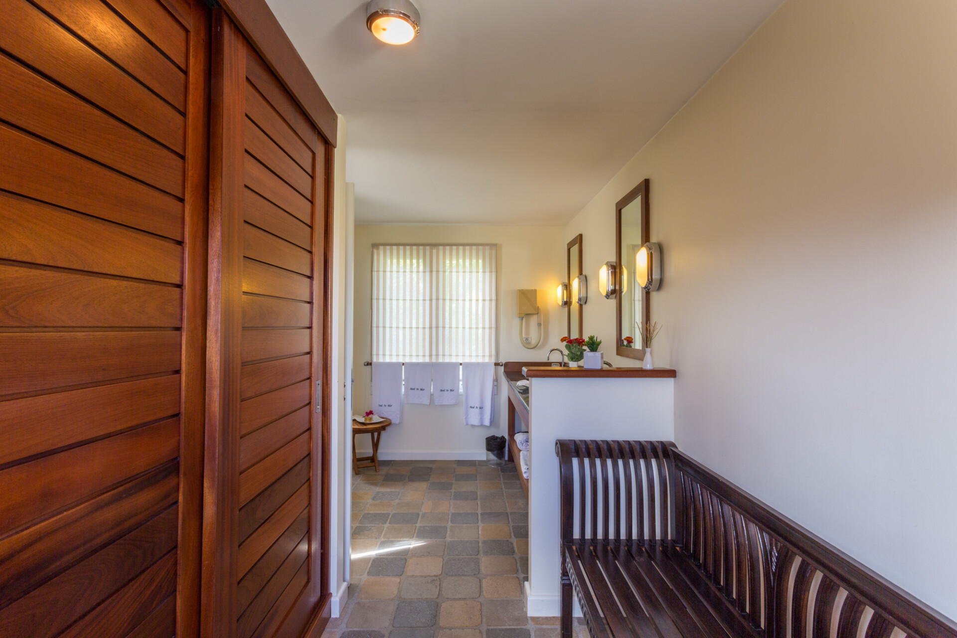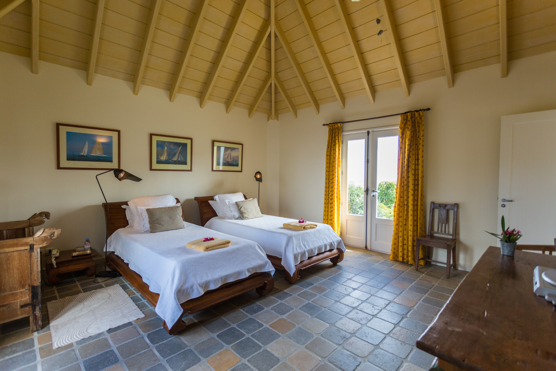 Housed in a separate bungalow. Two twin beds, generous dressing room, and large bathroom with double vanities and rain shower. Opens onto little terrace. Connects to bedroom 2 if required.