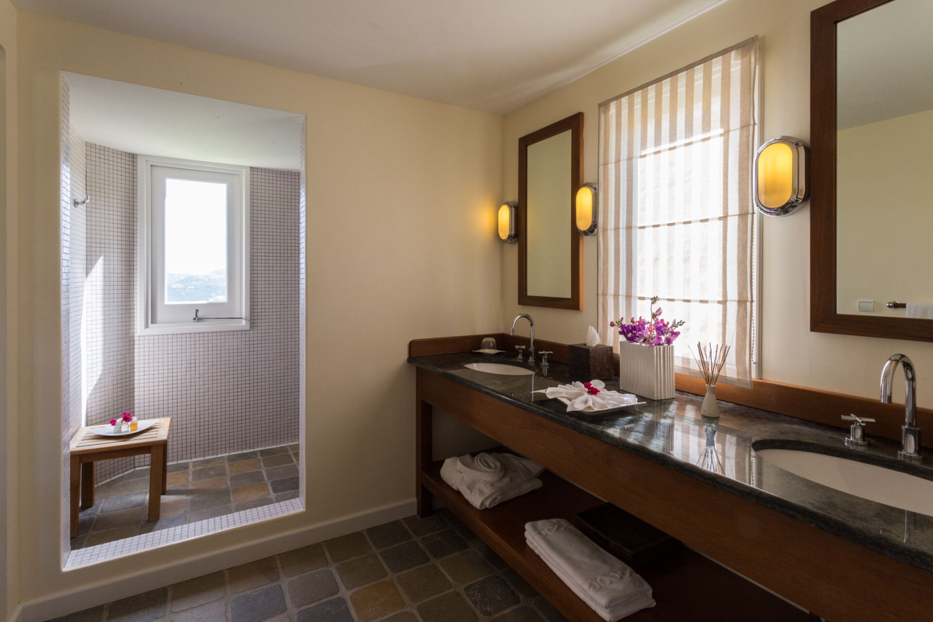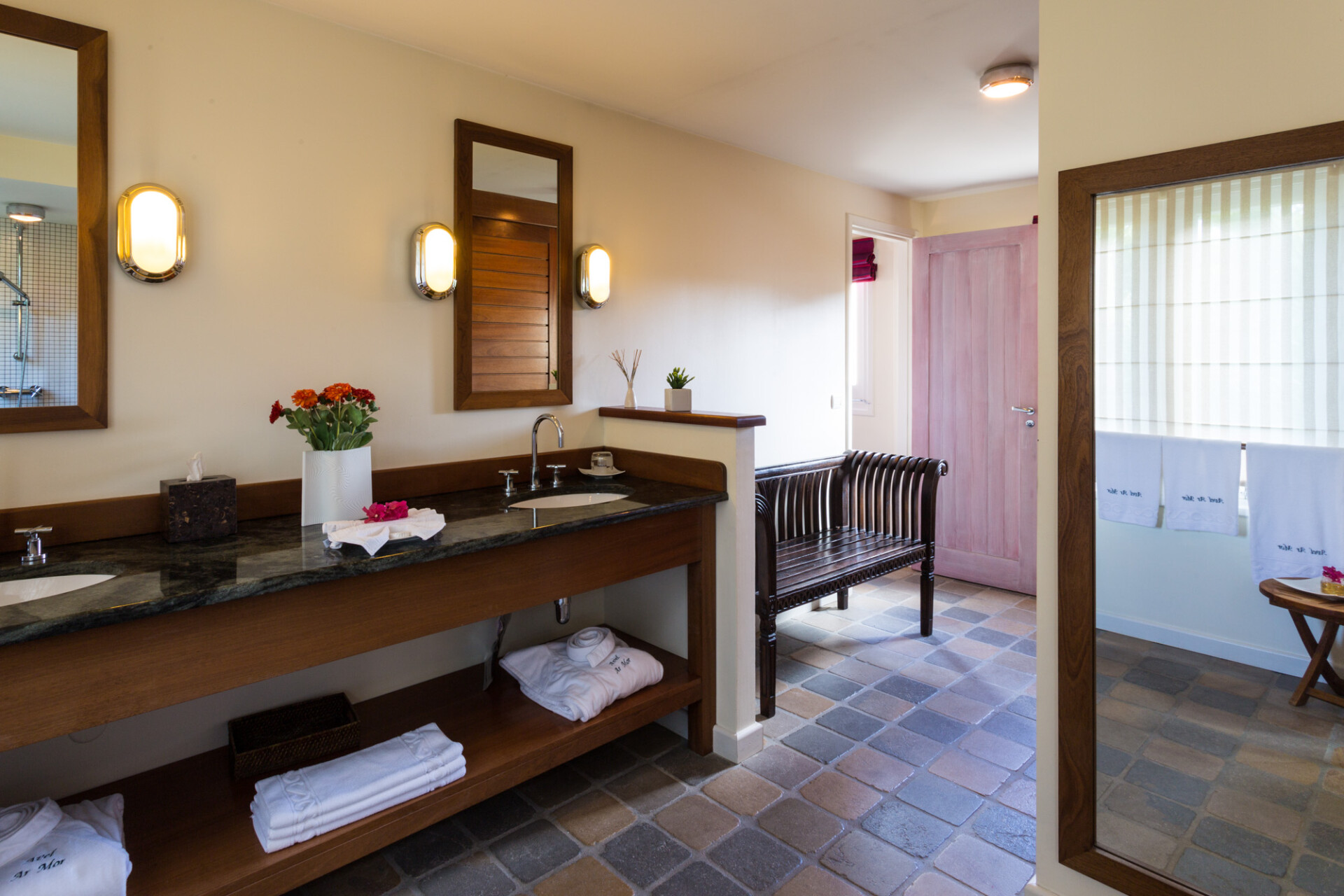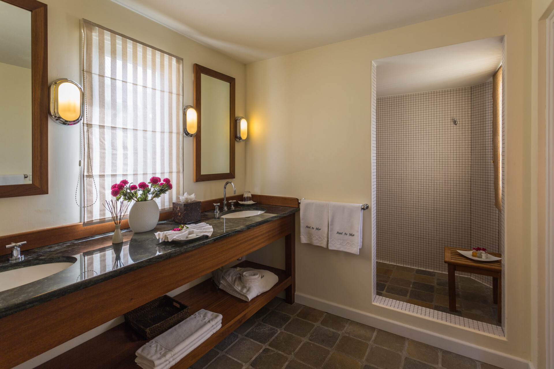Housed in a separate bungalow. Two twin beds, generous dressing room, and large bathroom with double vanities and rain shower. Opens onto little terrace. Connects to bedroom 2 if required.