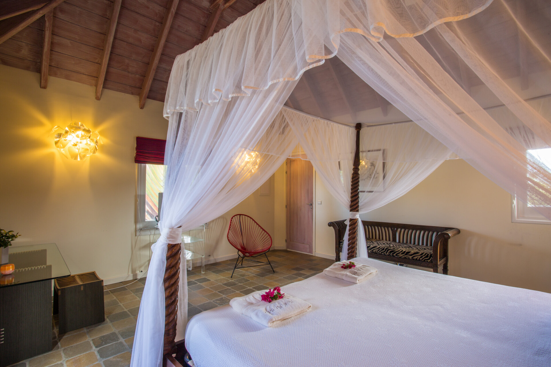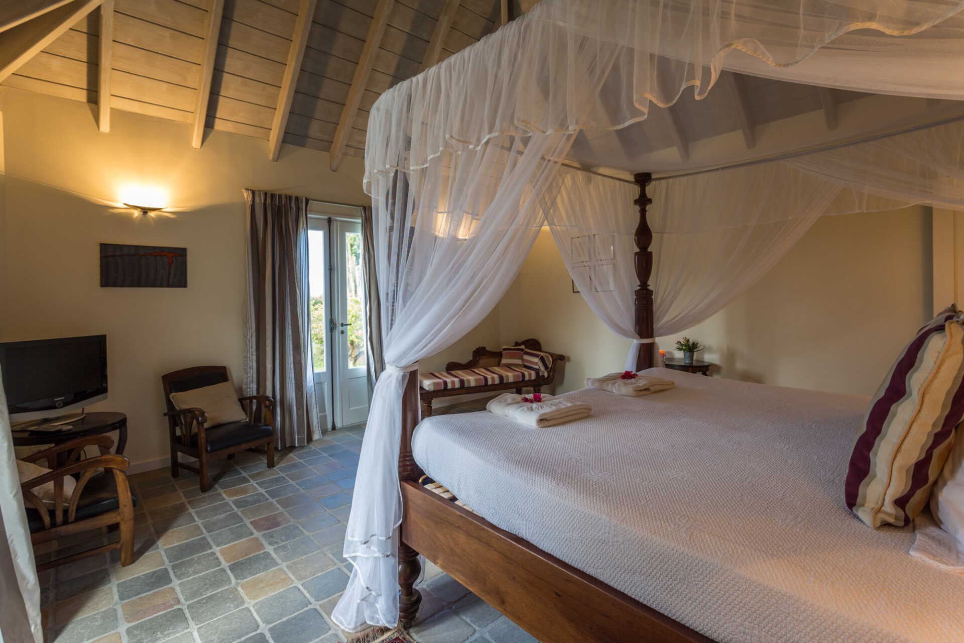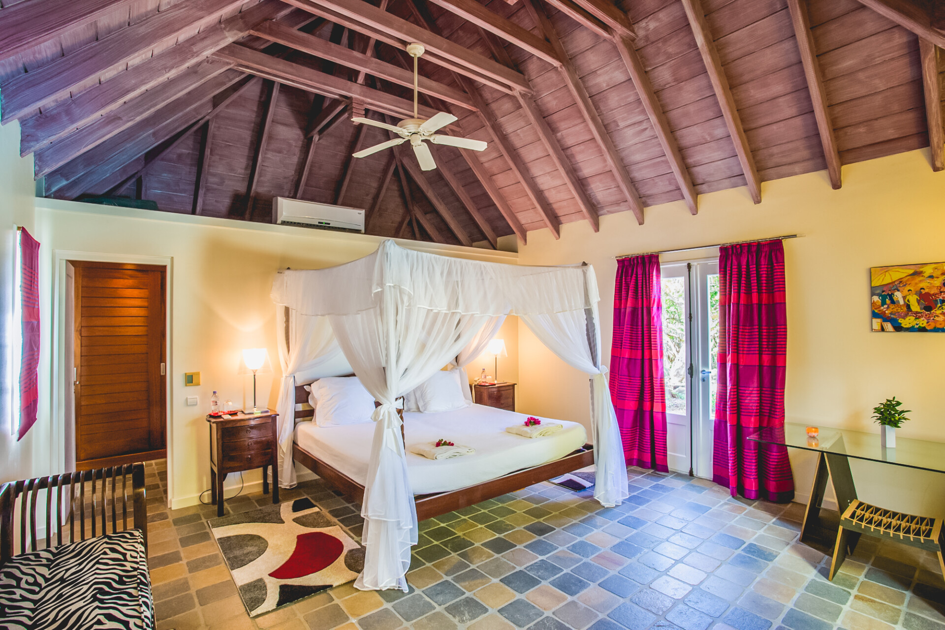 The feeling is traditional Caribbean, with soaring vaulted ceilings, dark wood and just a little judiciously deployed gingerbread, and dreamy four-poster beds draped with romantic netting. There’s an abundance of light and space, with windows on every side and an open floorplan in which the living room flows into the dining room flows into the spacious, well-equipped kitchen and dining patio, complete with a bar and pass-through window into the kitchen. And the sunrise and sunset views are tremendous, from the pool deck, where chaises flank a half-oval heated (in high season) swimming pool and look out over the Atlantic, and from the separate sun deck, which has vistas over Marigot Bay and St. Maarten in the distance.