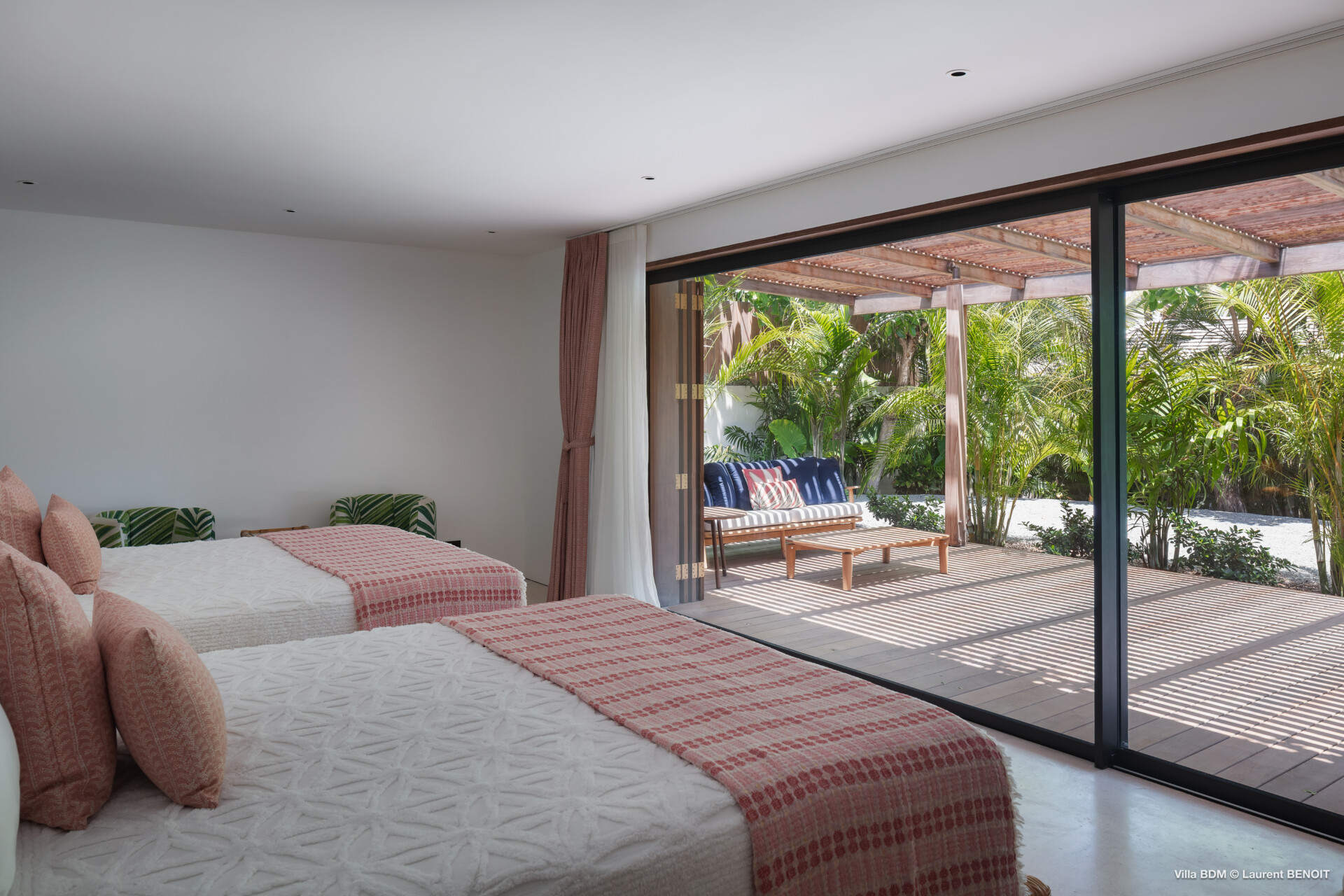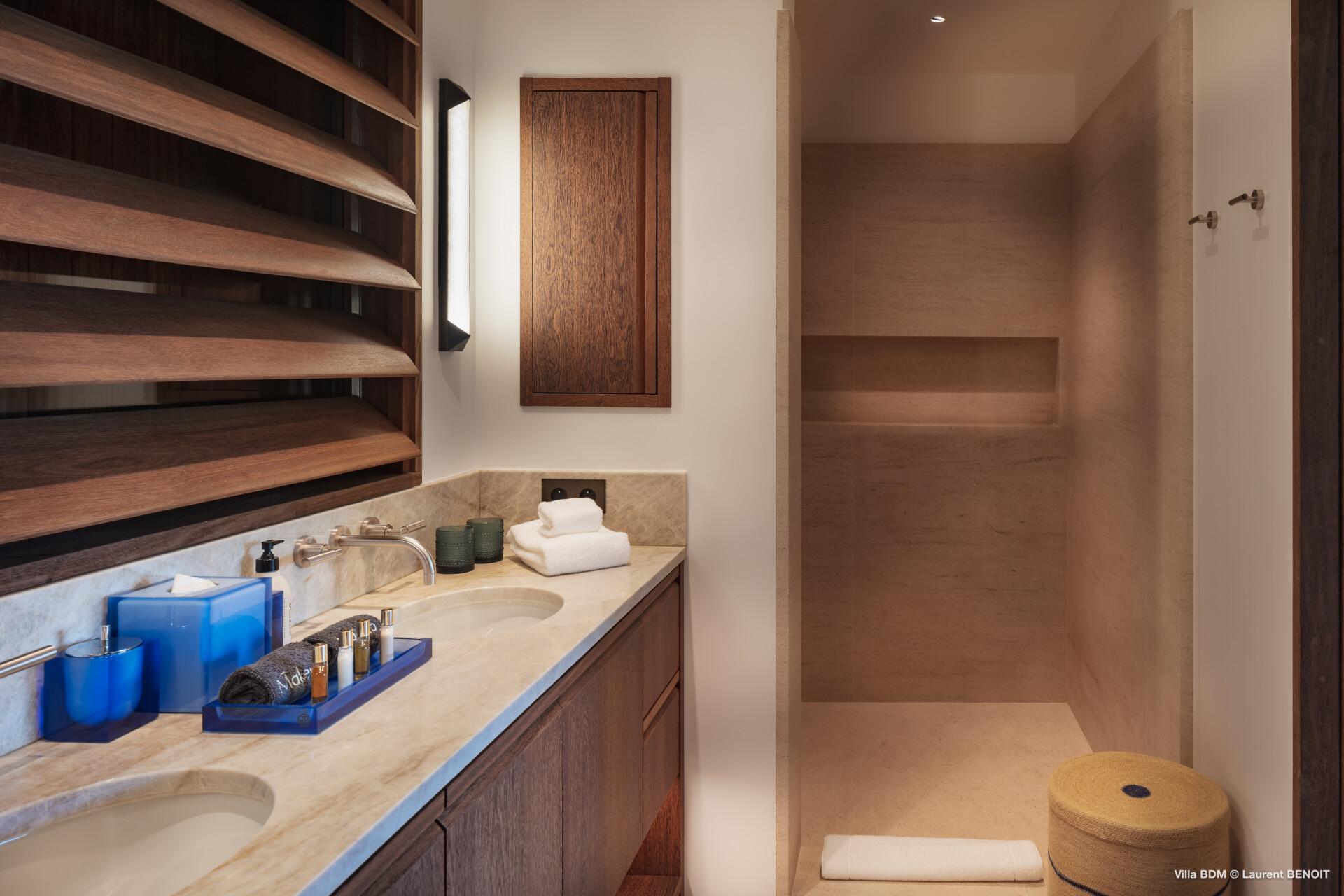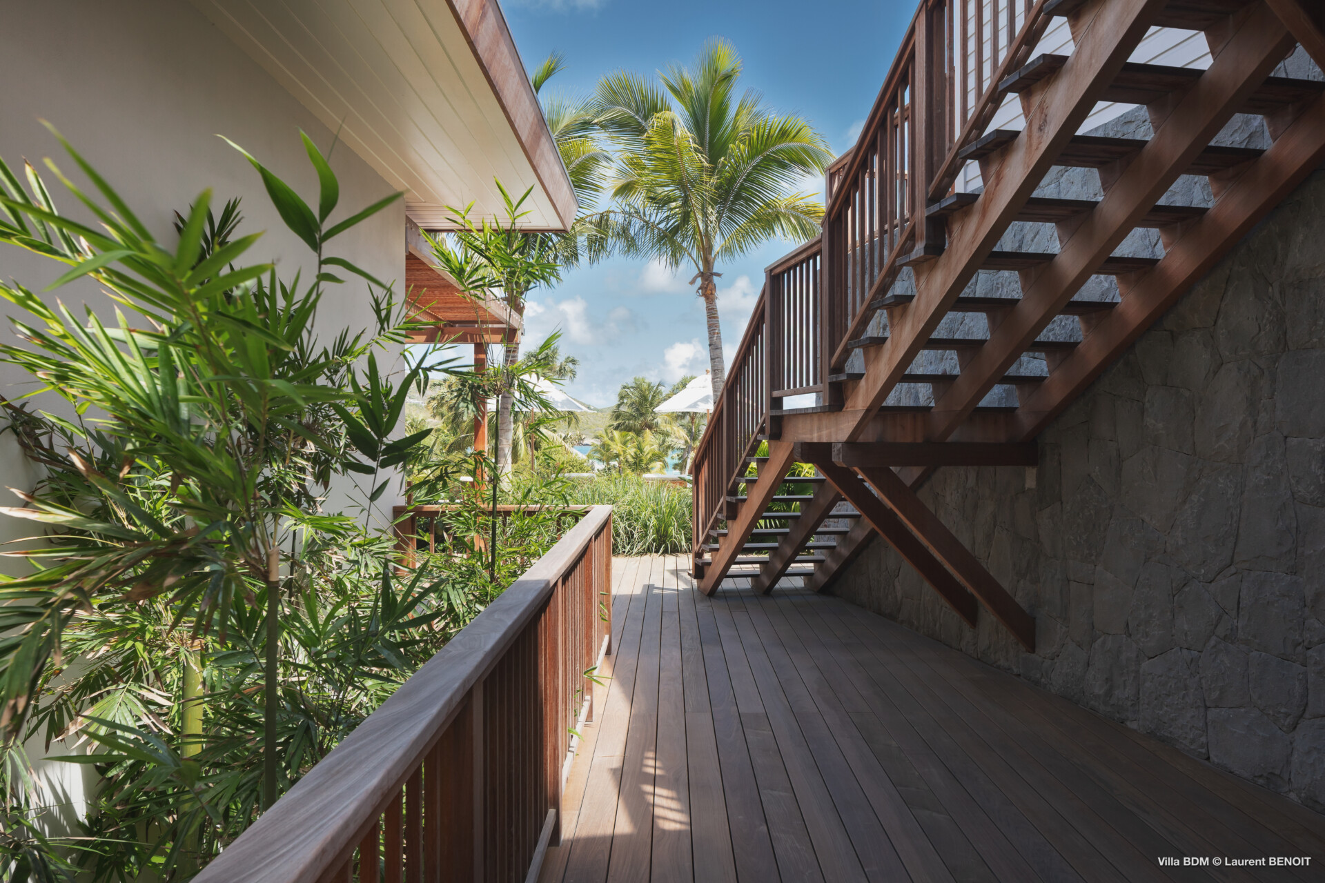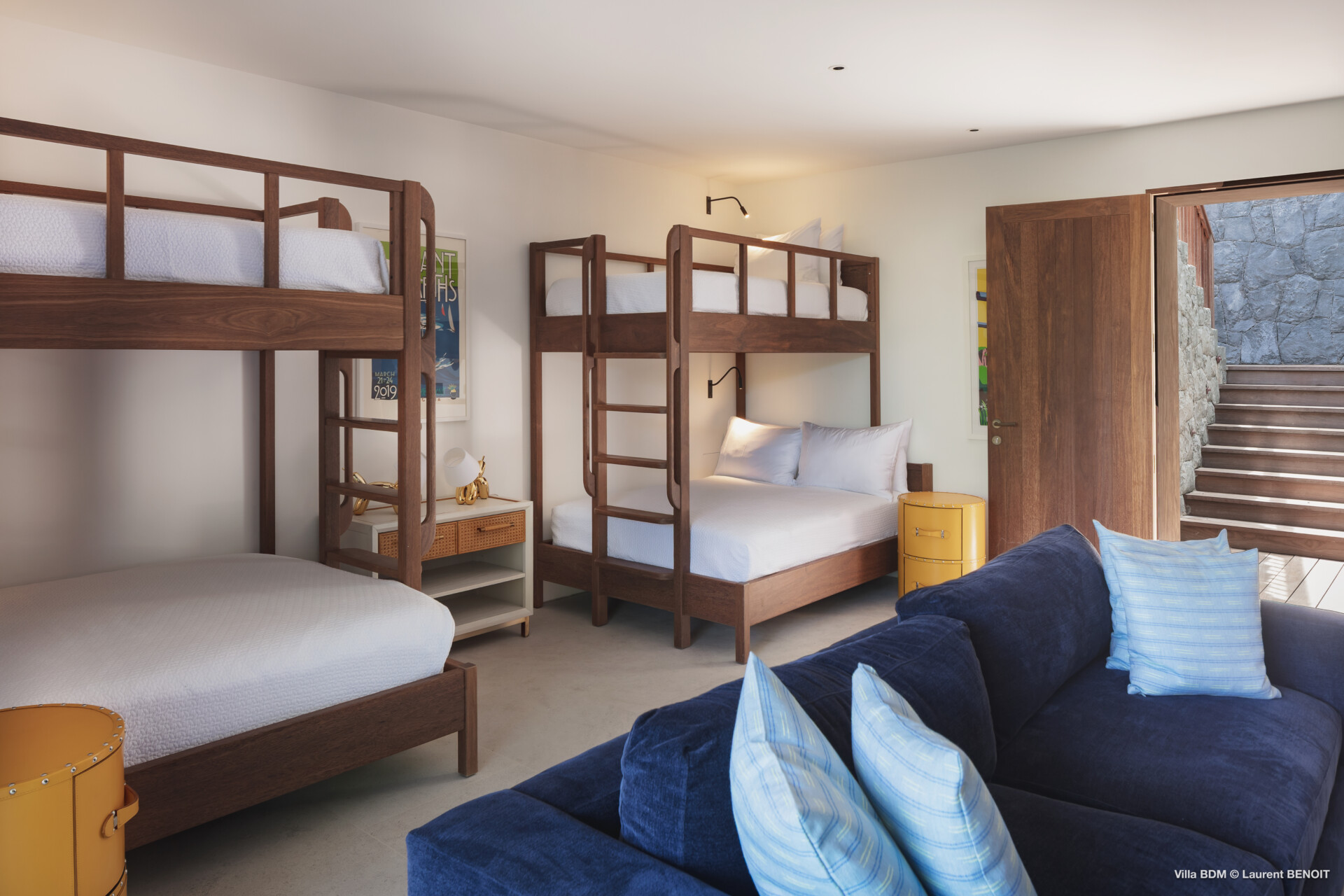 On the lower level, two additional bedrooms extend the villa’s comfort – including one designed with two full beds. This floor also houses a well equipped fitness room and a dedicated massage room. A pétanque court, table football, and a ping pong table add a playful touch for families and friends. From here, a private path leads directly to Little St. Jean Beach.