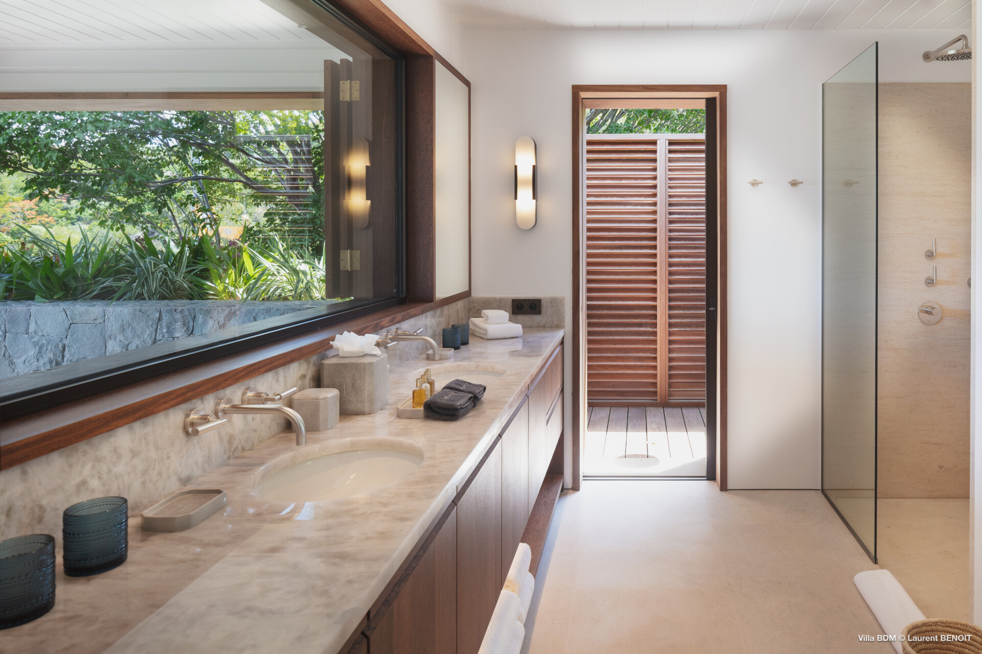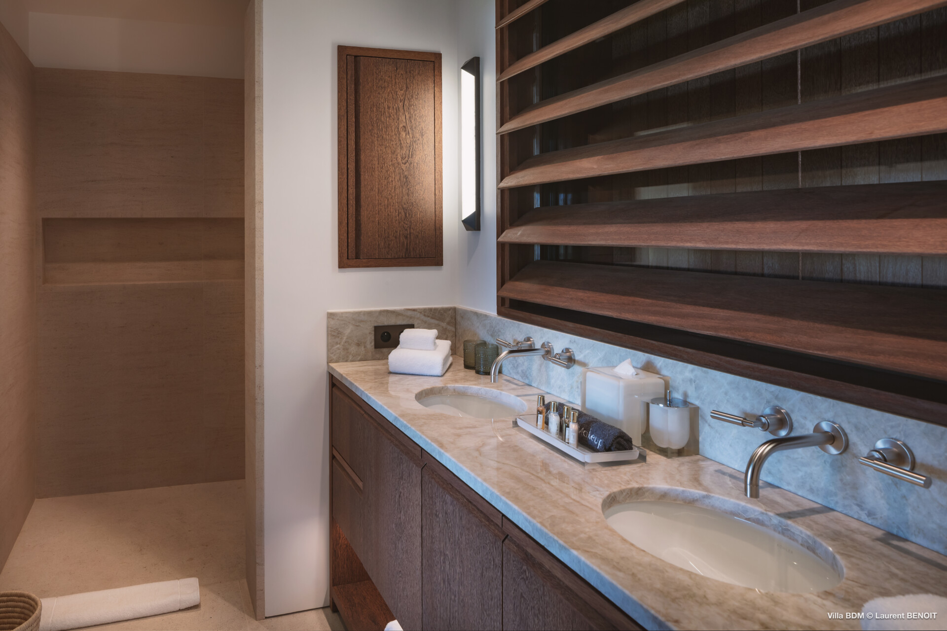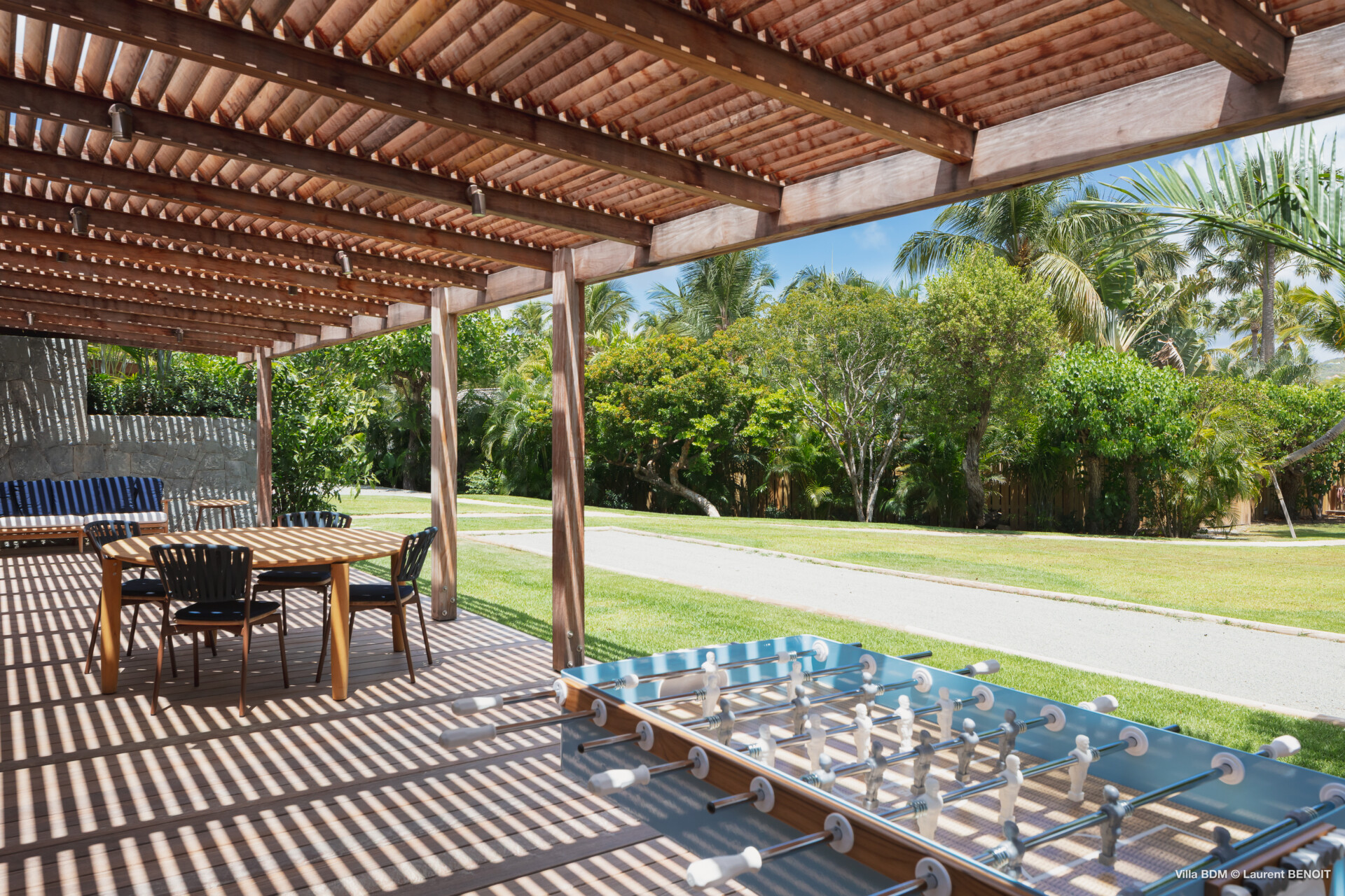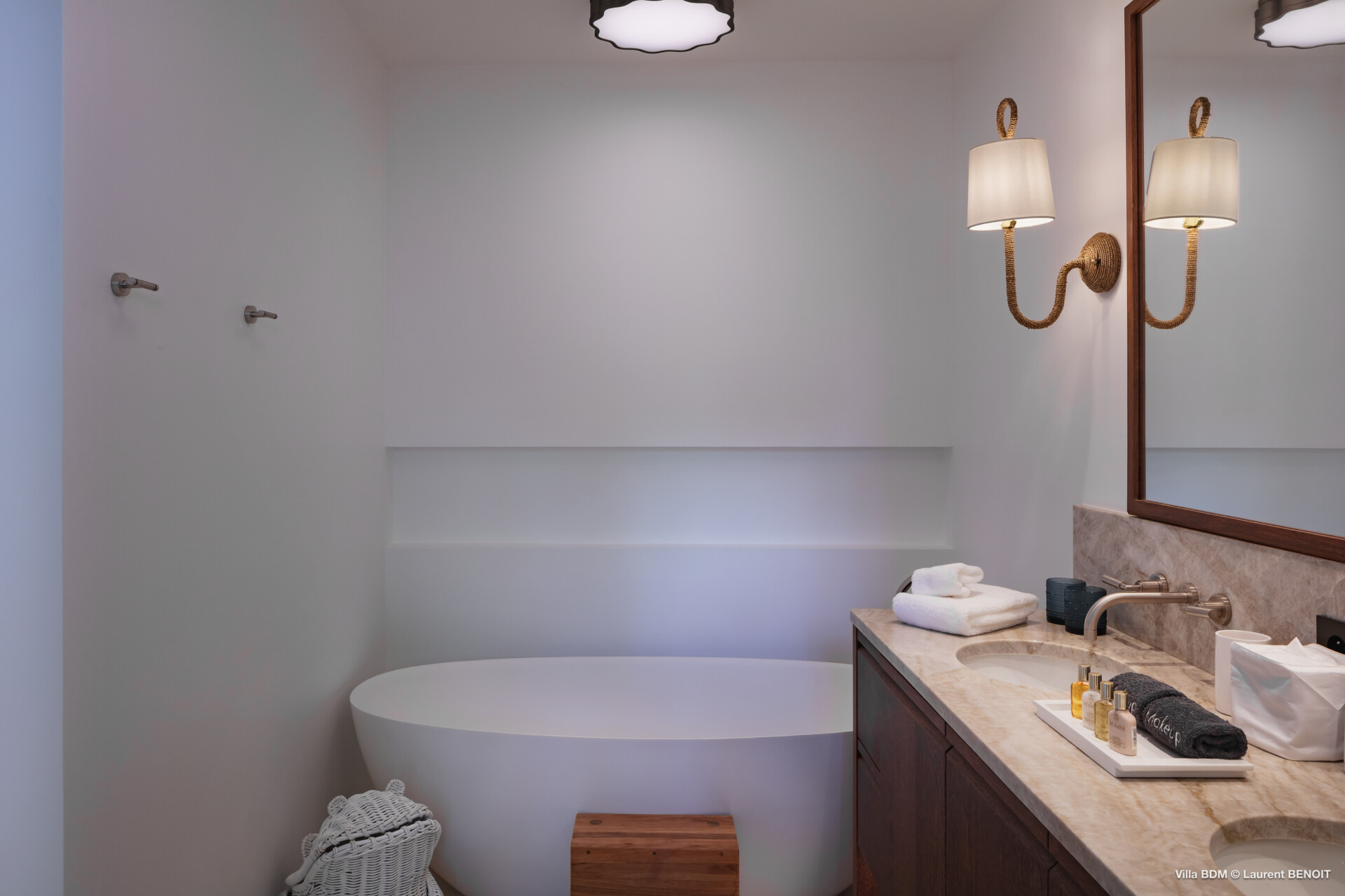 On the lower level, two additional bedrooms extend the villa’s comfort – including one designed with two full beds. This floor also houses a well equipped fitness room and a dedicated massage room. A pétanque court, table football, and a ping pong table add a playful touch for families and friends. From here, a private path leads directly to Little St. Jean Beach.