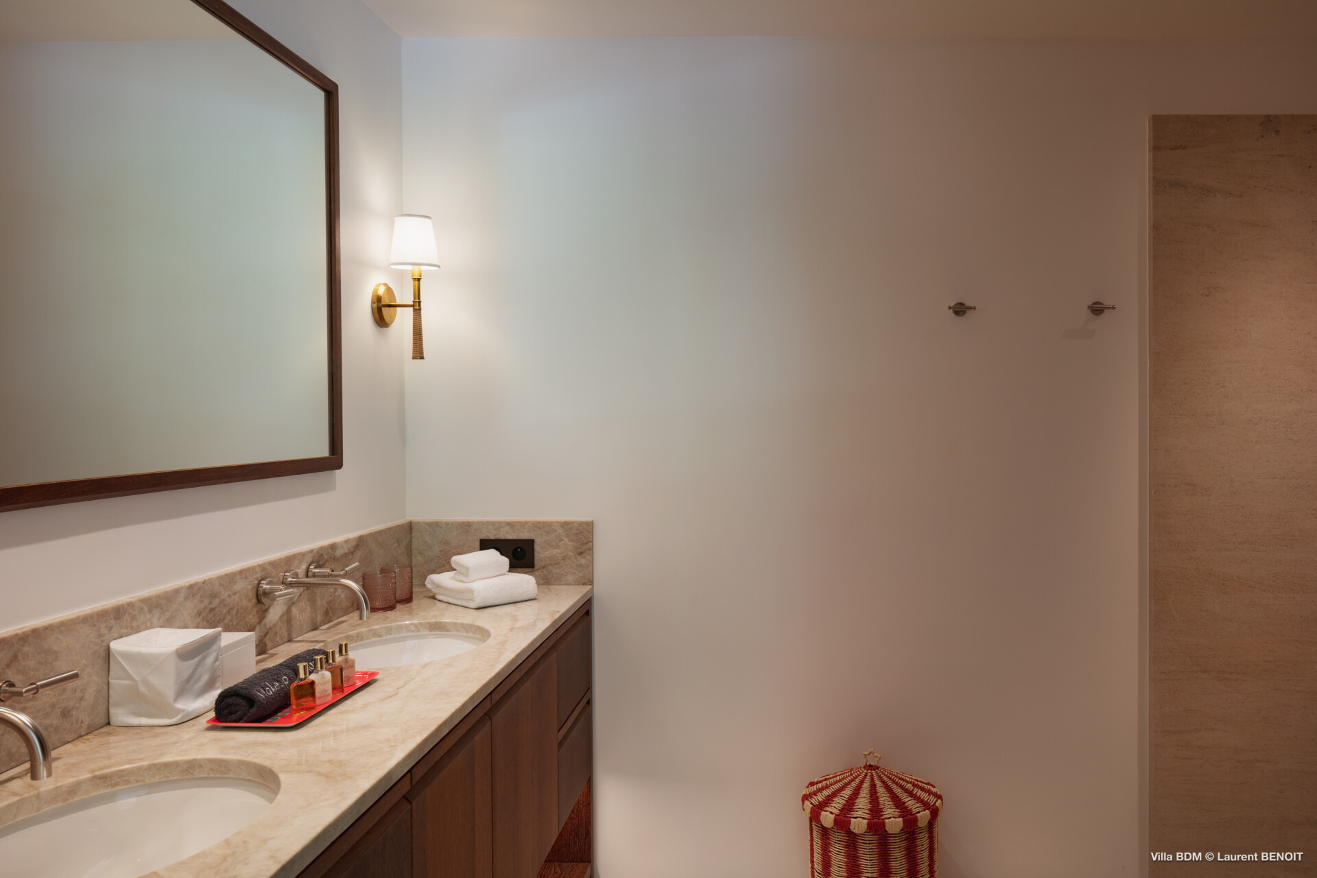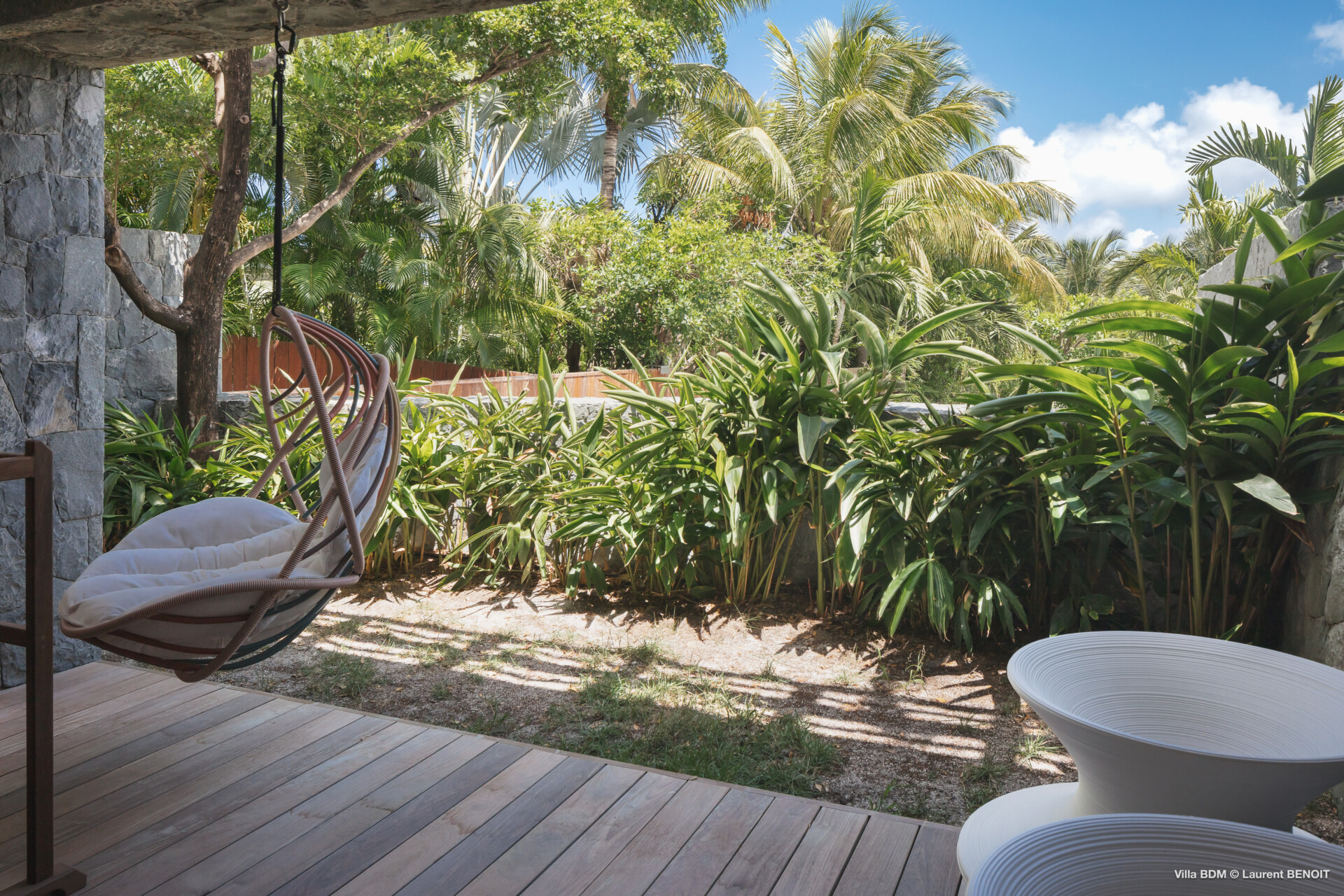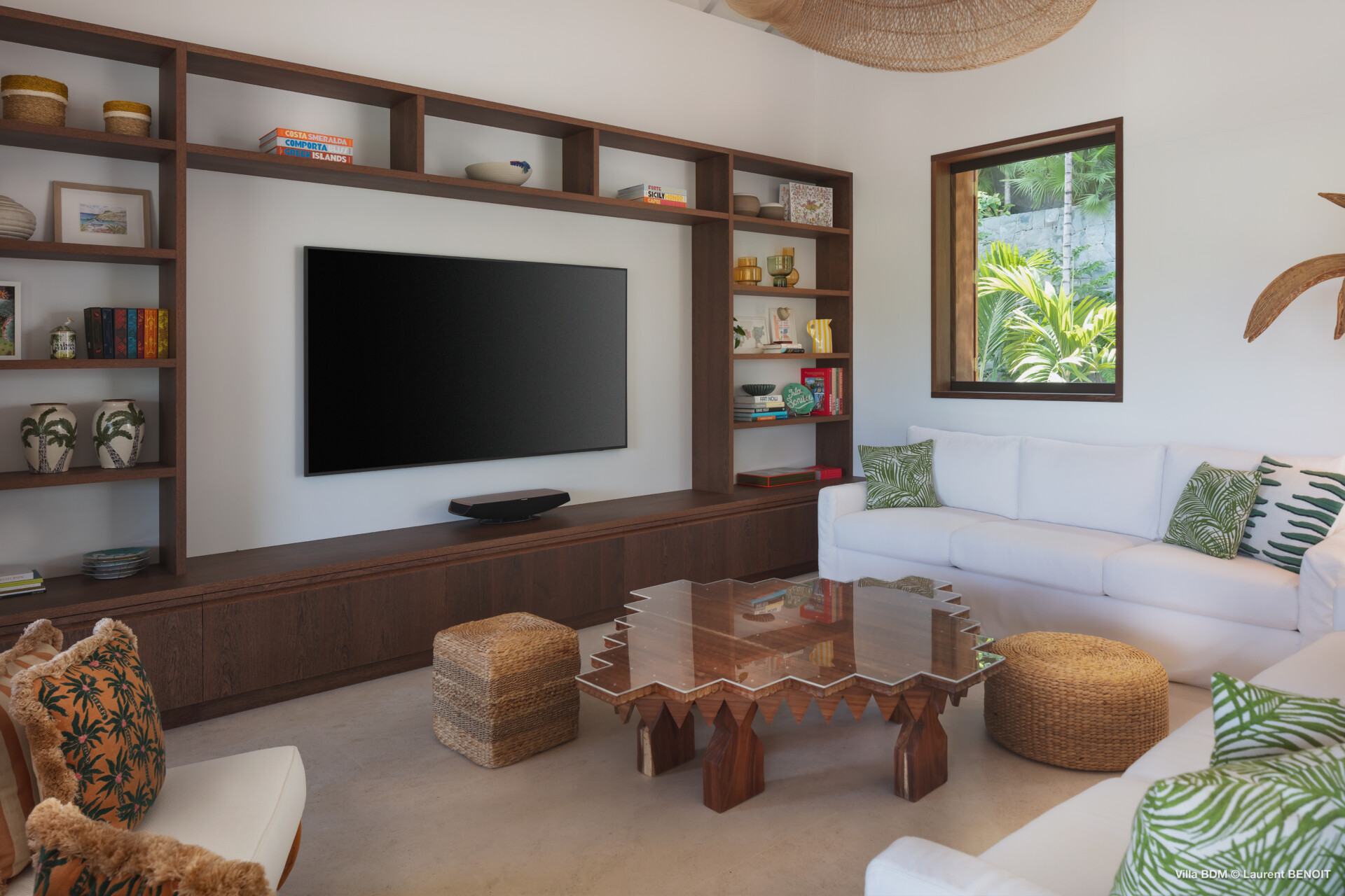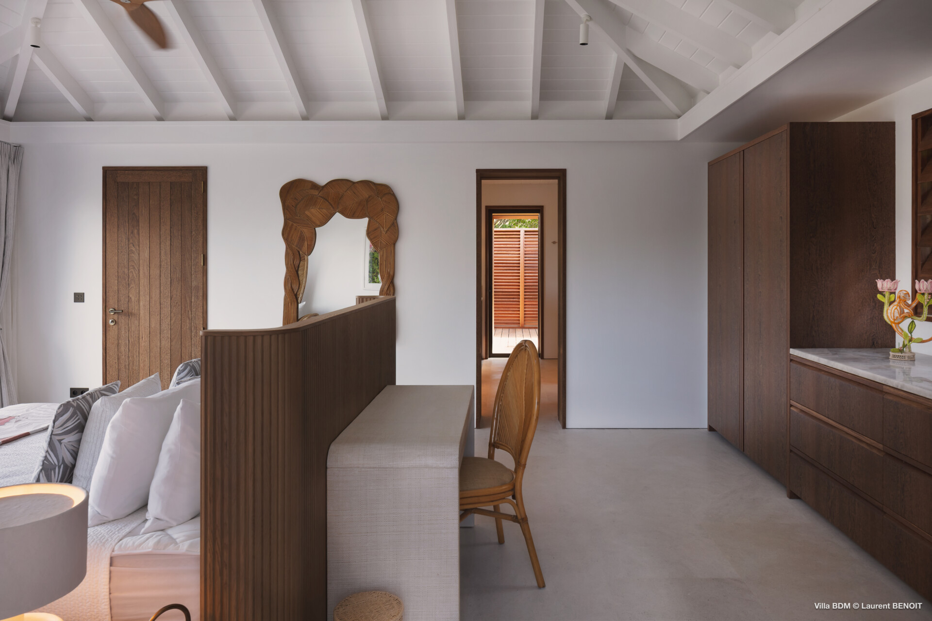 On the lower level, two additional bedrooms extend the villa’s comfort – including one designed with two full beds. This floor also houses a well equipped fitness room and a dedicated massage room. A pétanque court, table football, and a ping pong table add a playful touch for families and friends. From here, a private path leads directly to Little St. Jean Beach.