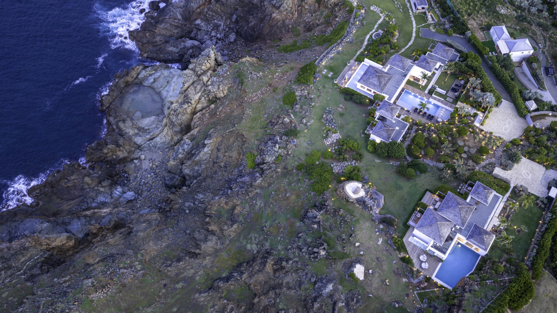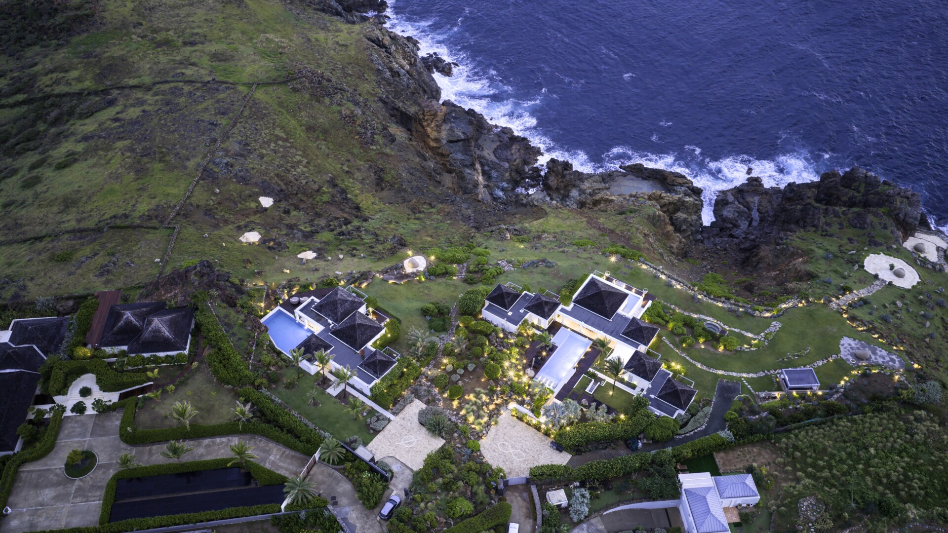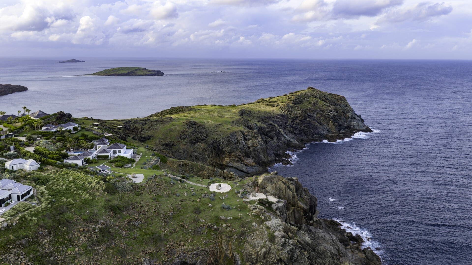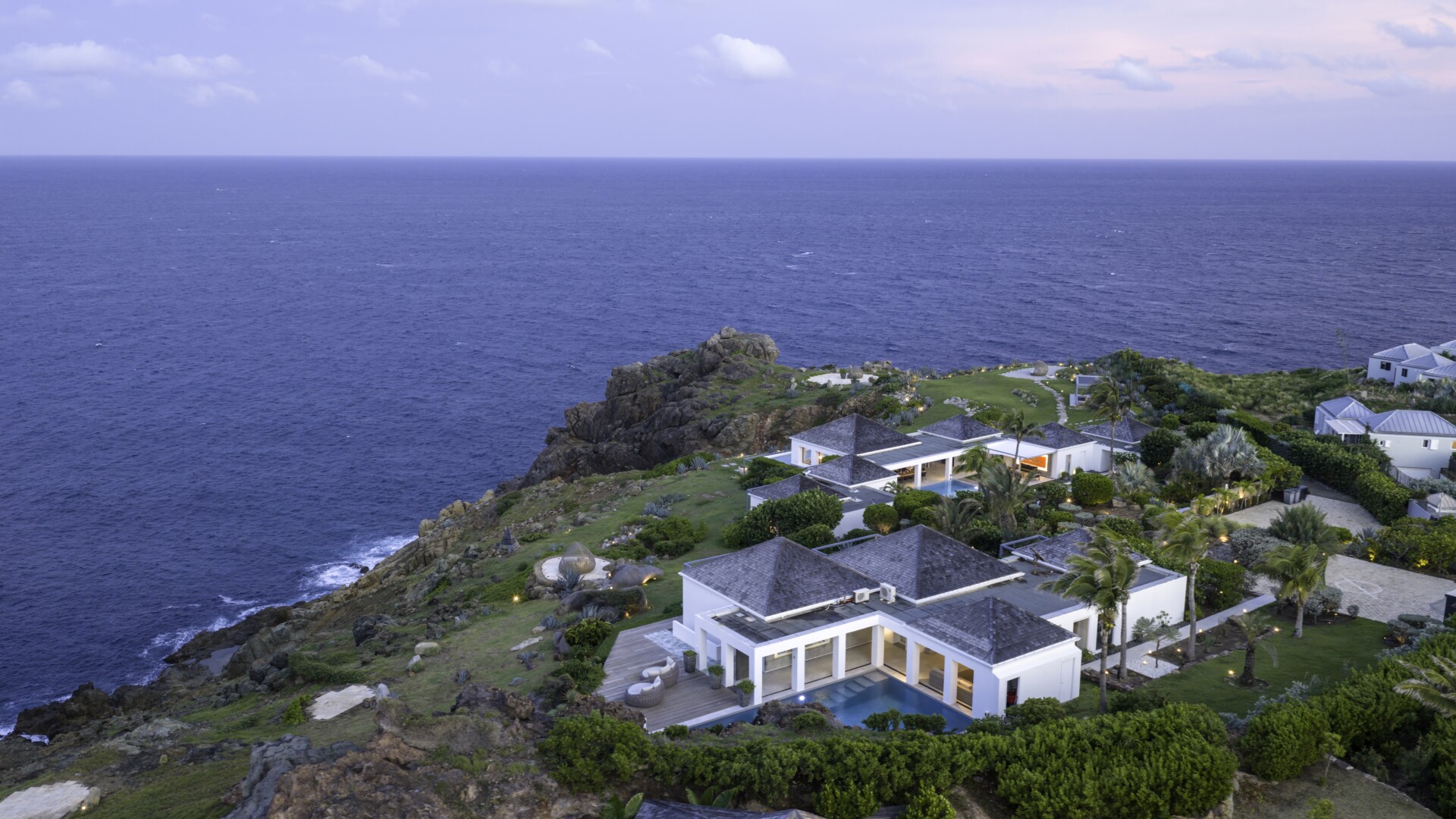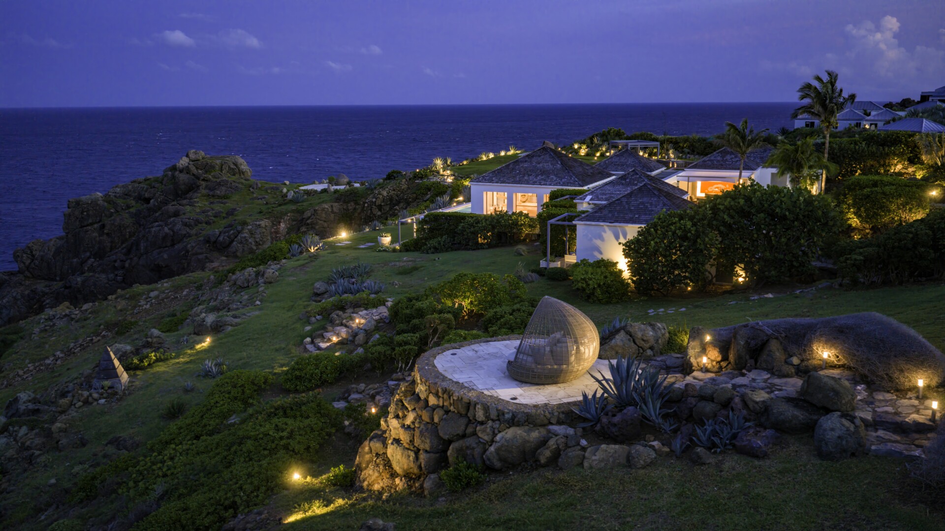 The remaining land is dotted with beautiful spots for sunbathing, gathering, dining and soaking up those incredible ocean views. Among them are a large outdoor pavilion for barbecues and other cliff-side dining—Sibarth’s concierge can stock your refrigerator, or hire one of the island’s top private chefs—and an eight-person stone Jacuzzi with spectacular sea views. Two expansive sundecks (60 square meters and 70 square meters) are surrounded by beautiful landscaping and, or course, have unparalleled views.