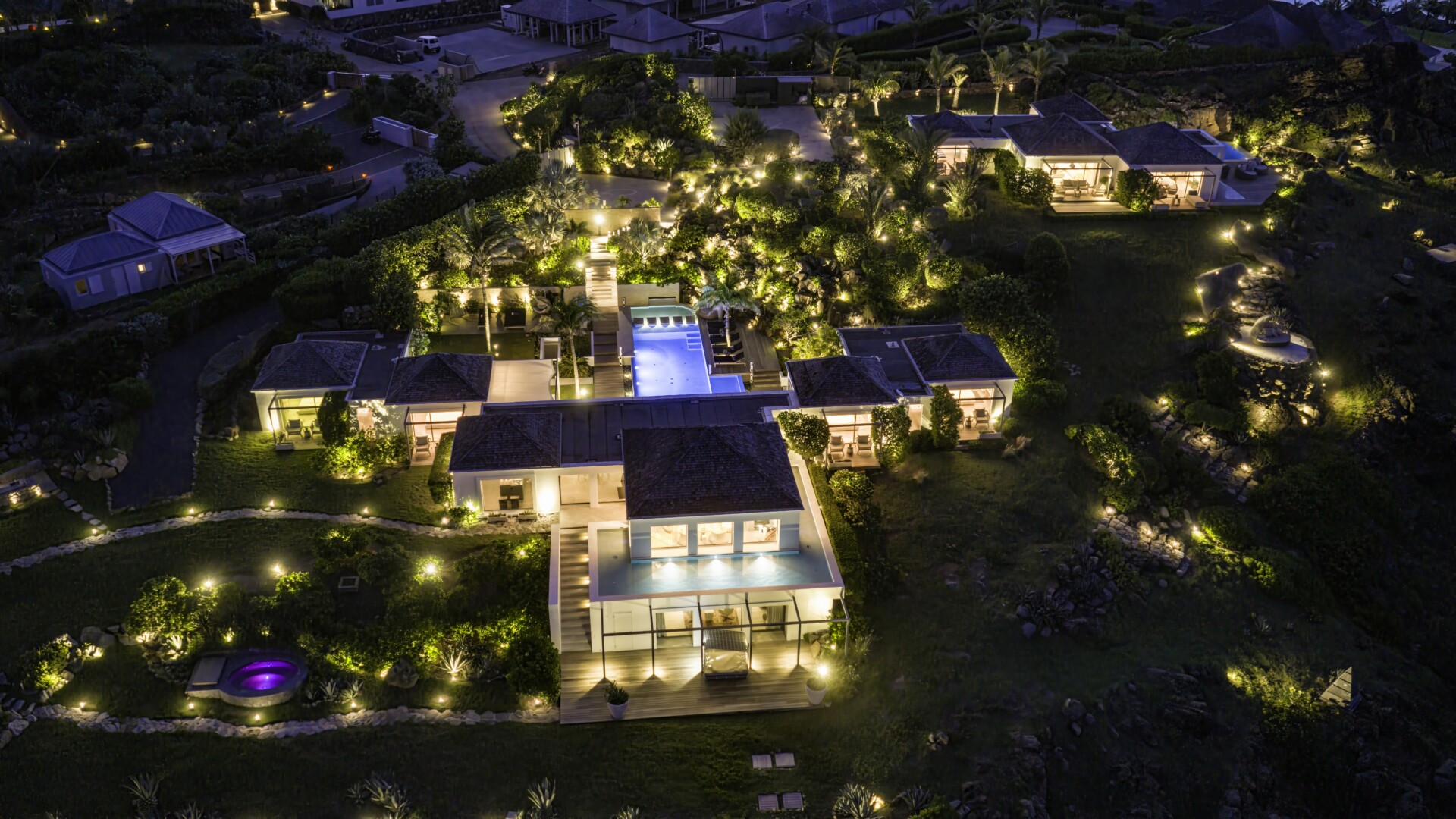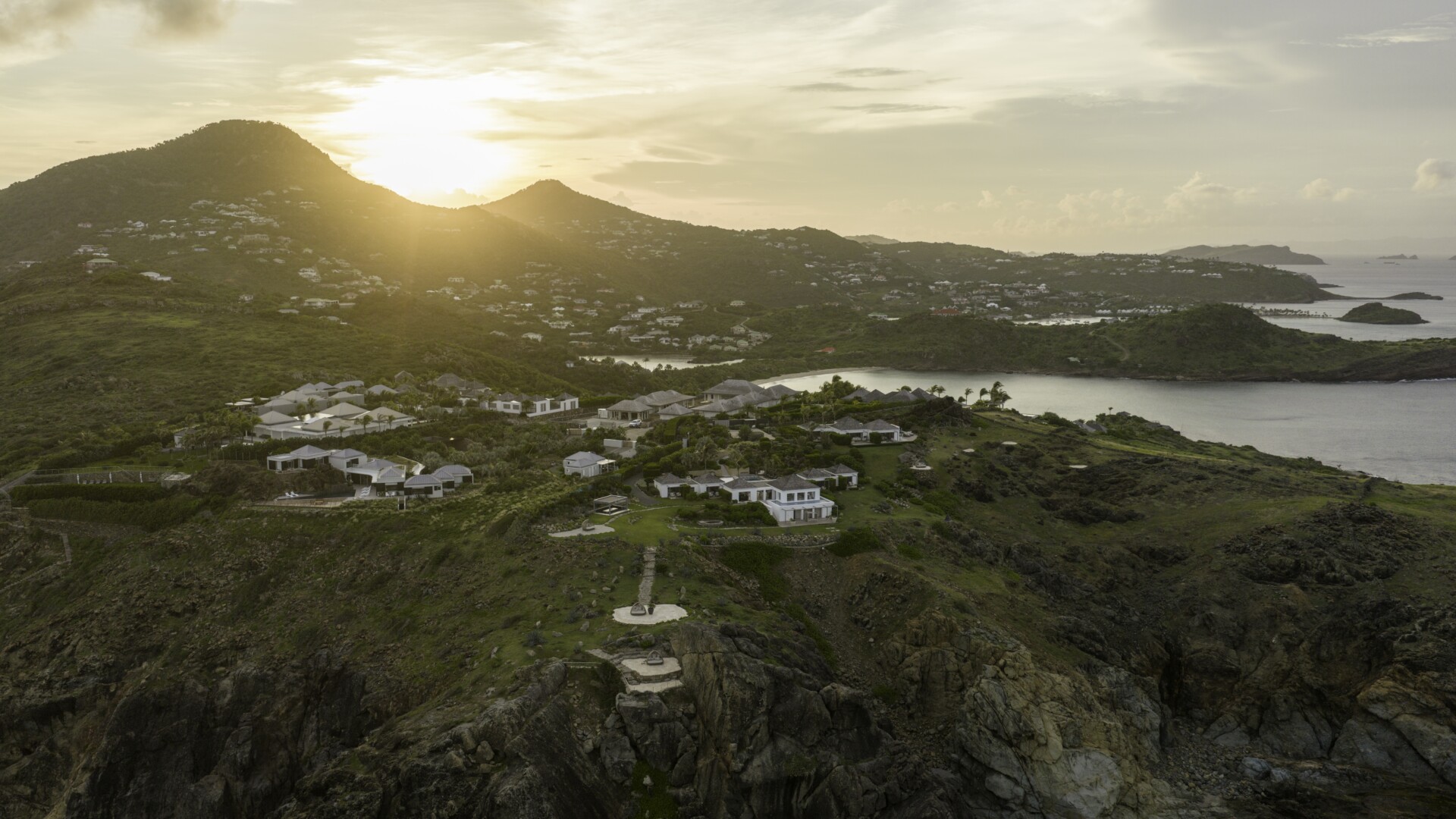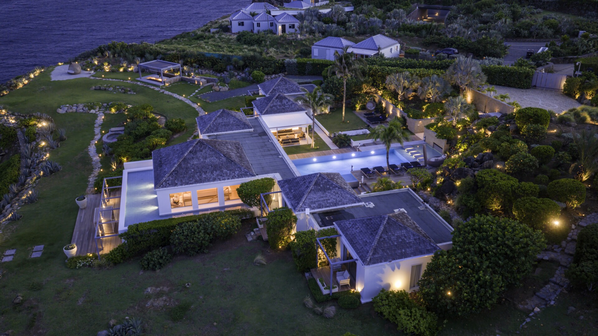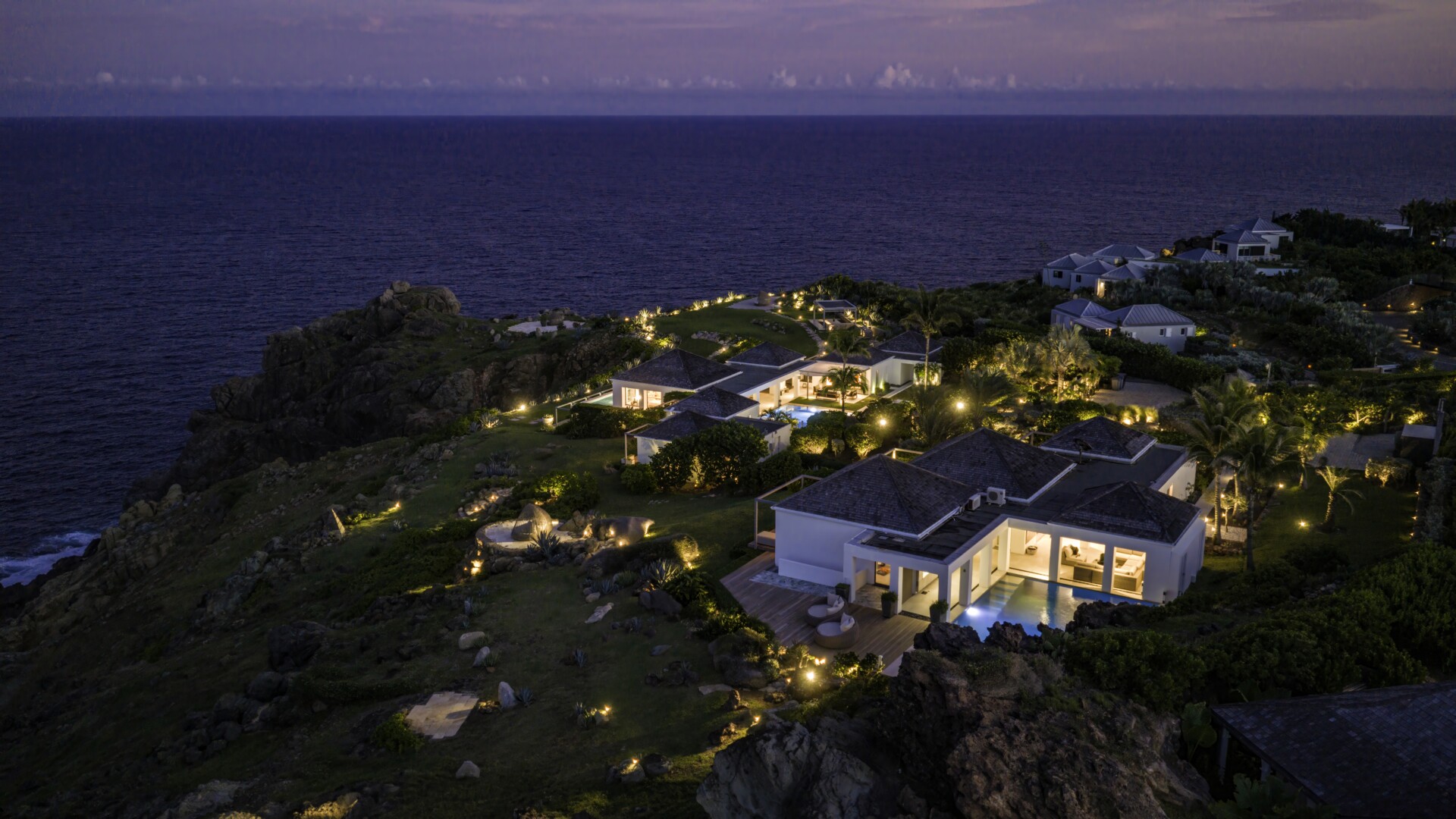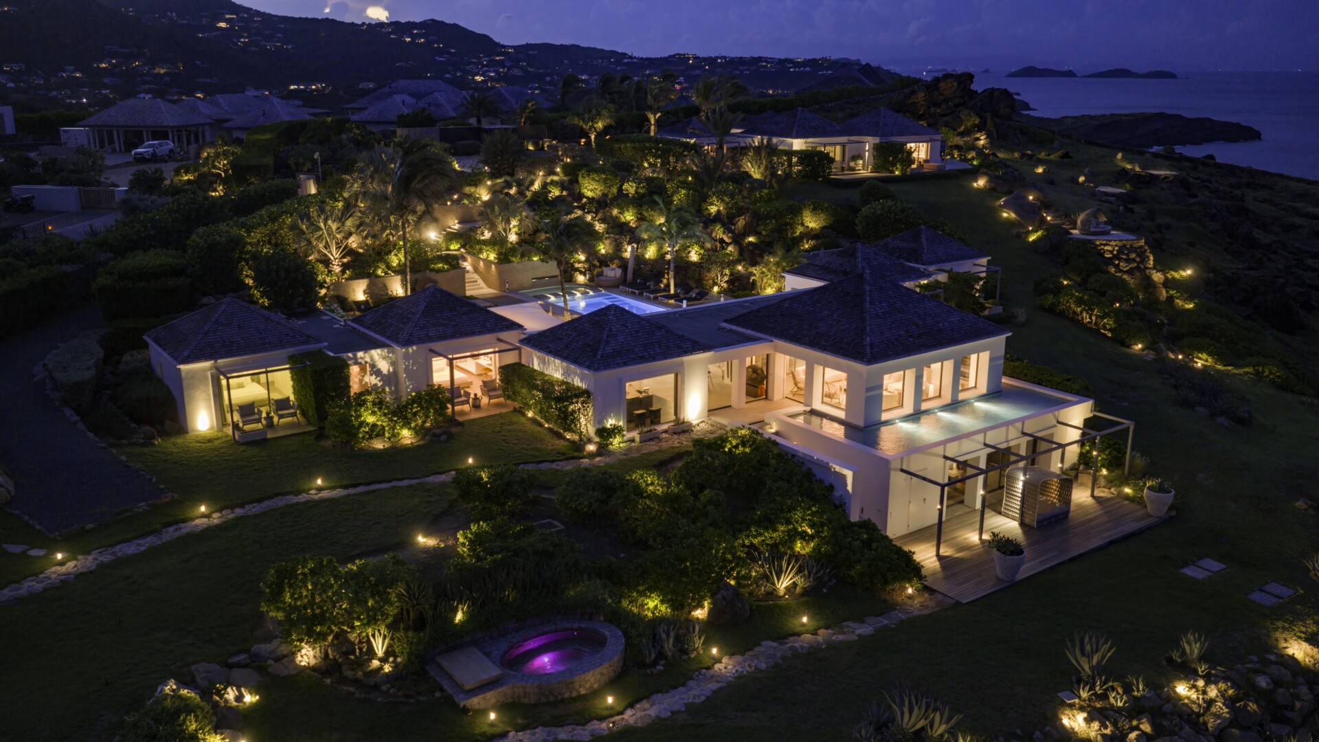The remaining land is dotted with beautiful spots for sunbathing, gathering, dining and soaking up those incredible ocean views. Among them are a large outdoor pavilion for barbecues and other cliff-side dining—Sibarth’s concierge can stock your refrigerator, or hire one of the island’s top private chefs—and an eight-person stone Jacuzzi with spectacular sea views. Two expansive sundecks (60 square meters and 70 square meters) are surrounded by beautiful landscaping and, or course, have unparalleled views.