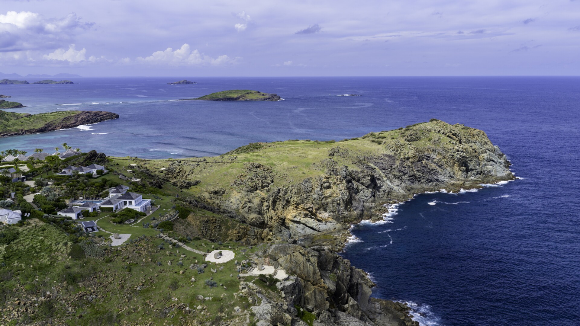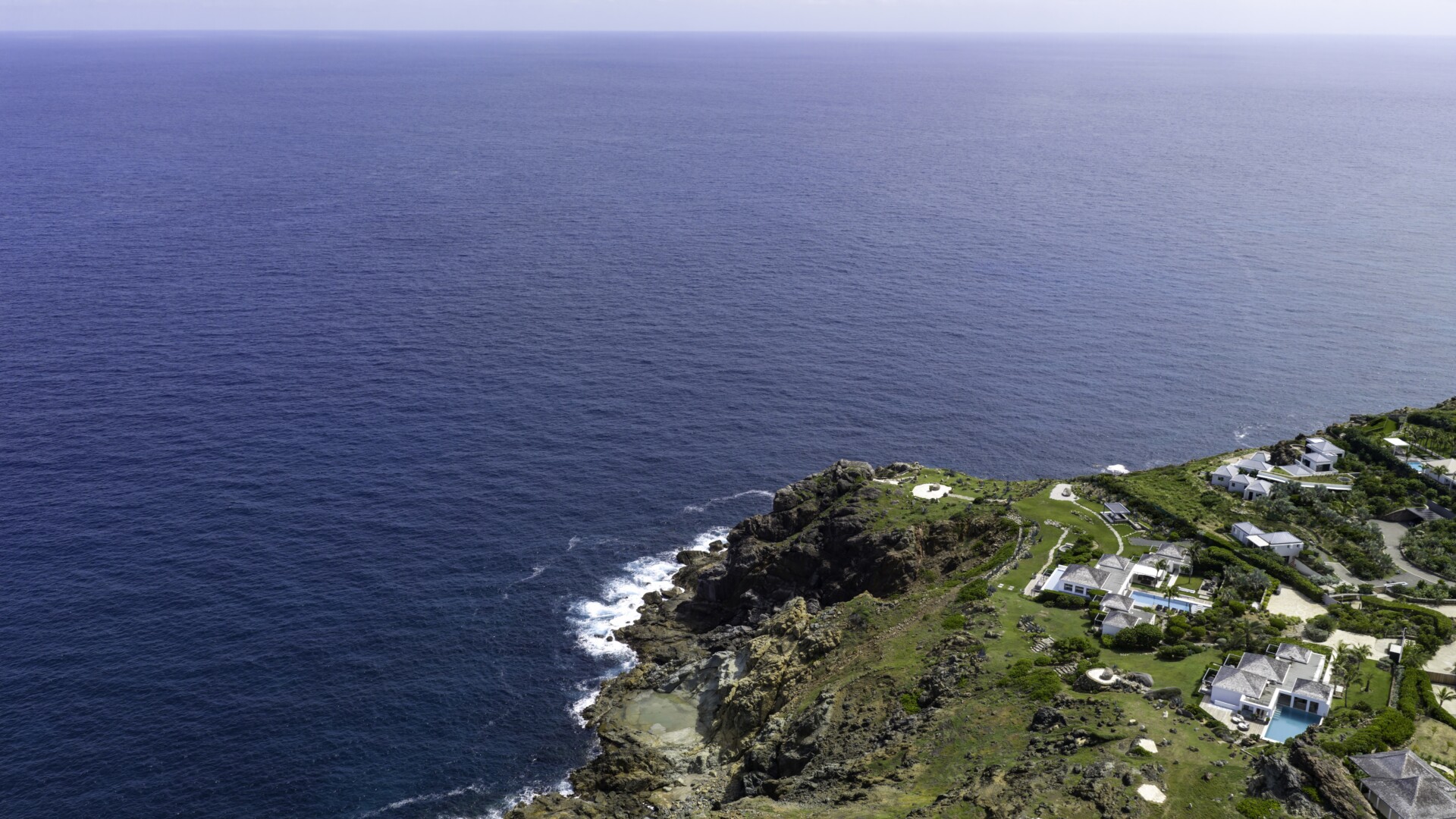 The shimmering blue ocean is the star at Villa Casa del Mar (CMA), which comprises of two connected villas in the Petit Cul de Sac area within the private Domaine du Levant community on the east side of St. Barth. The villas—which are perched at the edge of a promontory overlooking the sea below—are situated on two adjacent plots of land totaling approximately 3 hectares (7.5 acres), spanning from the Petit Cul de Sac rock beach all the way across to the cliff side of the Domaine du Levant. The size and expanse of the property, and the positioning of the villas on the lan, affords these luxury vacation homes unprecedented privacy, areas for walking and hiking (both on the property and on the adjacent 20 acres of green zone), and breathtaking bay and ocean views.