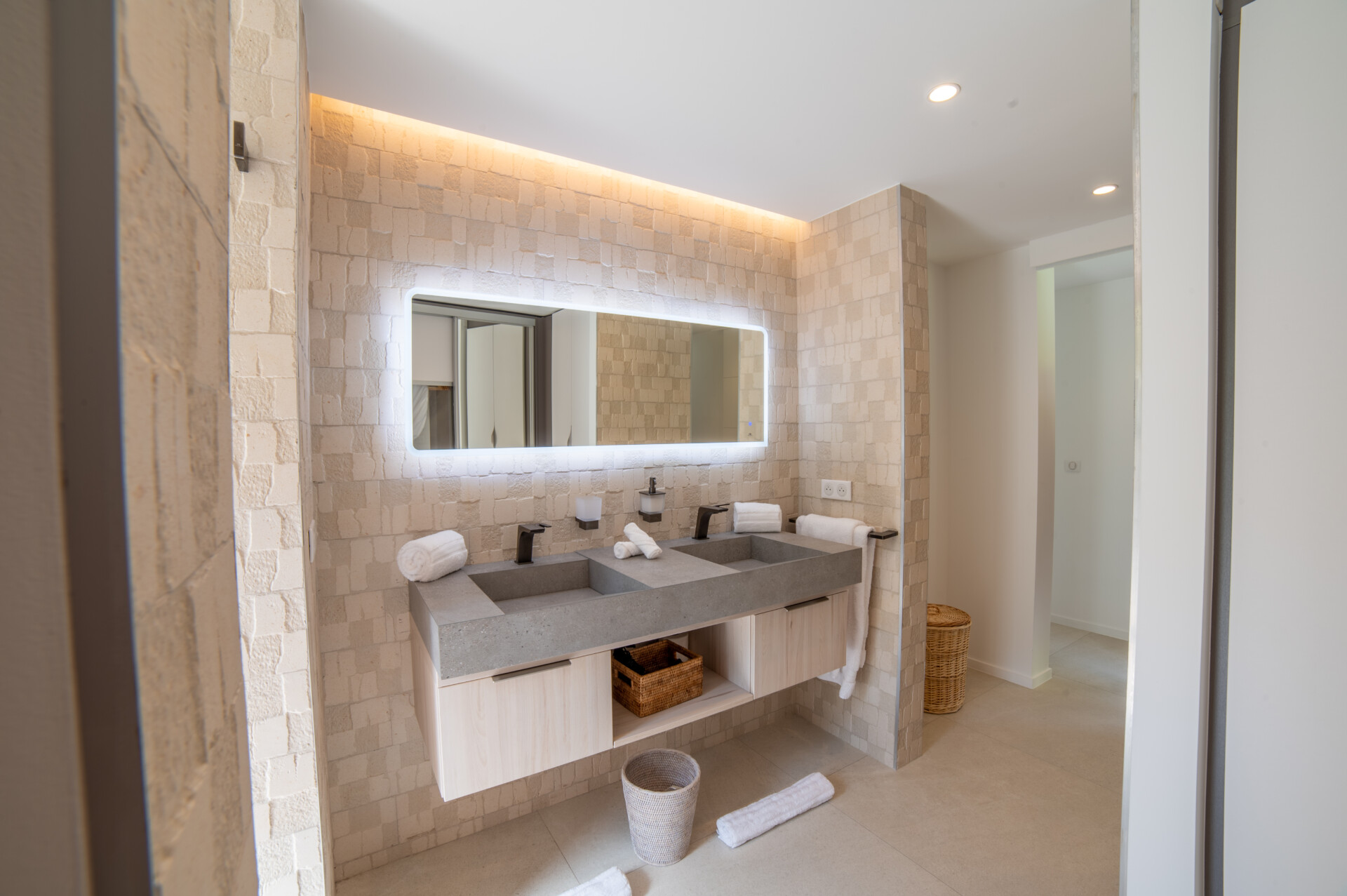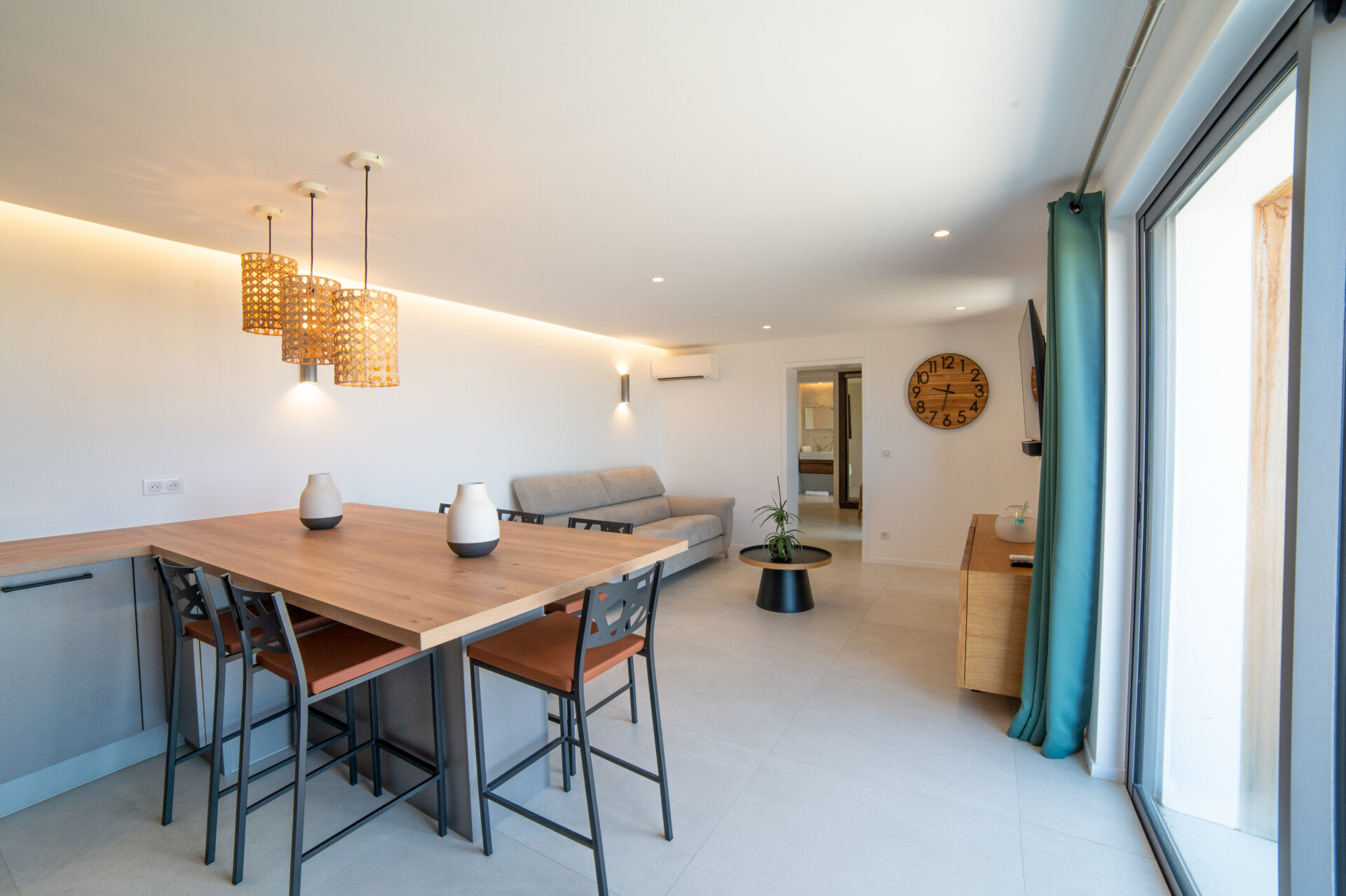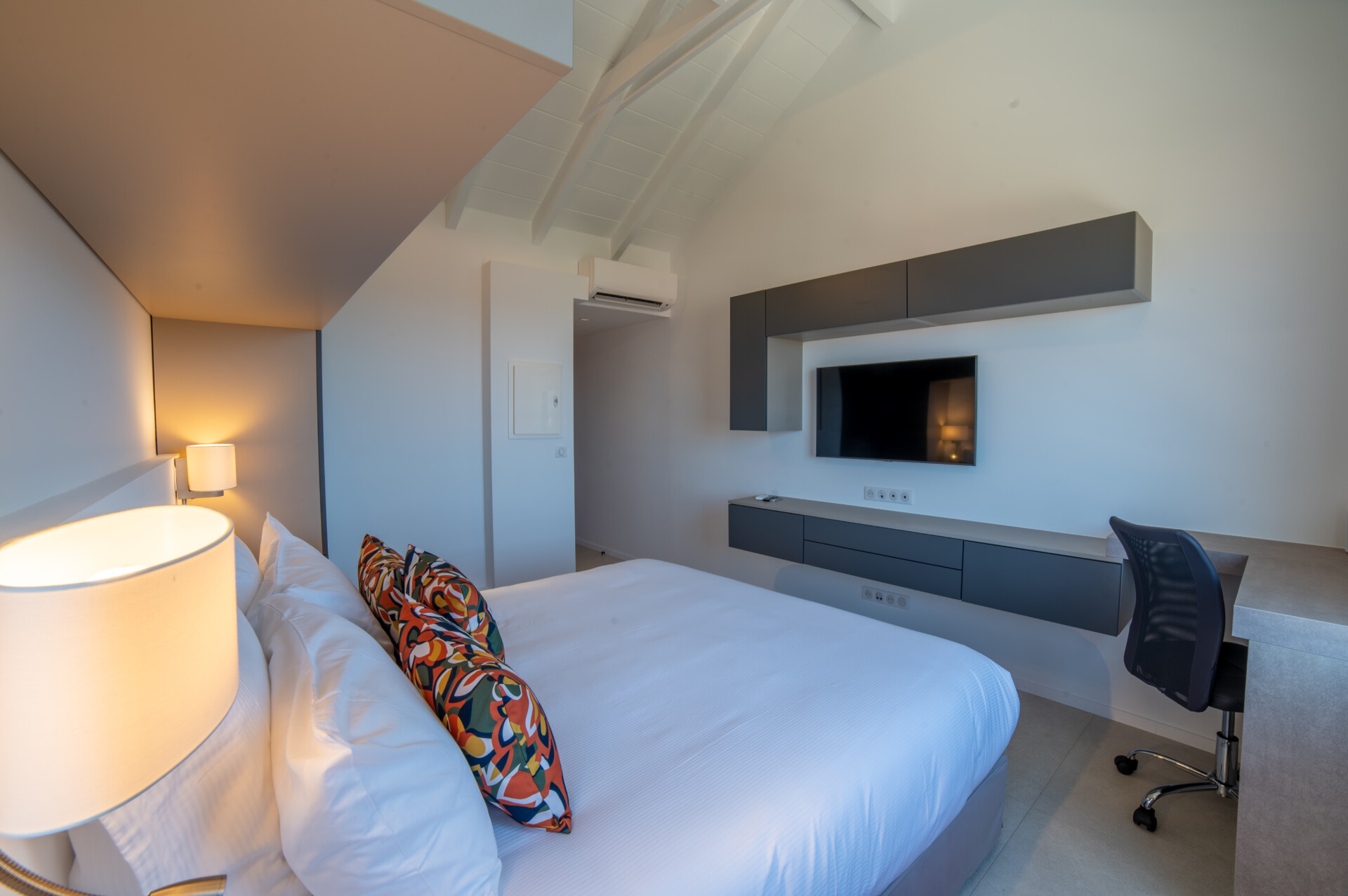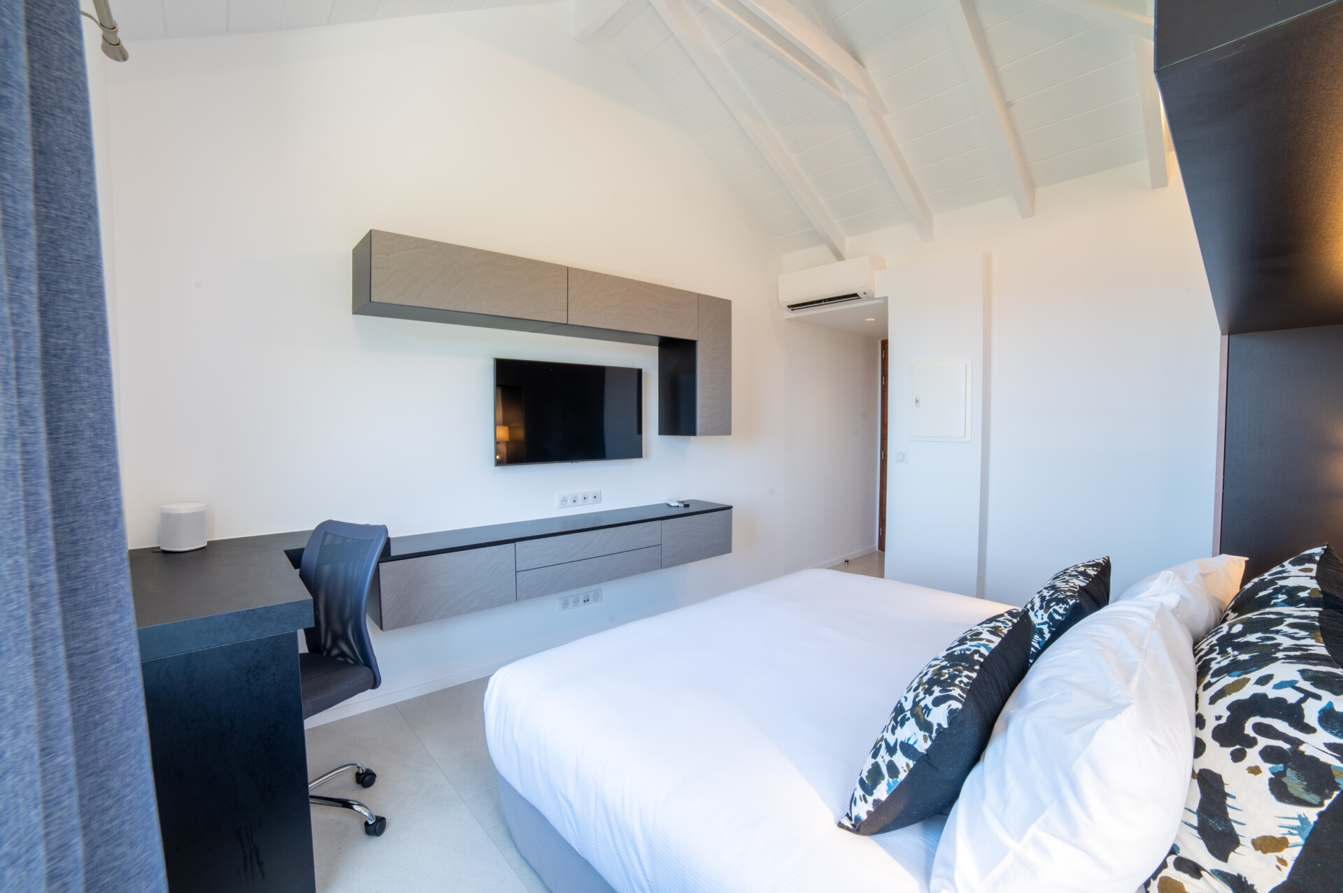 Designed for flexibility, the villa accommodates up to four bedrooms. Three are arranged close to the main living areas – air-conditioned, well-sized, and each with an ensuite. The fourth is a fully independent studio below, complete with its own kitchenette, living space, and garden access – ideal for guests seeking extra peace and privacy.