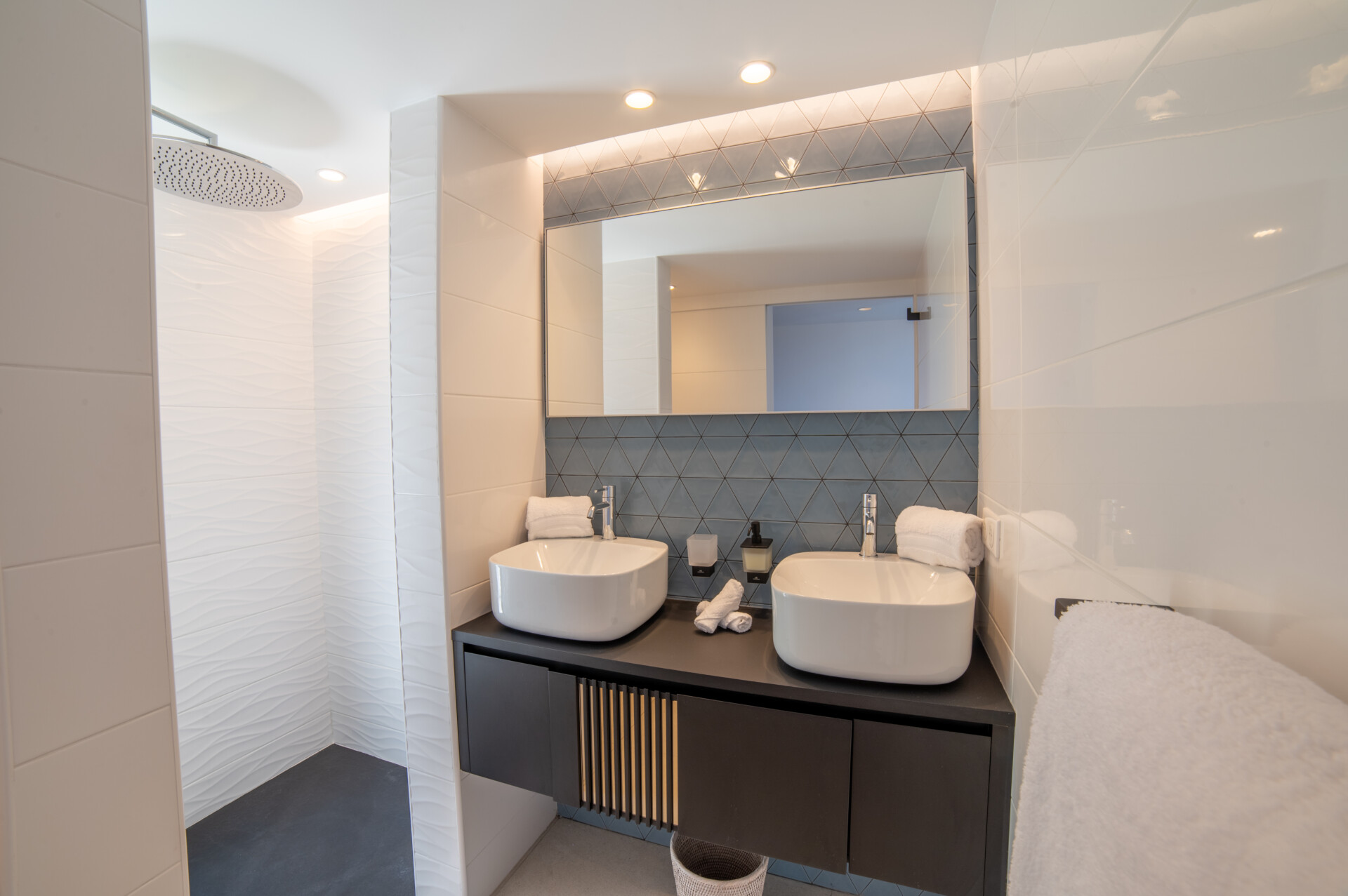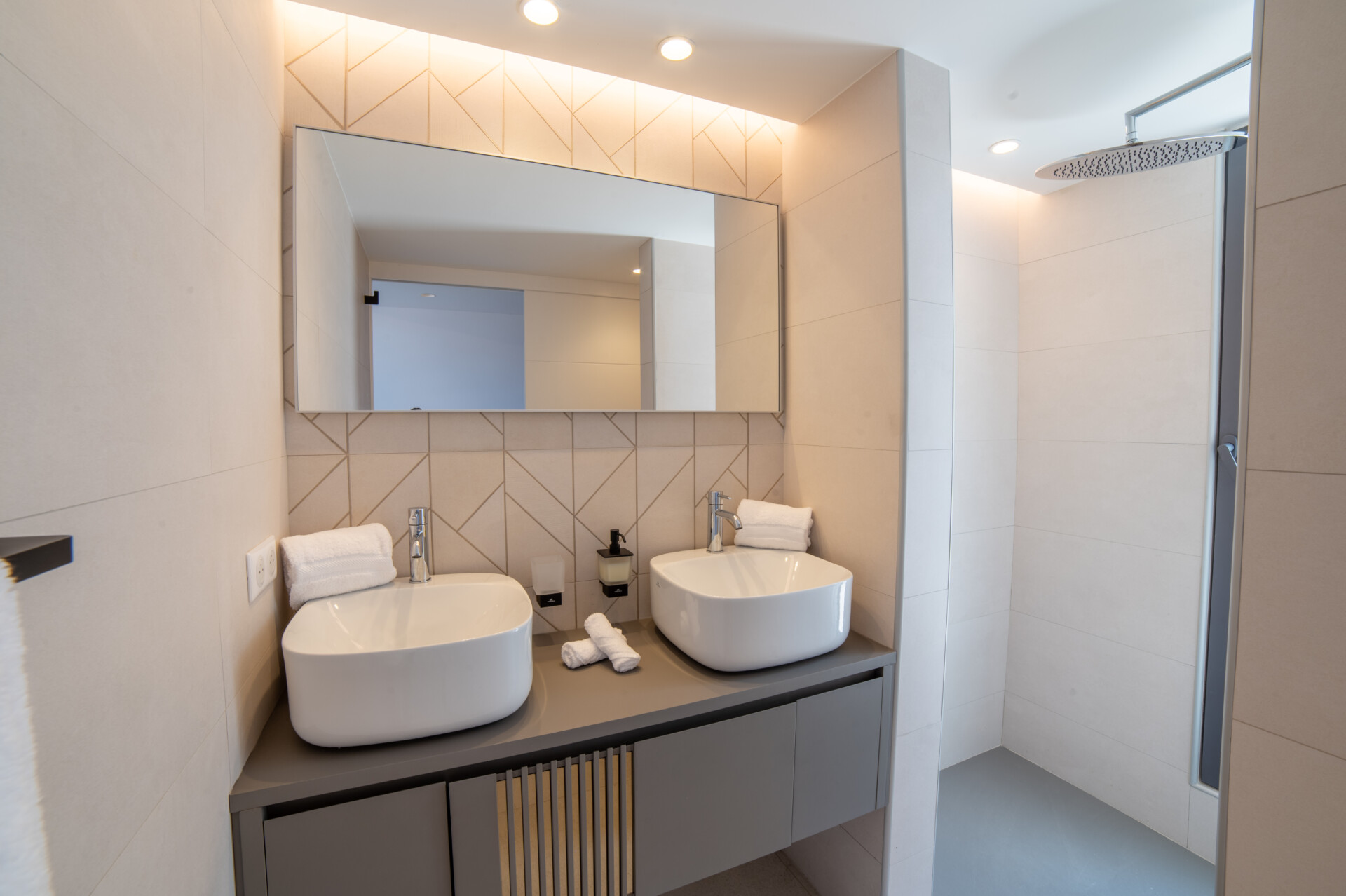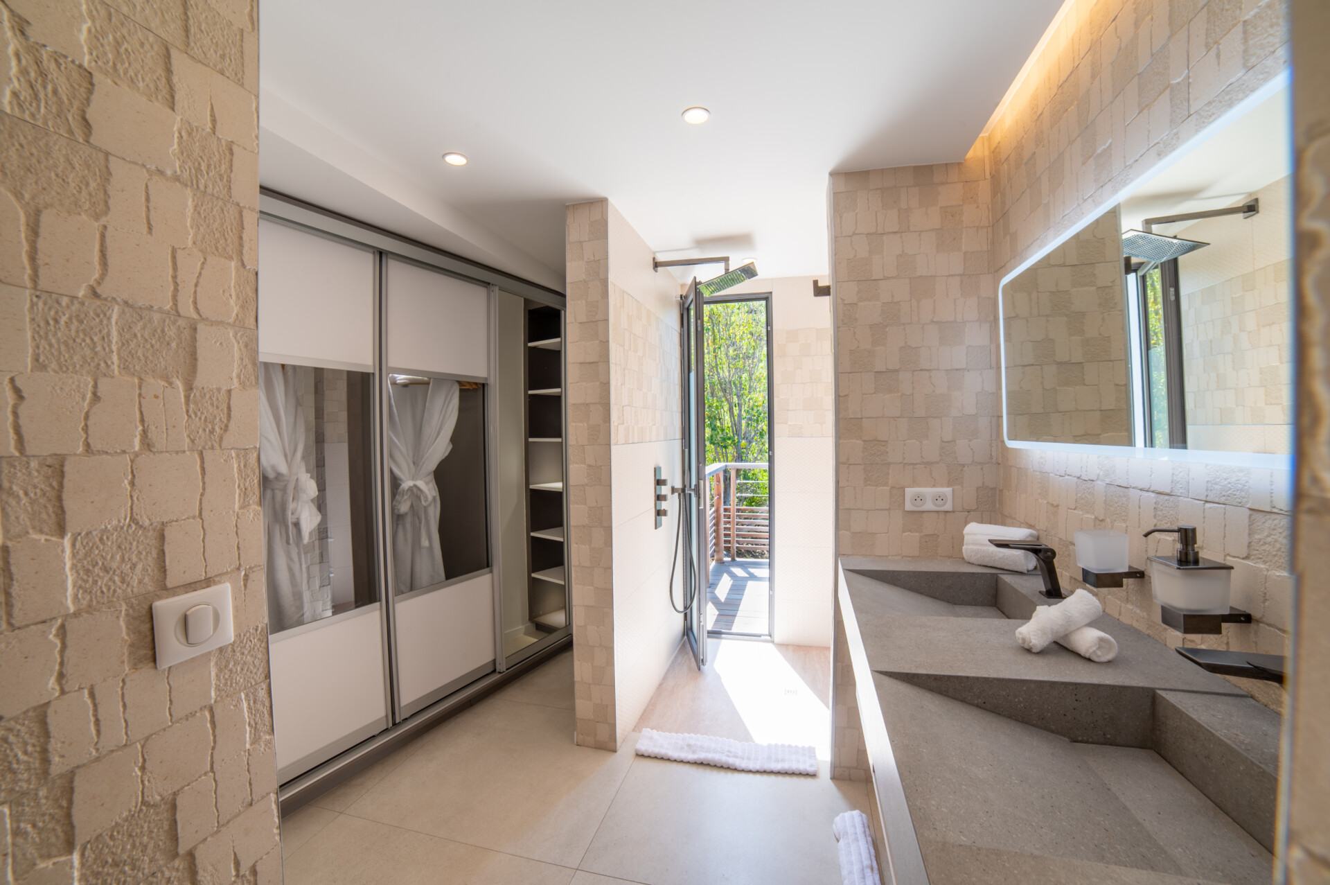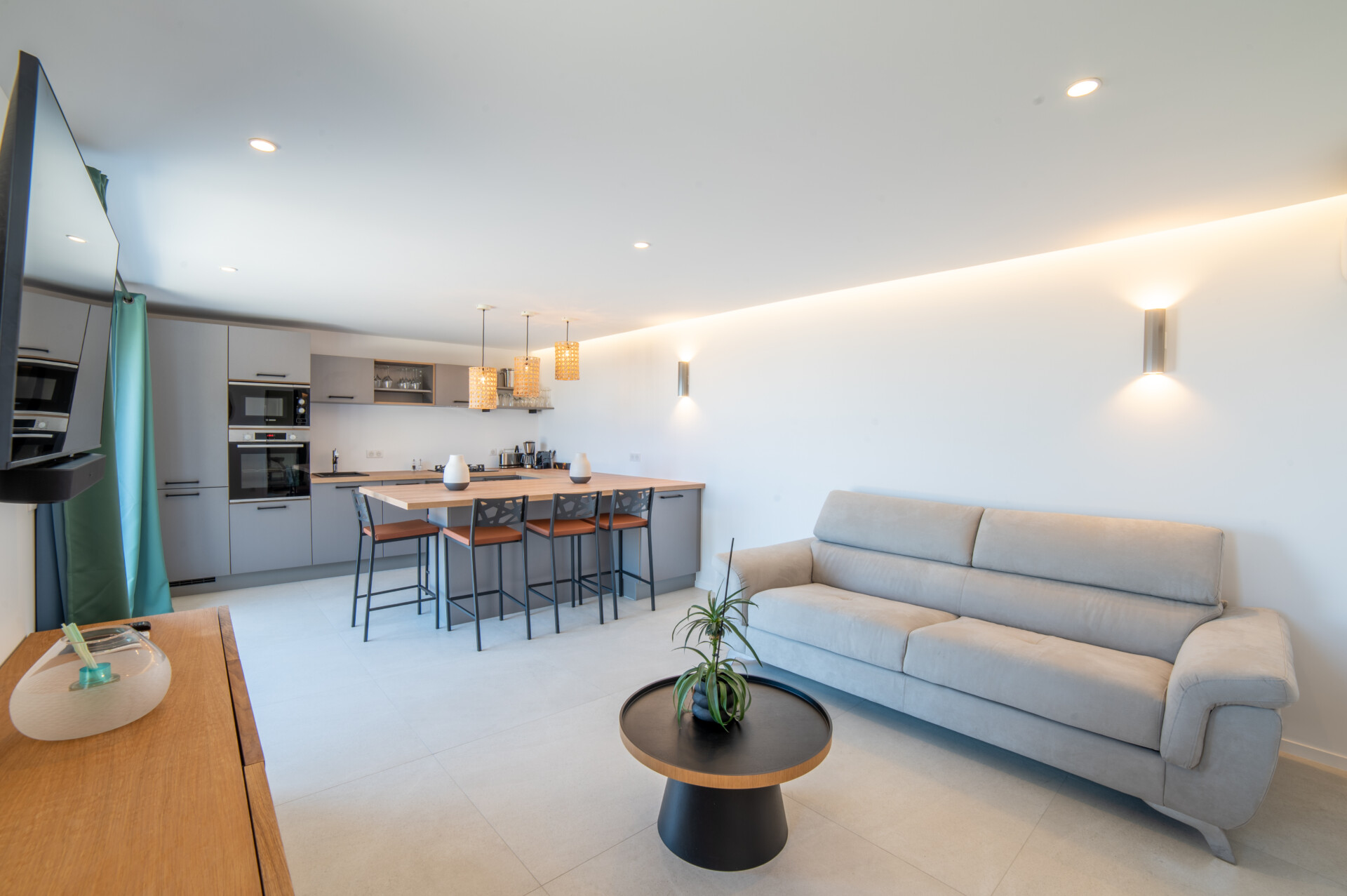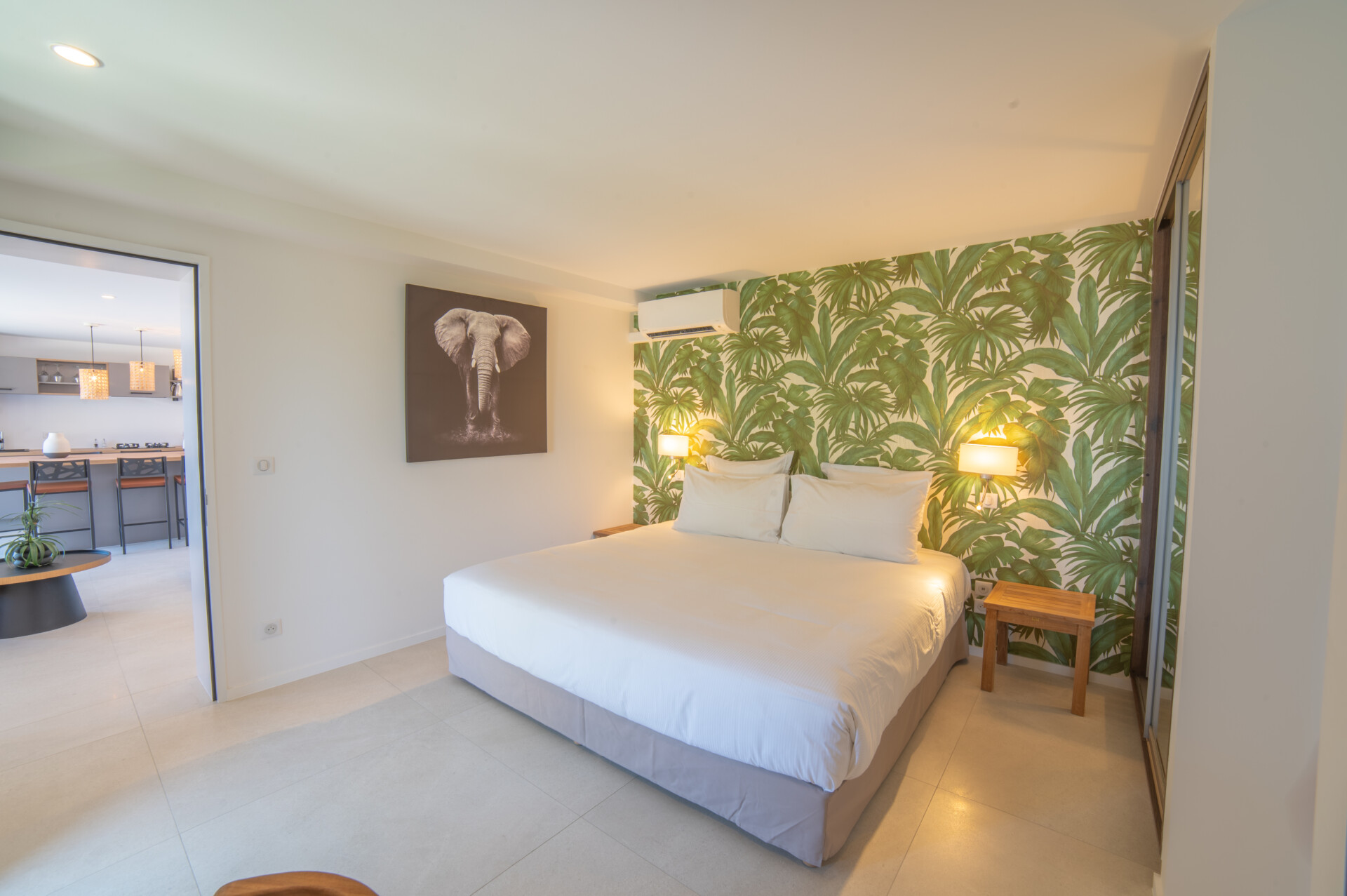 Designed for flexibility, the villa accommodates up to four bedrooms. Three are arranged close to the main living areas – air-conditioned, well-sized, and each with an ensuite. The fourth is a fully independent studio below, complete with its own kitchenette, living space, and garden access – ideal for guests seeking extra peace and privacy.