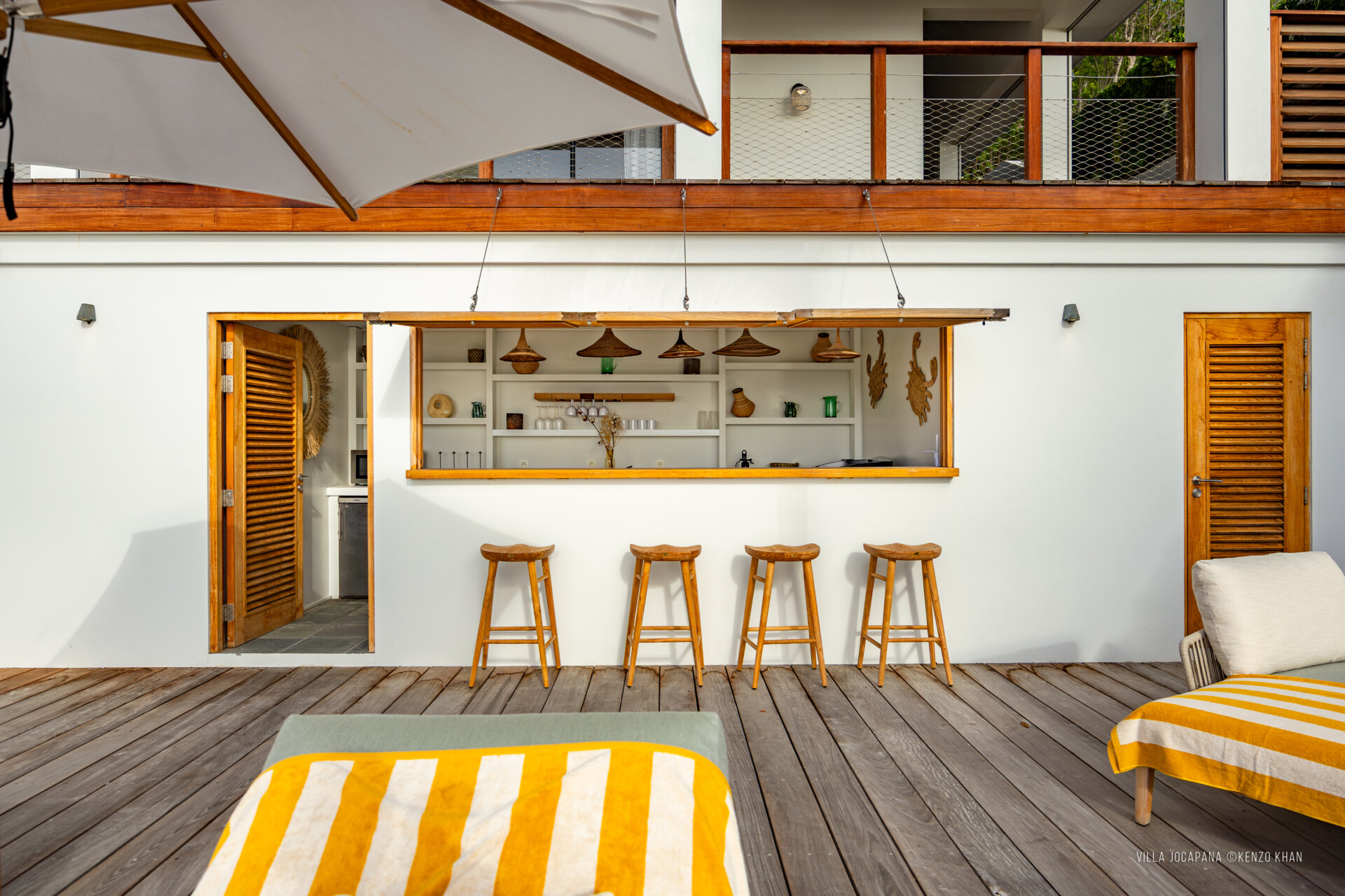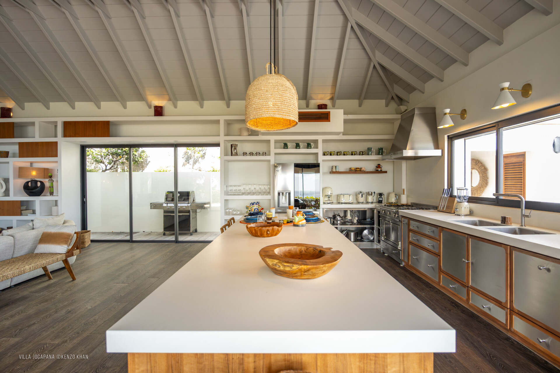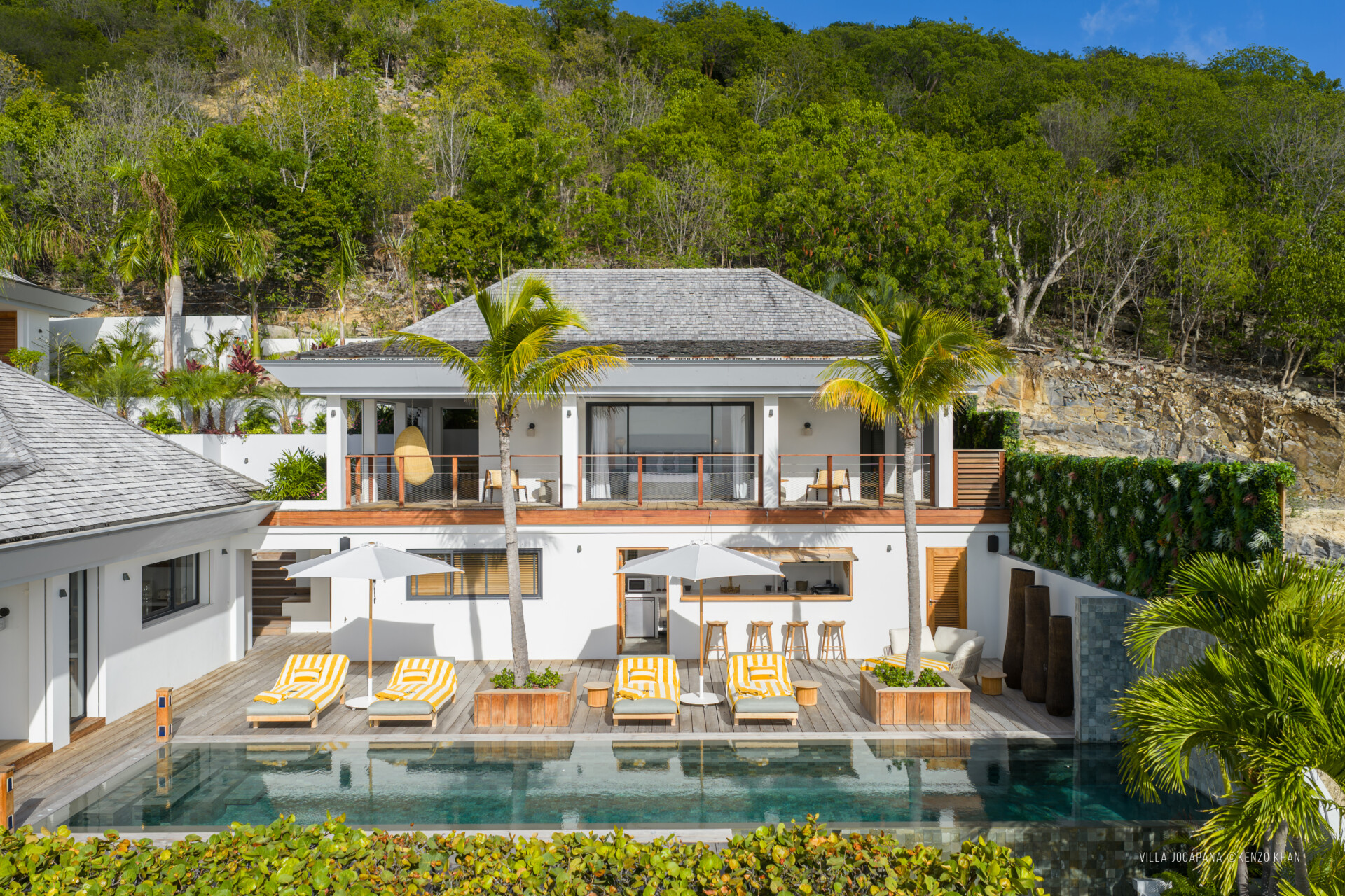 Together, the rooms share access to spacious living room with a Sonos sound system and a gourmet kitchen – or to meals prepared by one of the finest chefs on the island, whose services the Sibarth concierge can arrange – a large indoor breakfast island and stools, a gas grill, a covered terrace, a 40-foot-long heated lap pool and sunbeds, and a gazebo that can be used for yoga or fitness sessions (again, the Sibarth concierge can easily make this happen) or for simple socializing or just relaxing away from the pool and main deck.