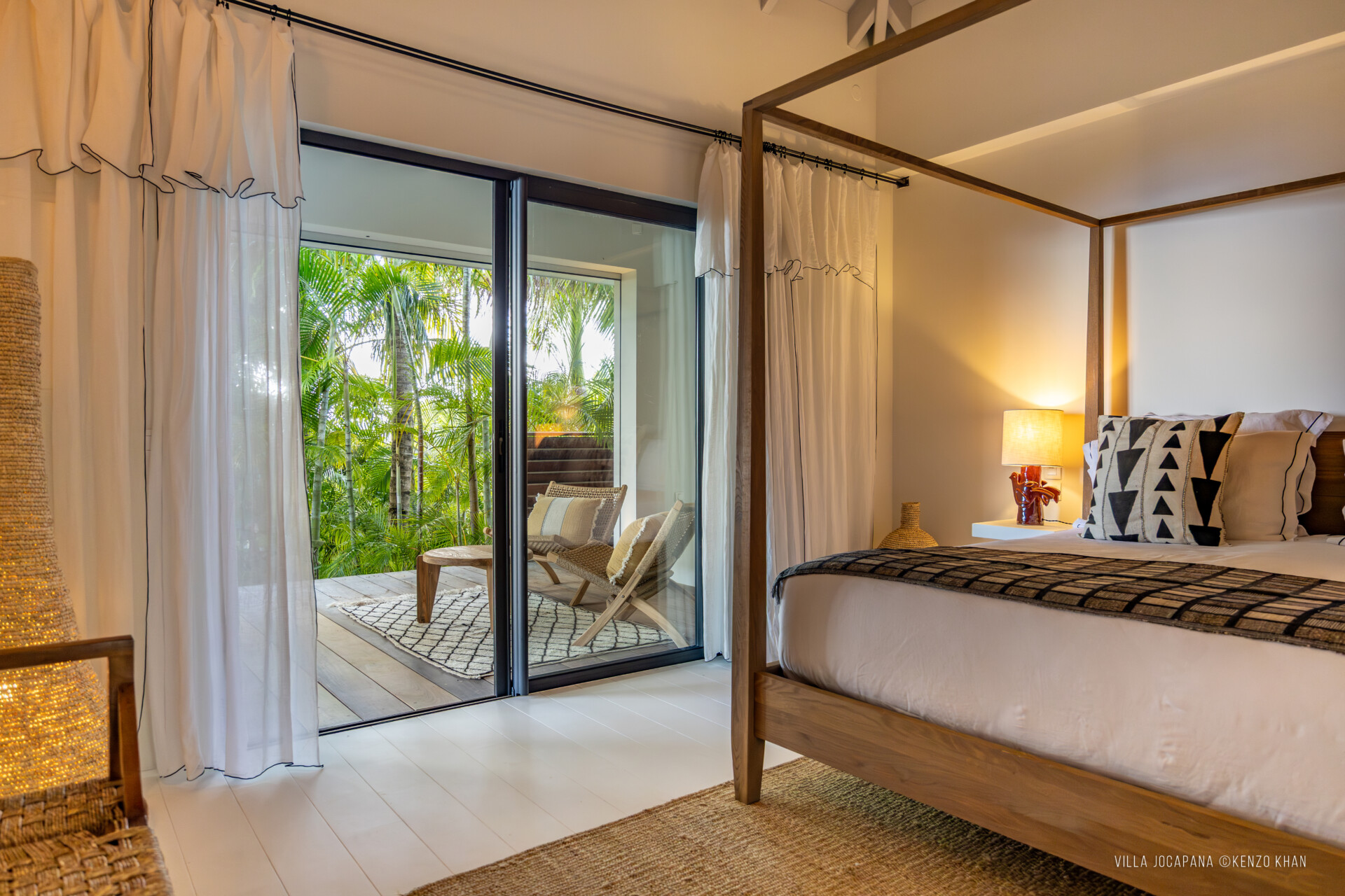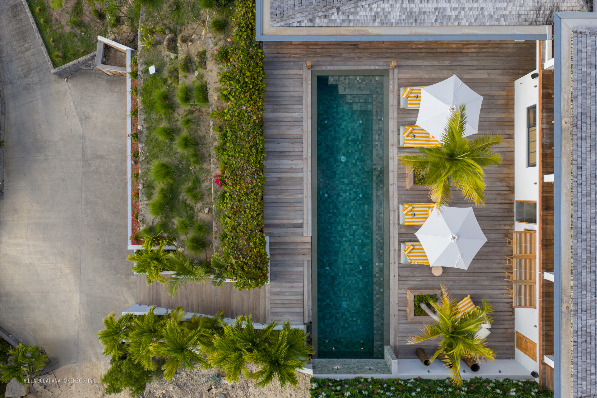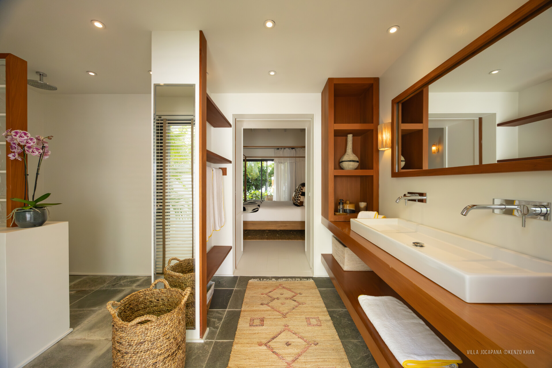 Two of them are next to each other off the living area, each with a European king bed and an ensuite bathroom with an indoor and outdoor shower. The primary bedroom is even more private, in a separate bungalow on its own level up a flight of stairs above the pool, again with a European king-size bed and ensuite bathroom with an indoor shower that can be completely opened to the outdoors, and its own large terrace and seating area. Recently a fourth bedroom with its ensuite and in a separate bungalow was added to the villa.