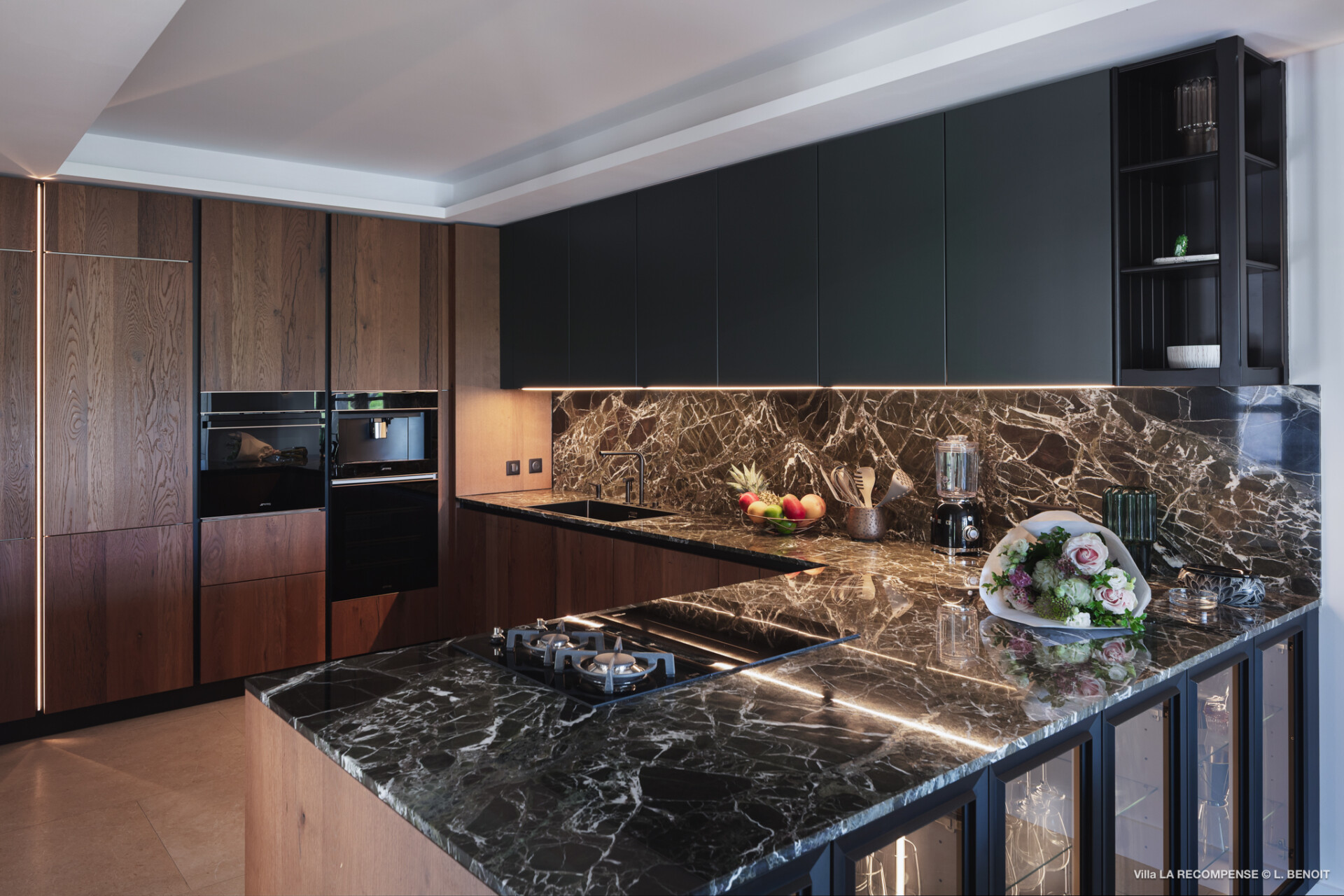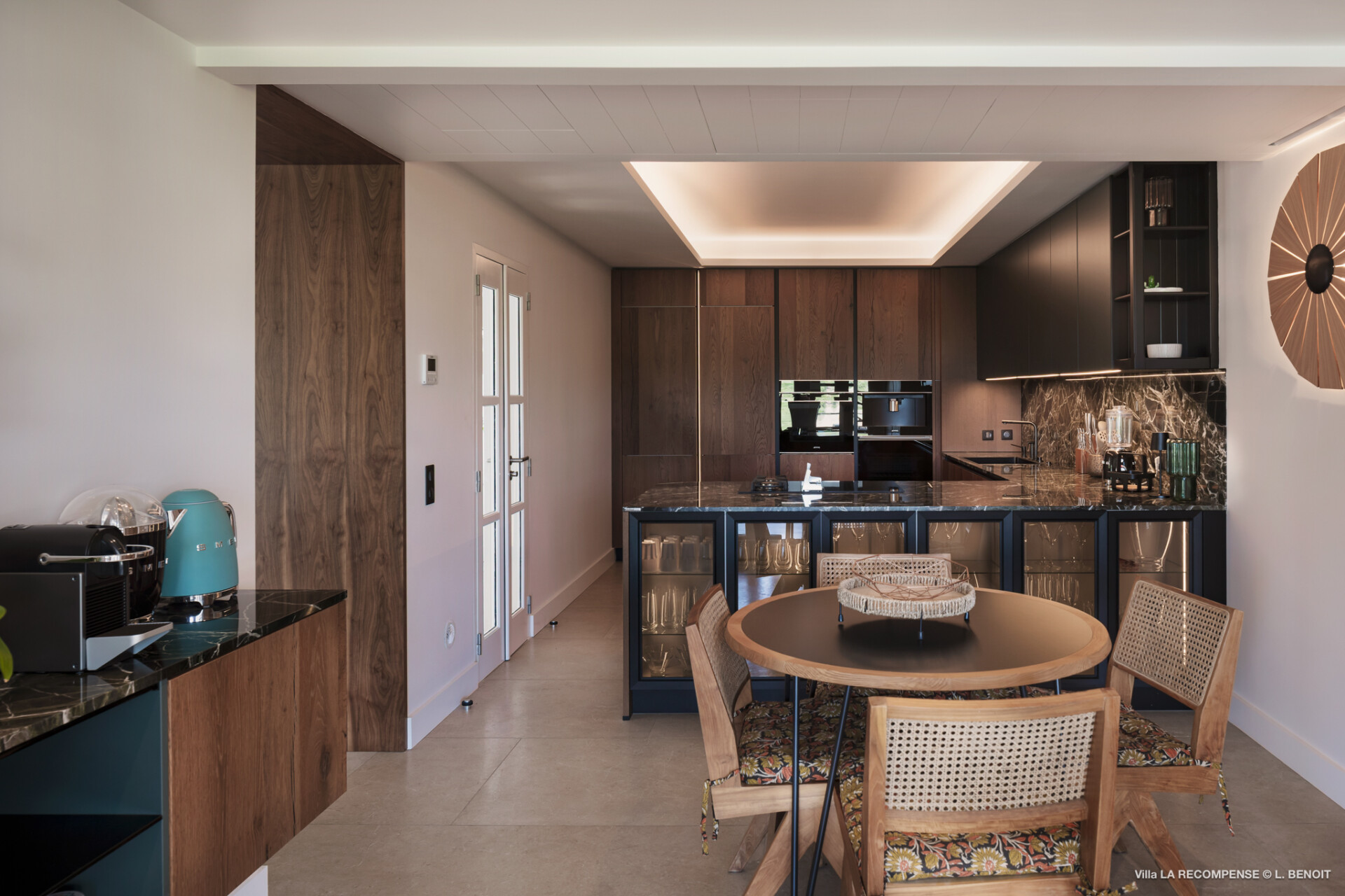 The main living and dining area opens directly onto the terrace, allowing interior and exterior spaces to connect with ease. The kitchen is well equipped and positioned beside the living space, encouraging shared moments throughout the day. Just behind the kitchen, a separate BBQ area with an additional outdoor dining table offers another setting for relaxed meals and gatherings.