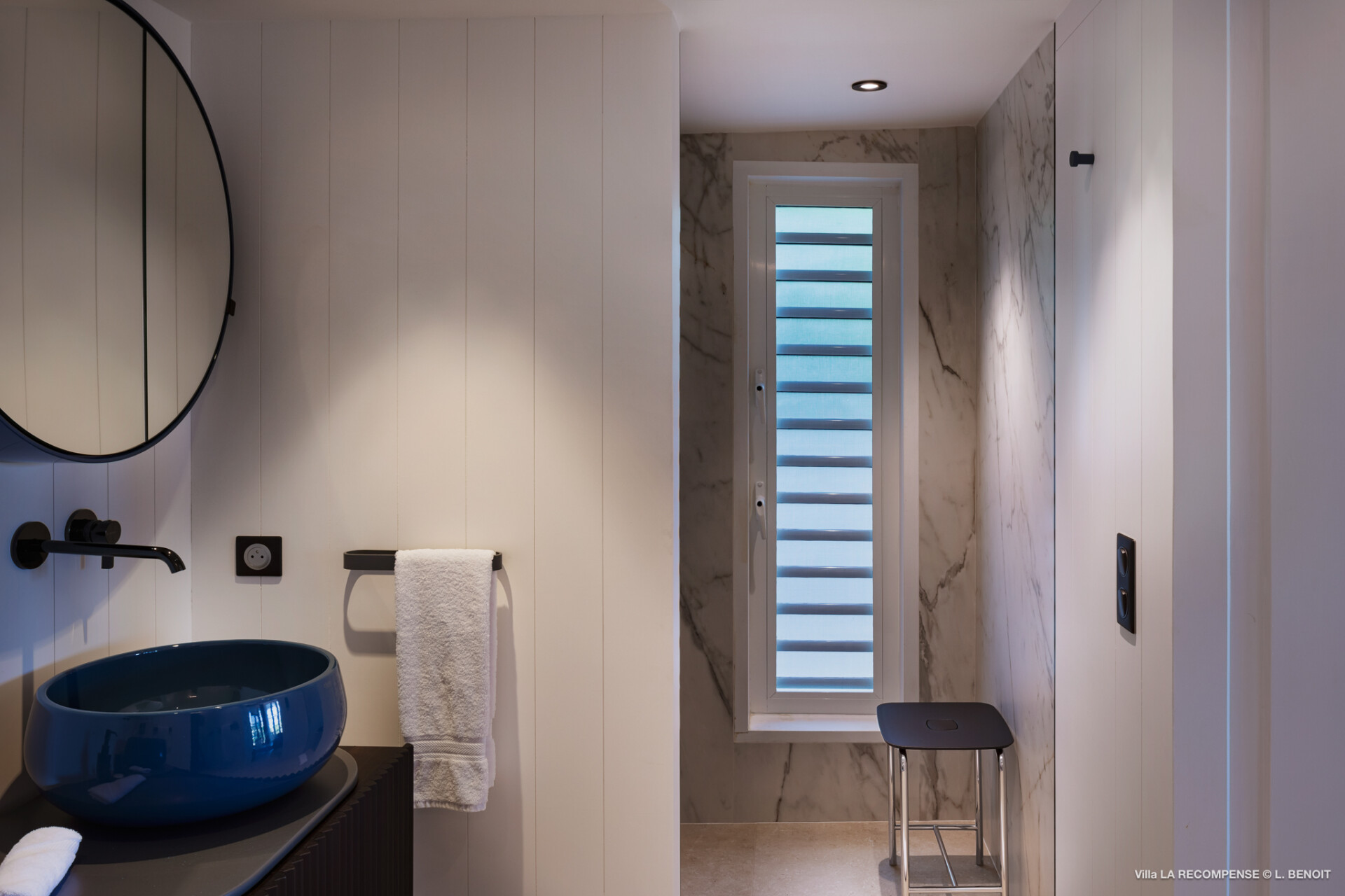 Two bedrooms are located to the left of the kitchen and living area, with one positioned slightly below. The third bedroom is situated downstairs alongside a games room, offering additional flexibility and making the villa particularly appealing for families or groups seeking both comfort and entertainment. Each bedroom features its own ensuite bathroom and reflects the villa’s harmonious blend of traditional style and contemporary ease.