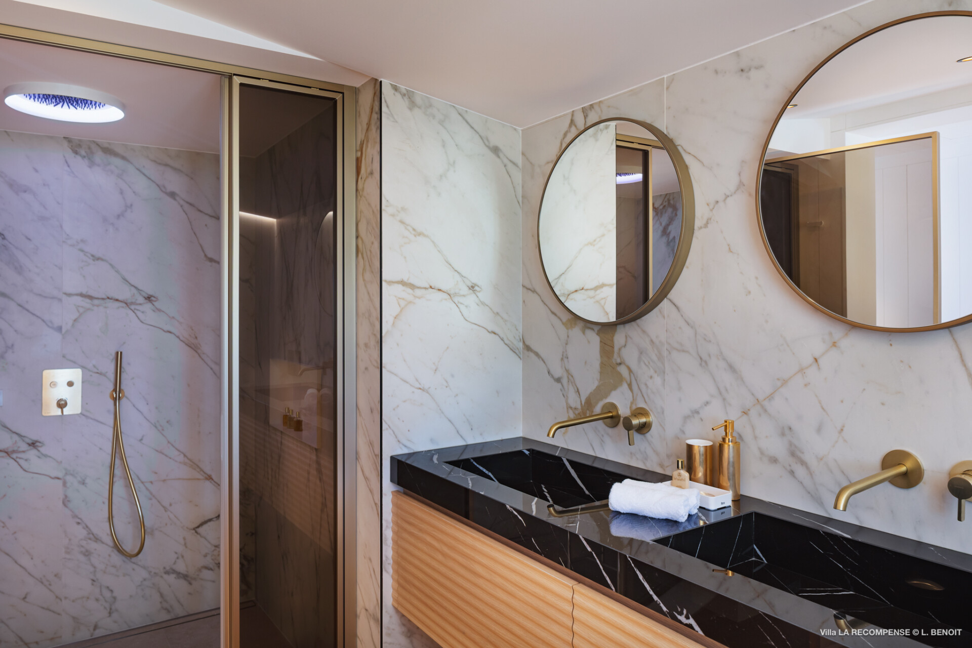 The main terrace is designed for enjoyment at every hour. The heated infinity pool faces the view, while a jacuzzi adds an extra element of relaxation. Sun loungers and shaded seating areas create multiple spaces to gather or unwind, whether for a quiet morning or an evening with friends.