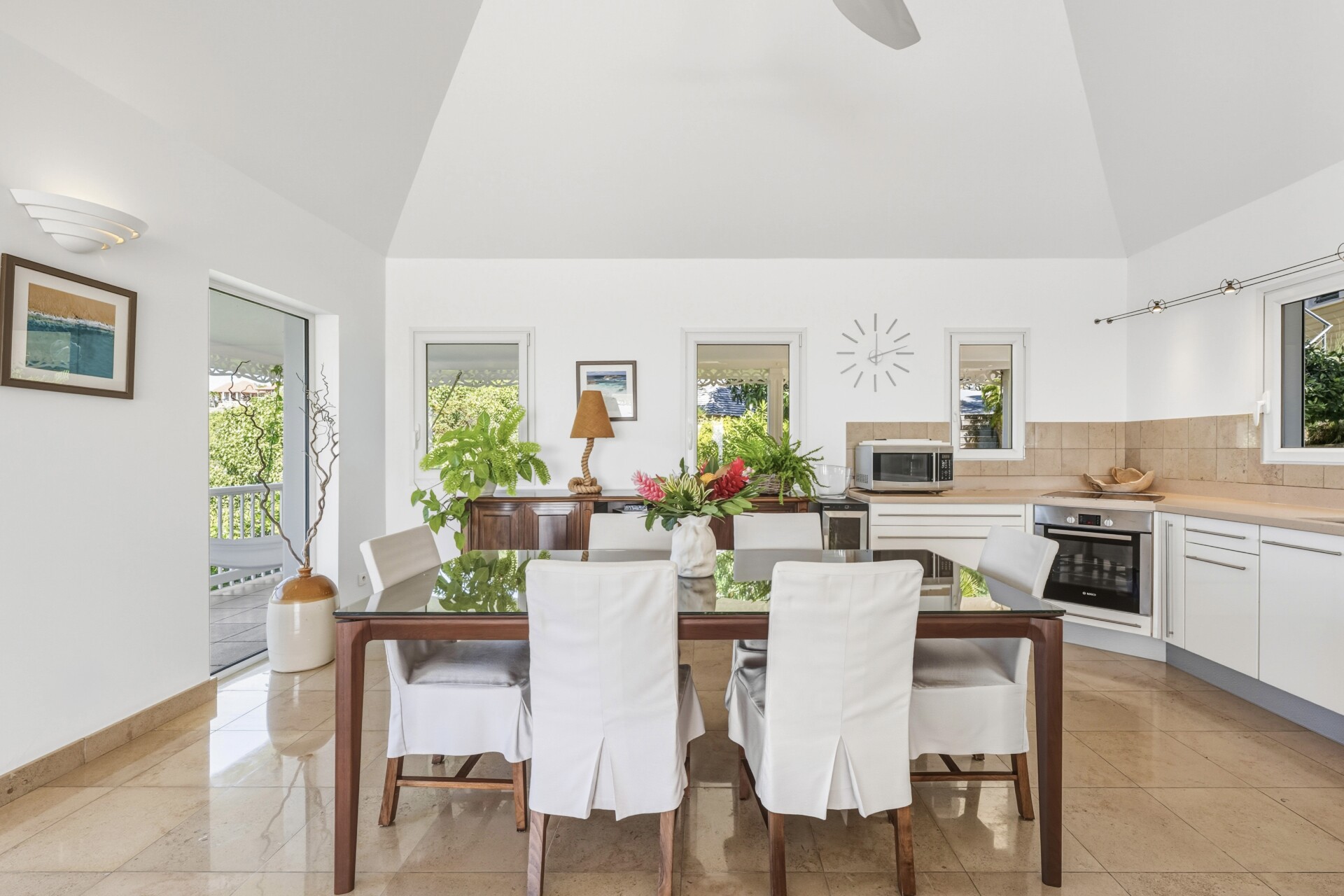 Nestled high up on hillside in Colombier, Villa L'Enclos (CLO) offers quiet seclusion and a spectacular ocean vista, a true panorama ranging from Gustavia Harbor to the east to the island of St. Maarten to the west. Recently renovated and redecorated, Villa CLO provides its guests with genuine West Indies charm with updated amenities and features. The open-plan living/dining and kitchen area occupies the main house, and large French doors open onto the terrace facing the Caribbean Sea and Saba. The convenient kitchen is modern and well equipped, with plenty of counter space, discrete under-counter refrigerators.