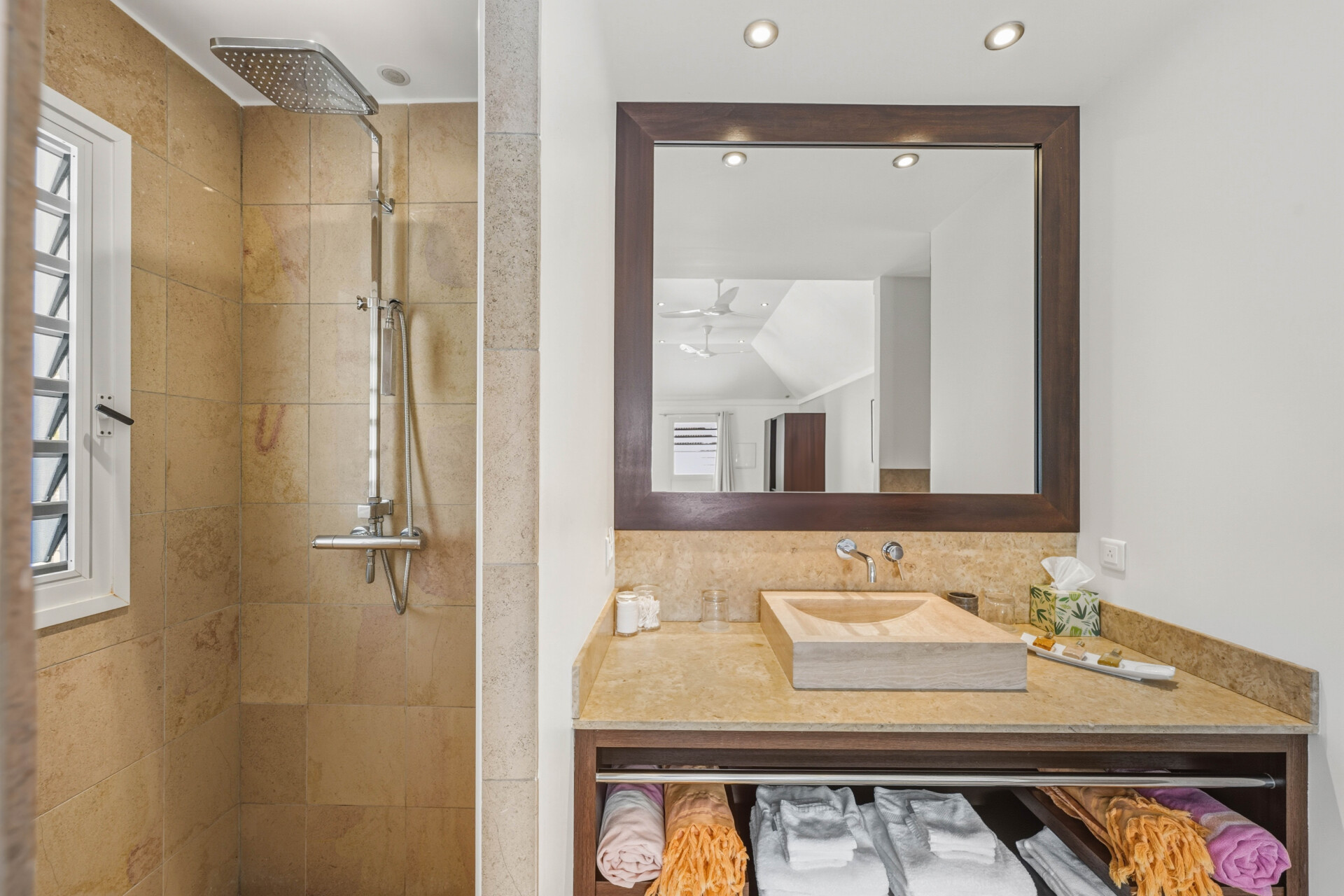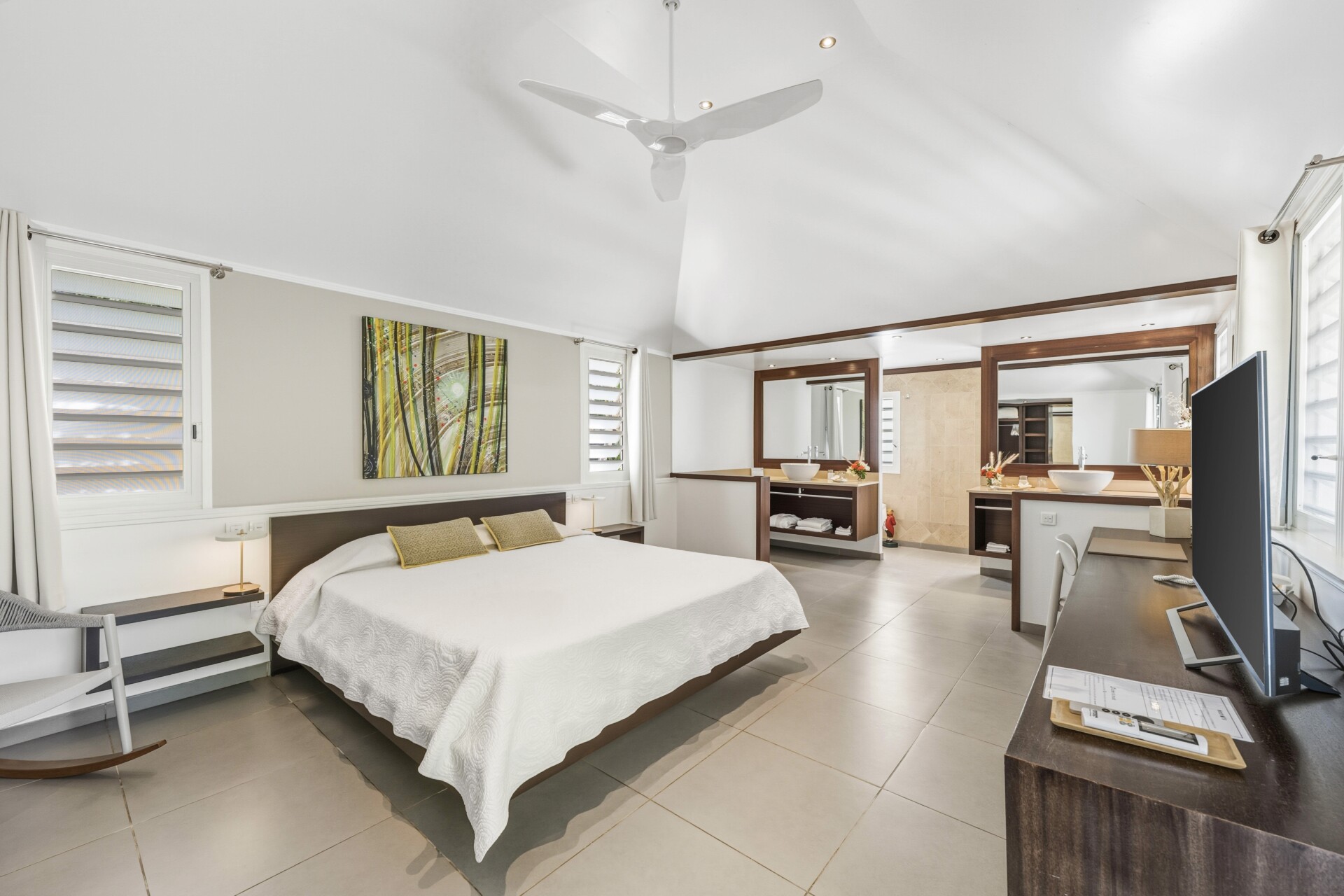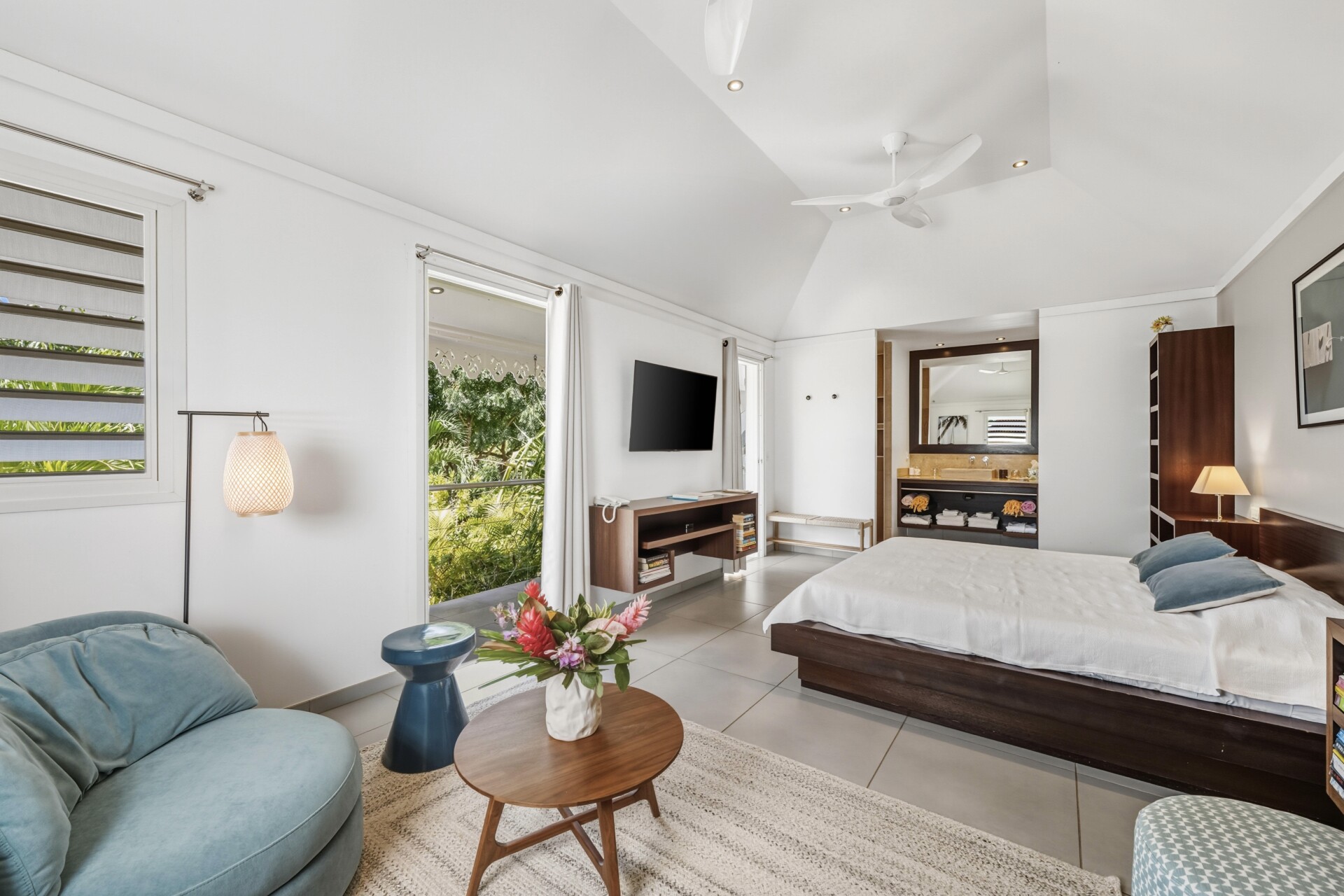 The master bedroom, located in an independent cottage set apart from the main house, is modern and provides both privacy and comfort. The second bedroom, also in its own bungalow, offers a queen bed and ensuite bathroom.
