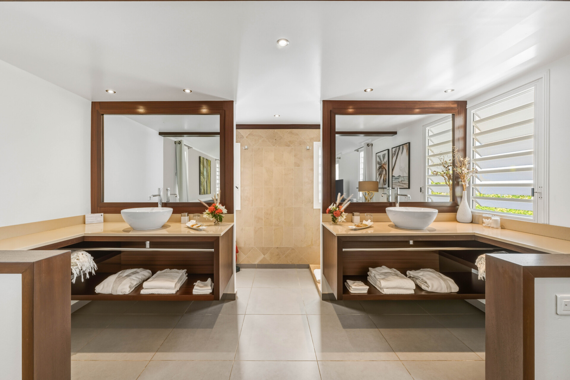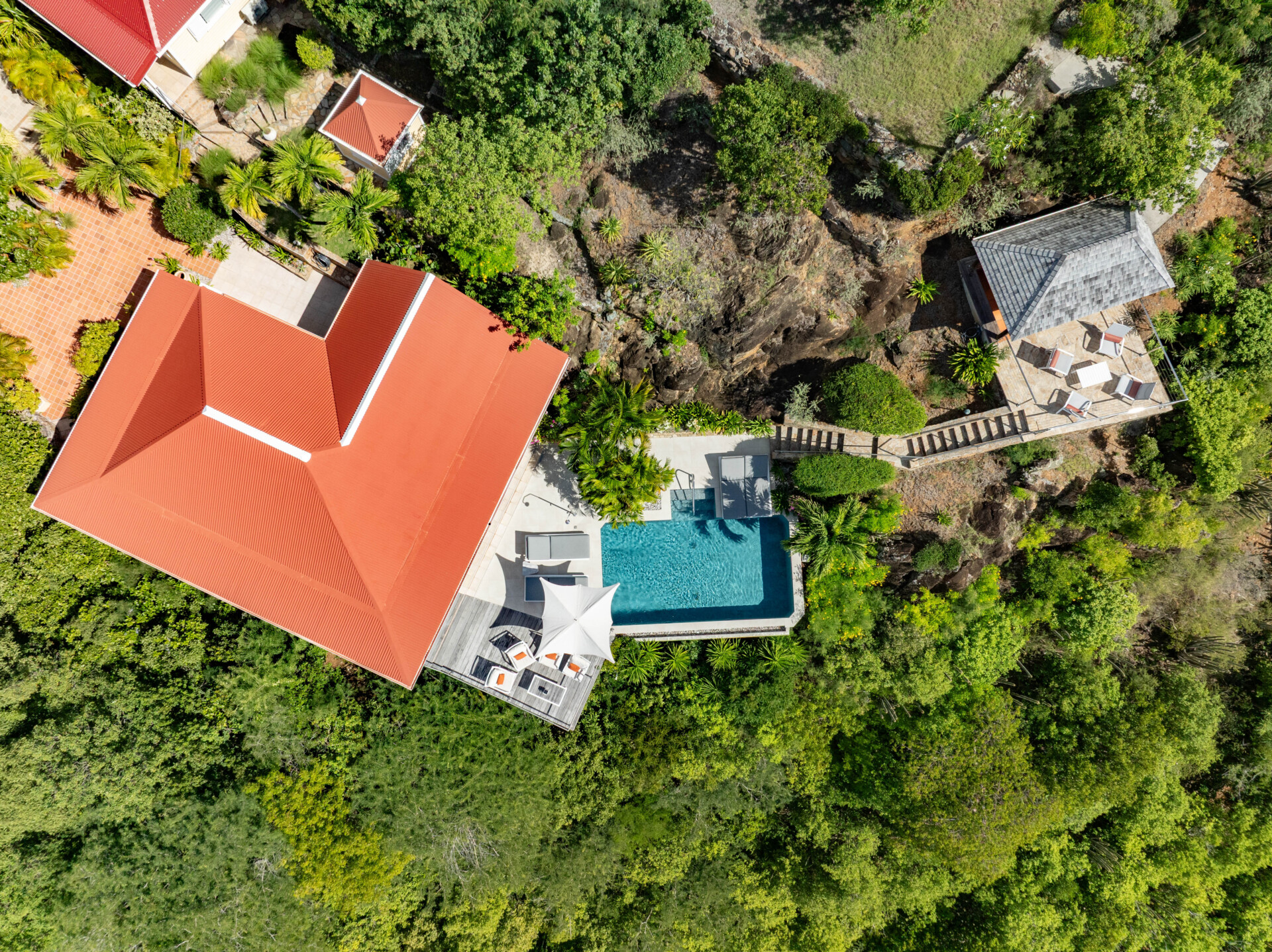 On the terrace off the main house, the clear and inviting water of the infinity pool looks as though it is overflowing into the ocean below. Comfortable seating and chaises for sunning are available on the terrace, along with an outdoor rain-head shower by the pool and a half-bath near the main house. A dining deck above the pool is an ideal spot to enjoy the end of the day while watching sailboats returning to port under the spectacular colors of the sky at sunset. Lush vegetation surrounds this villa, providing exceptional privacy and quiet.