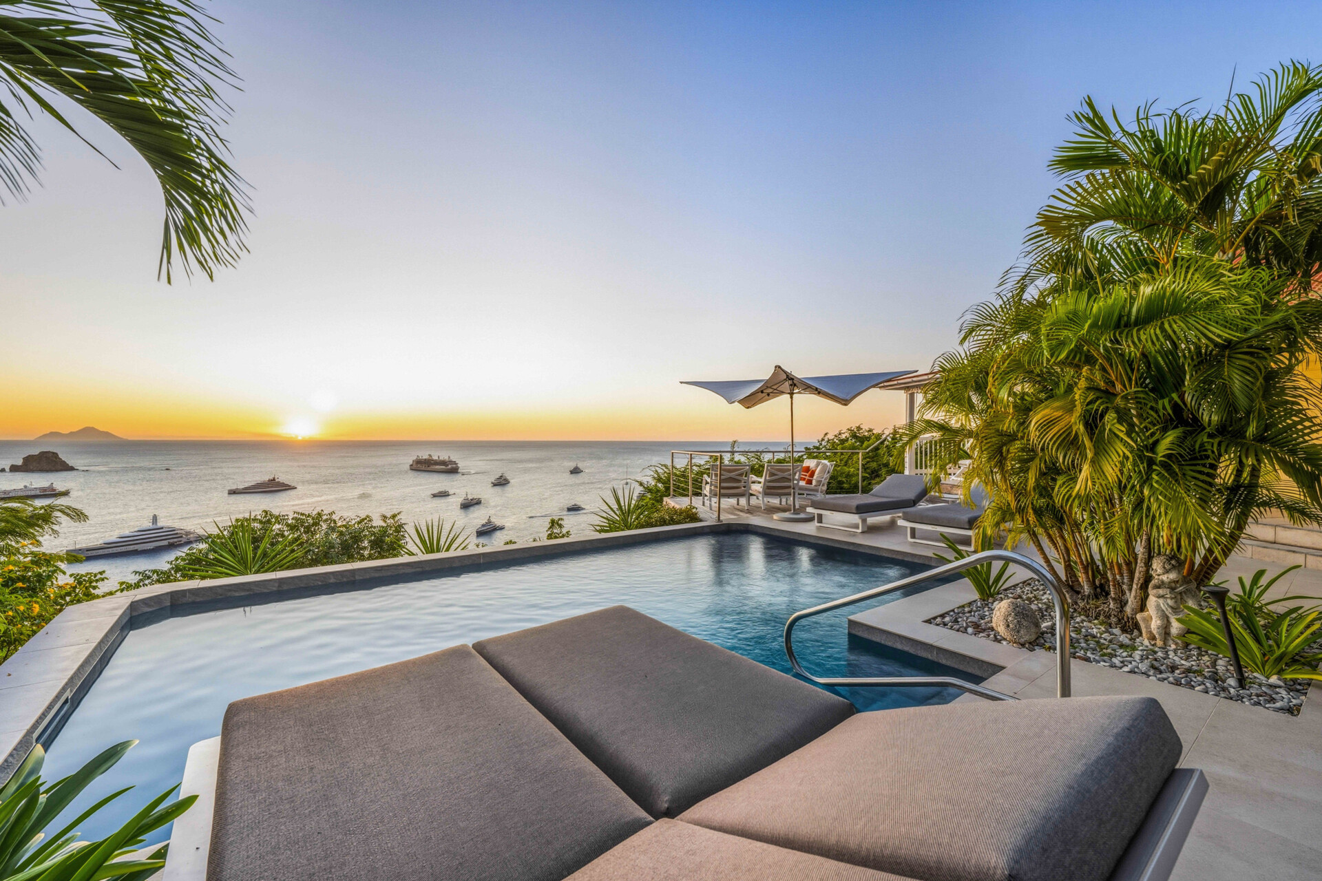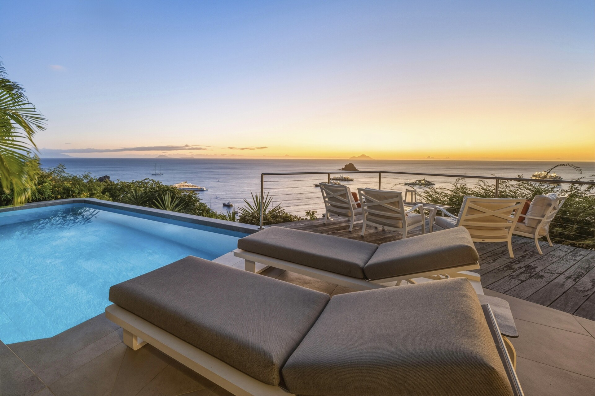 Infinity Pool with Steps, Half Bath, Gas BBQ, WiFi. Lovely terrace that overlooks the ocean, Saba island, and Gustavia harbor. Upper terrace with outdoor, covered living & dining area. Features deckchairs.