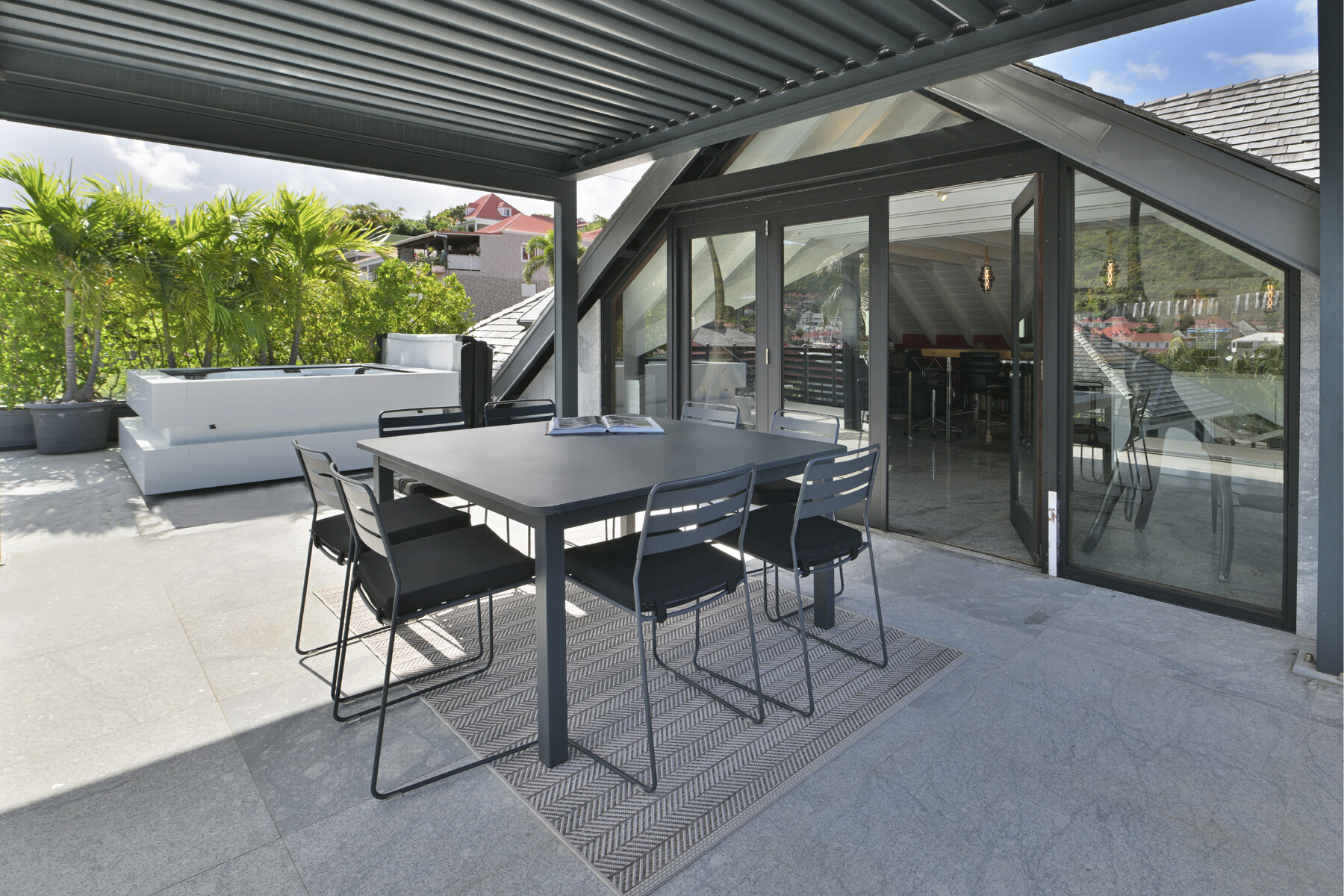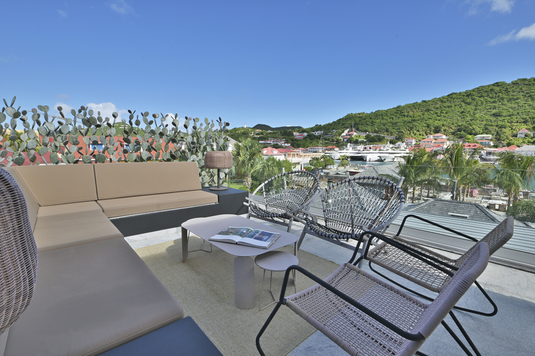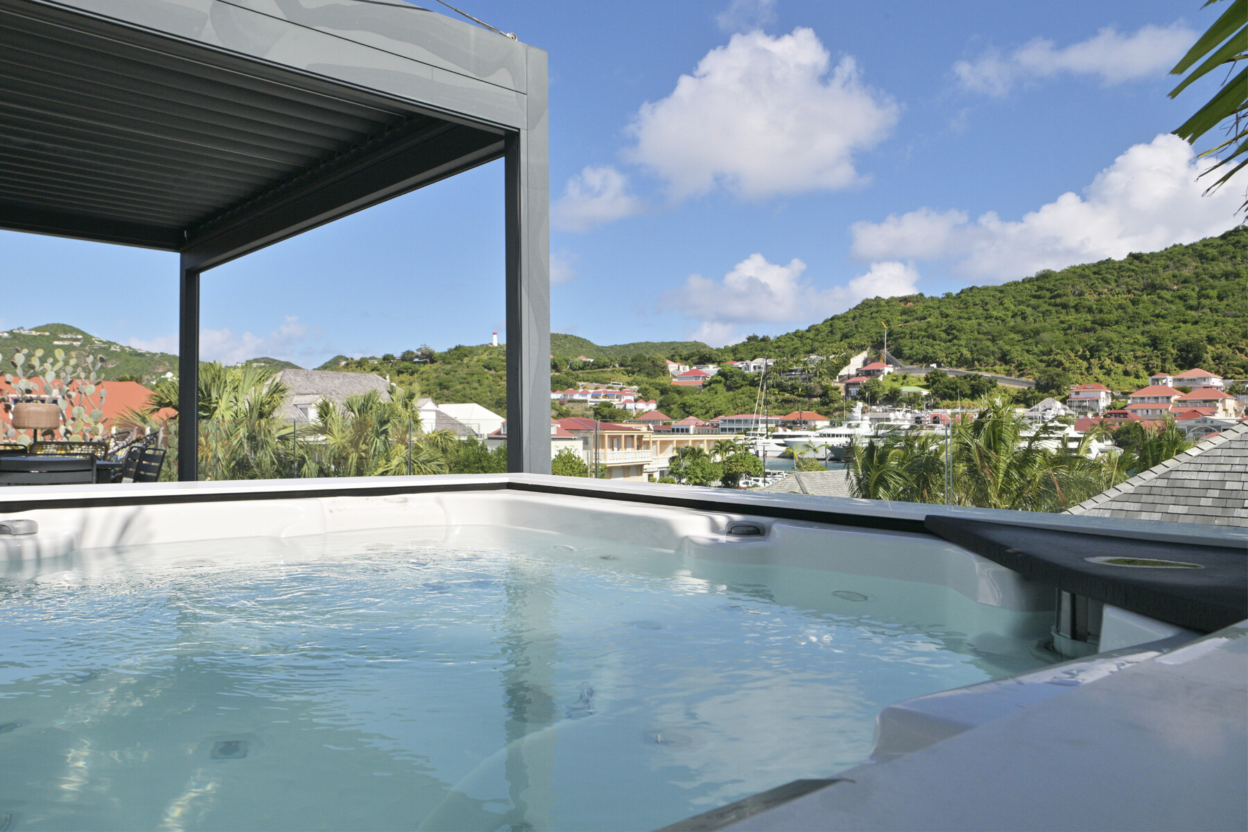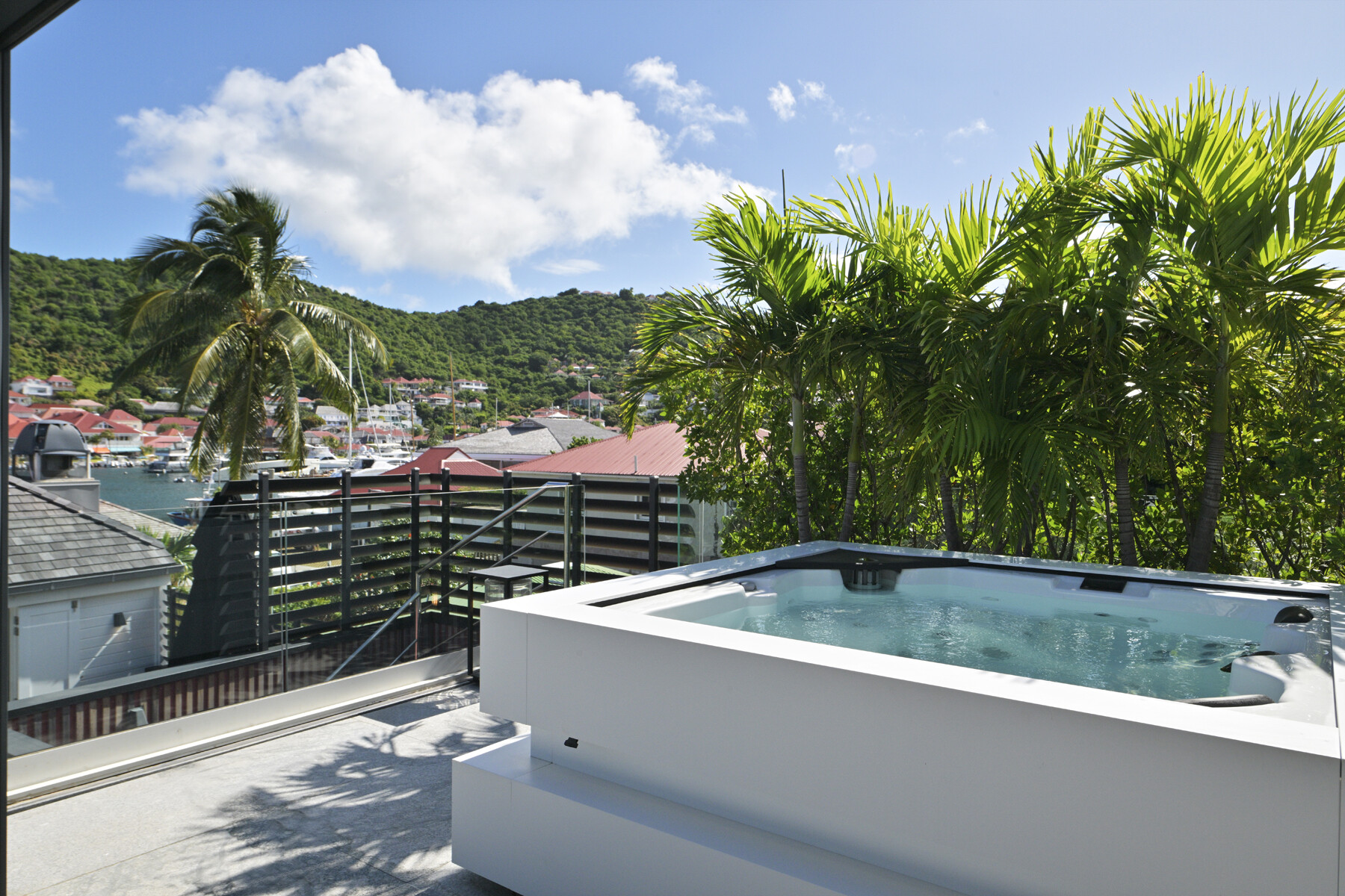 The open-plan living area features a fully equipped kitchen and large sliding doors that lead to a private terrace. Here, the jacuzzi offers a soothing urban pause while overlooking Gustavia's harbor. Natural light filters through, creating an atmosphere that is both warm and modern.