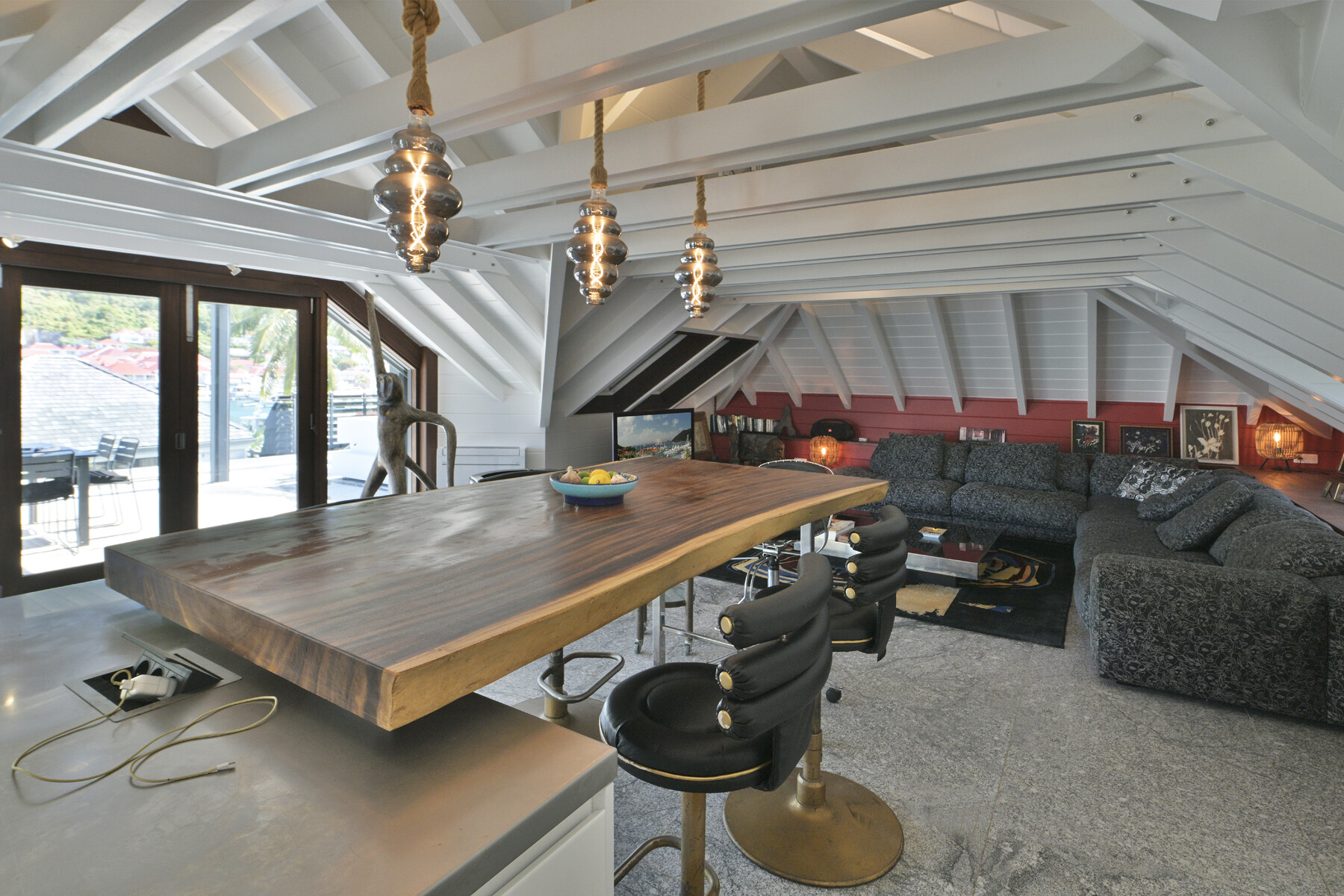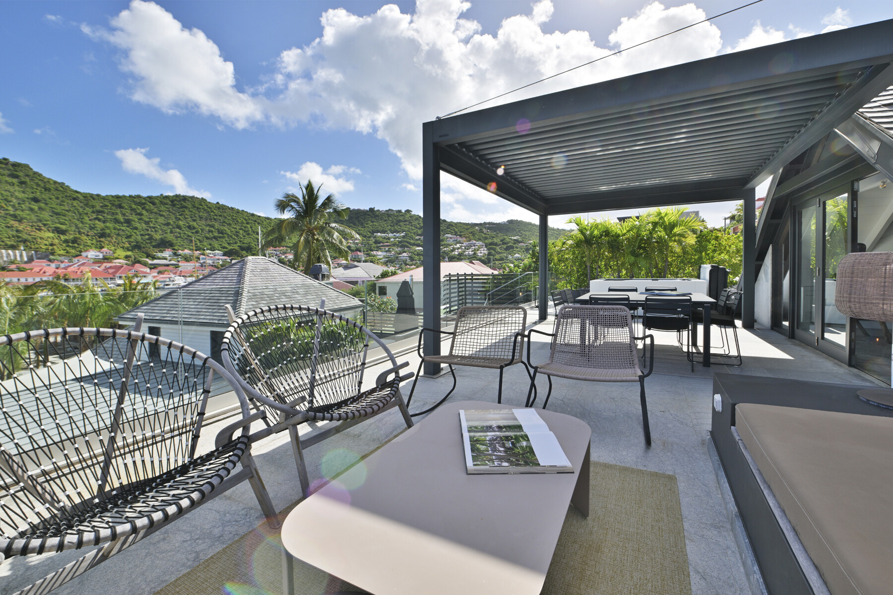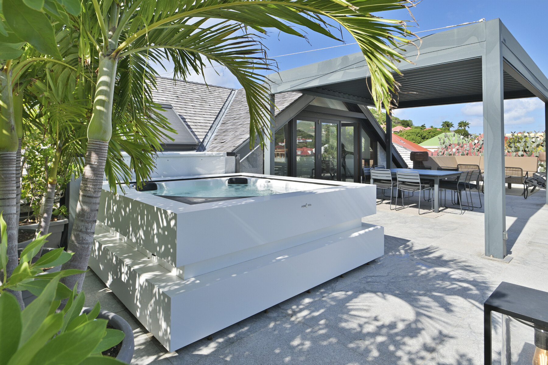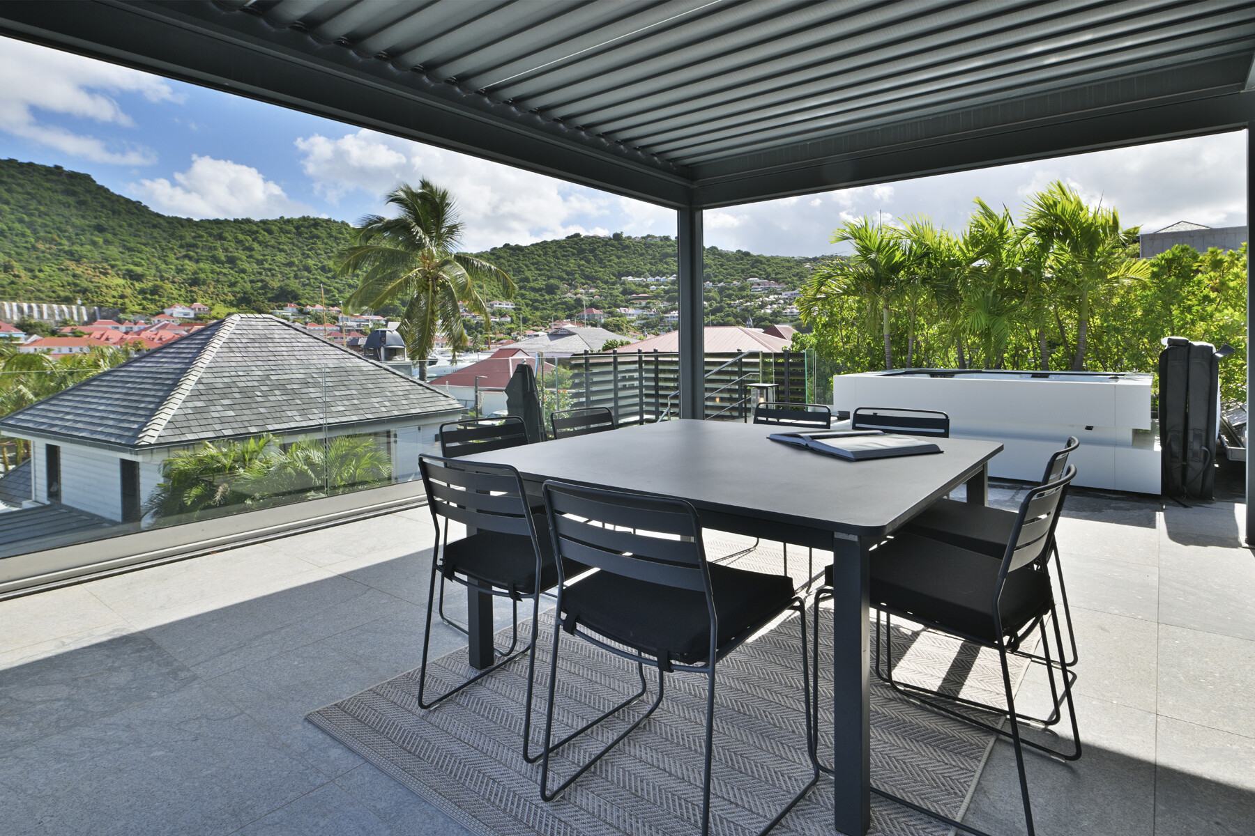 The open-plan living area features a fully equipped kitchen and large sliding doors that lead to a private terrace. Here, the jacuzzi offers a soothing urban pause while overlooking Gustavia's harbor. Natural light filters through, creating an atmosphere that is both warm and modern.