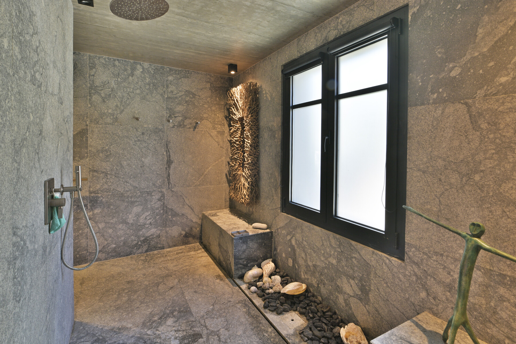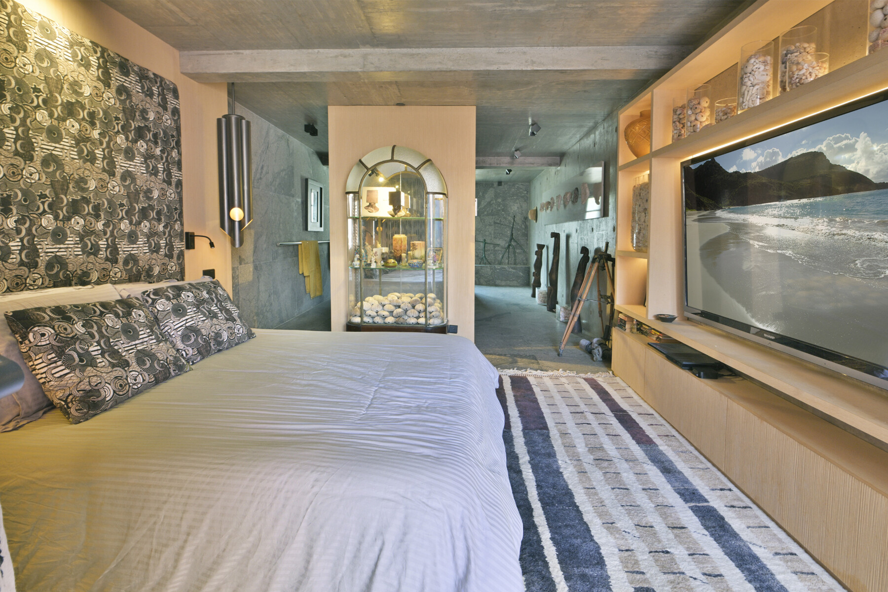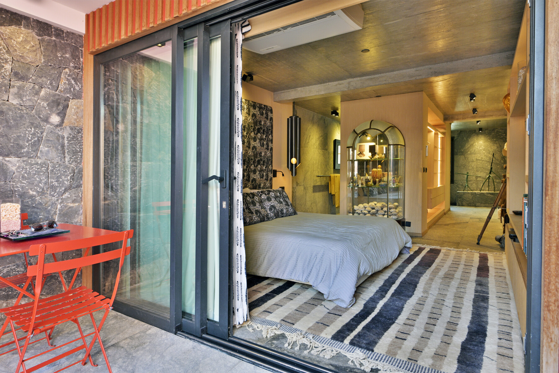 The bedroom is dedicated to peaceful privacy, located just below the main living space. It features a king-size bed and an ensuite bathroom with a rain-head shower and spa-inspired style – clean lines, textured finishes, and a sense of calm refinement.