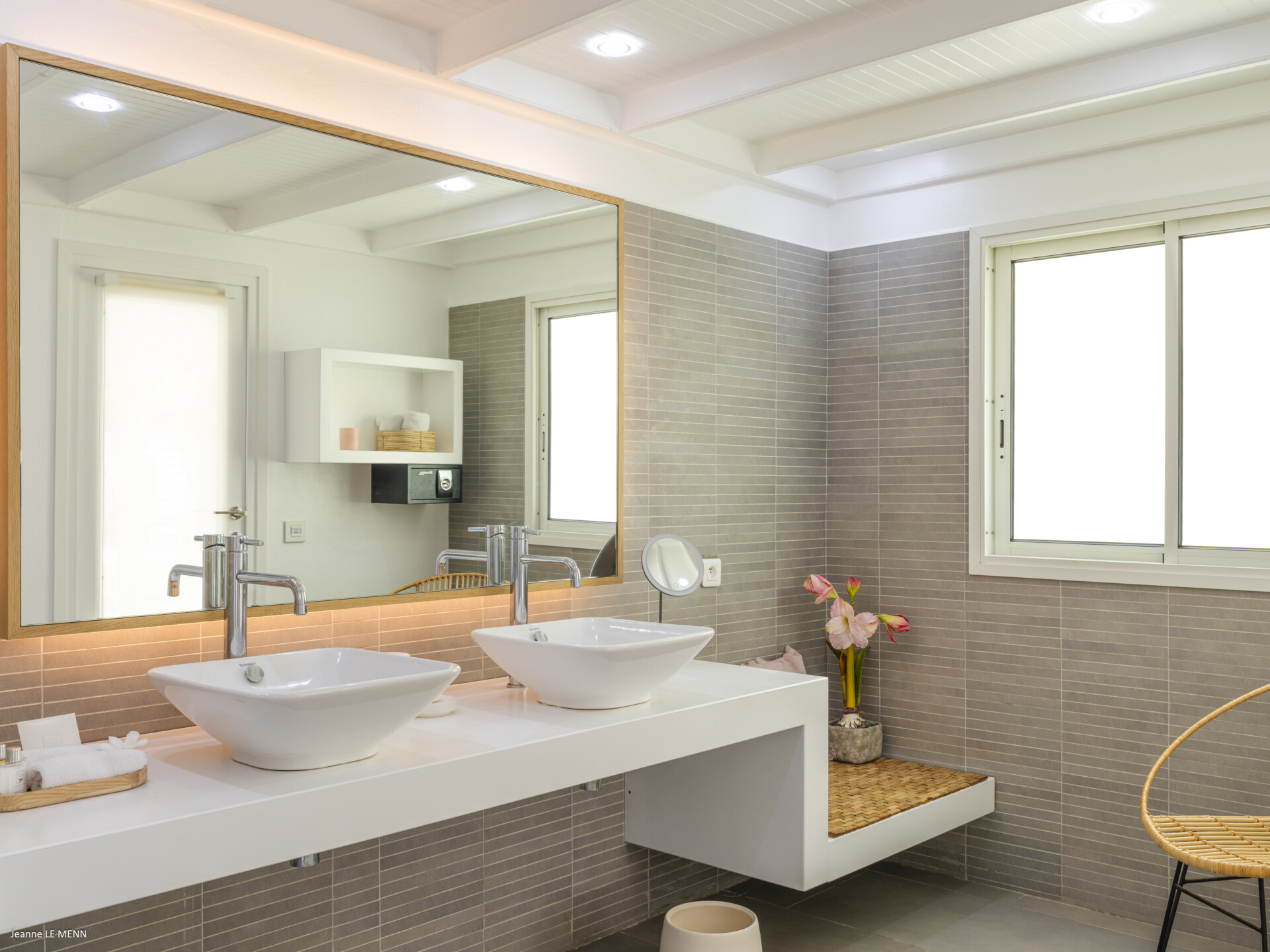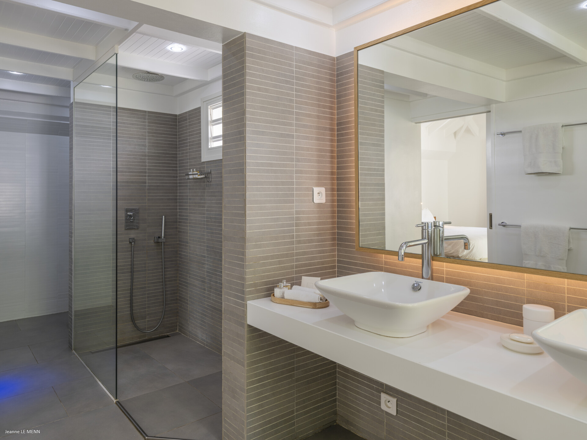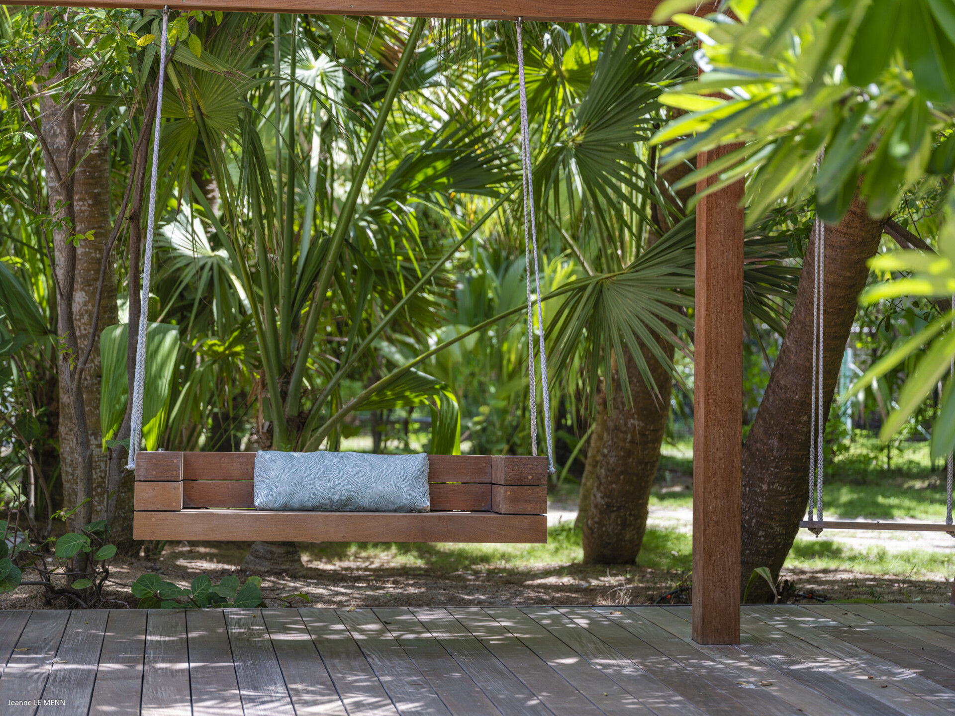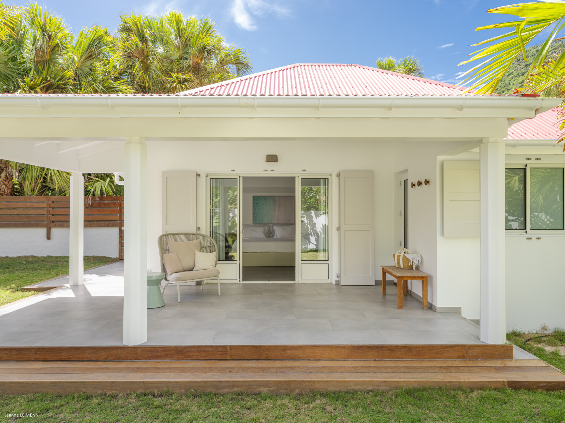 Villa Les Sables is composed of separate bungalows set back from the road. The bedrooms are similar in size and accommodation. The living room is in a separate bungalow and opens toward the beach on on side and to the deck and pool on the other.