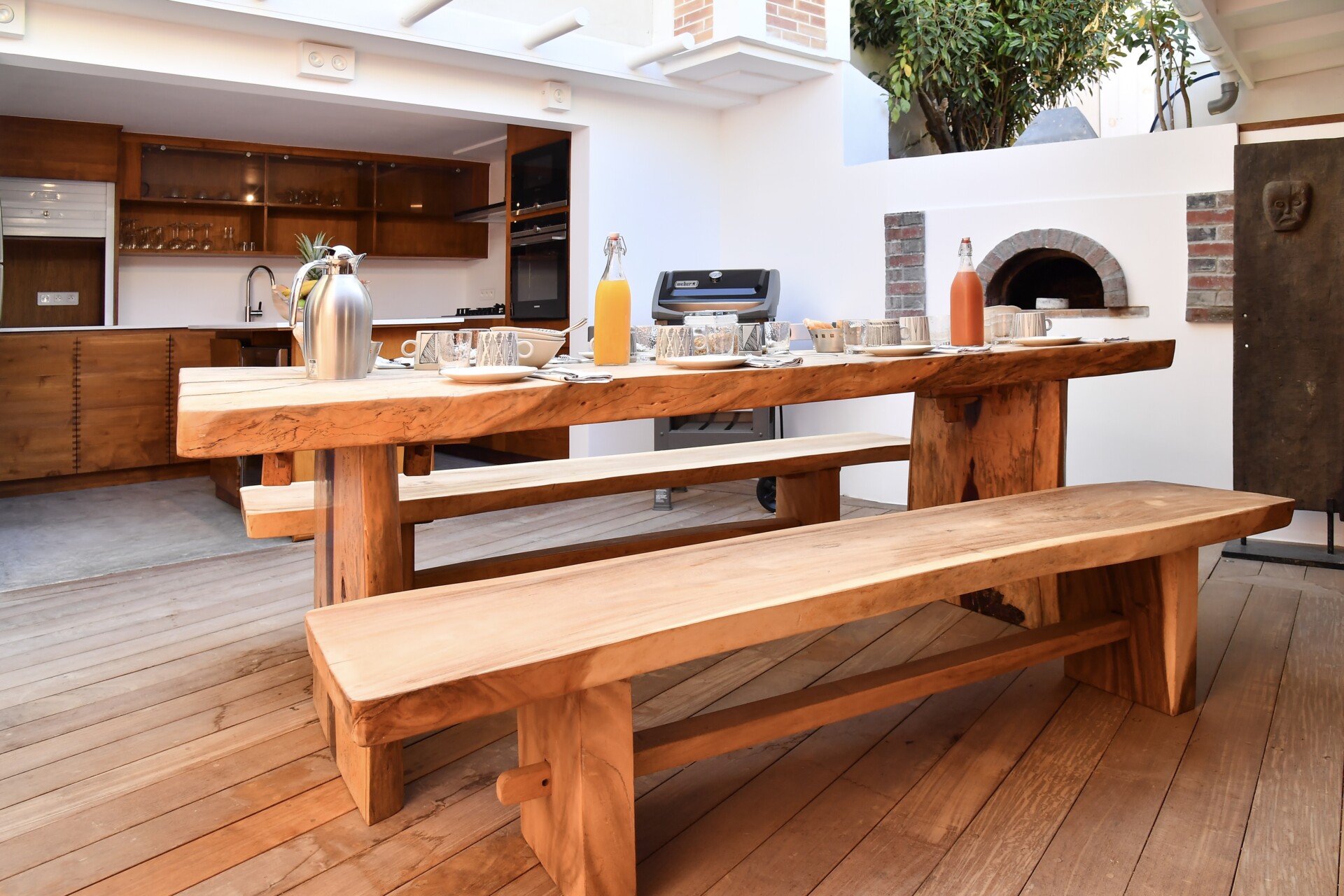 Inside, the living room is bright and welcoming, with sliding doors that connect easily to the terraces. White walls, natural wood, and refined details create an atmosphere that is both comfortable and elegant.