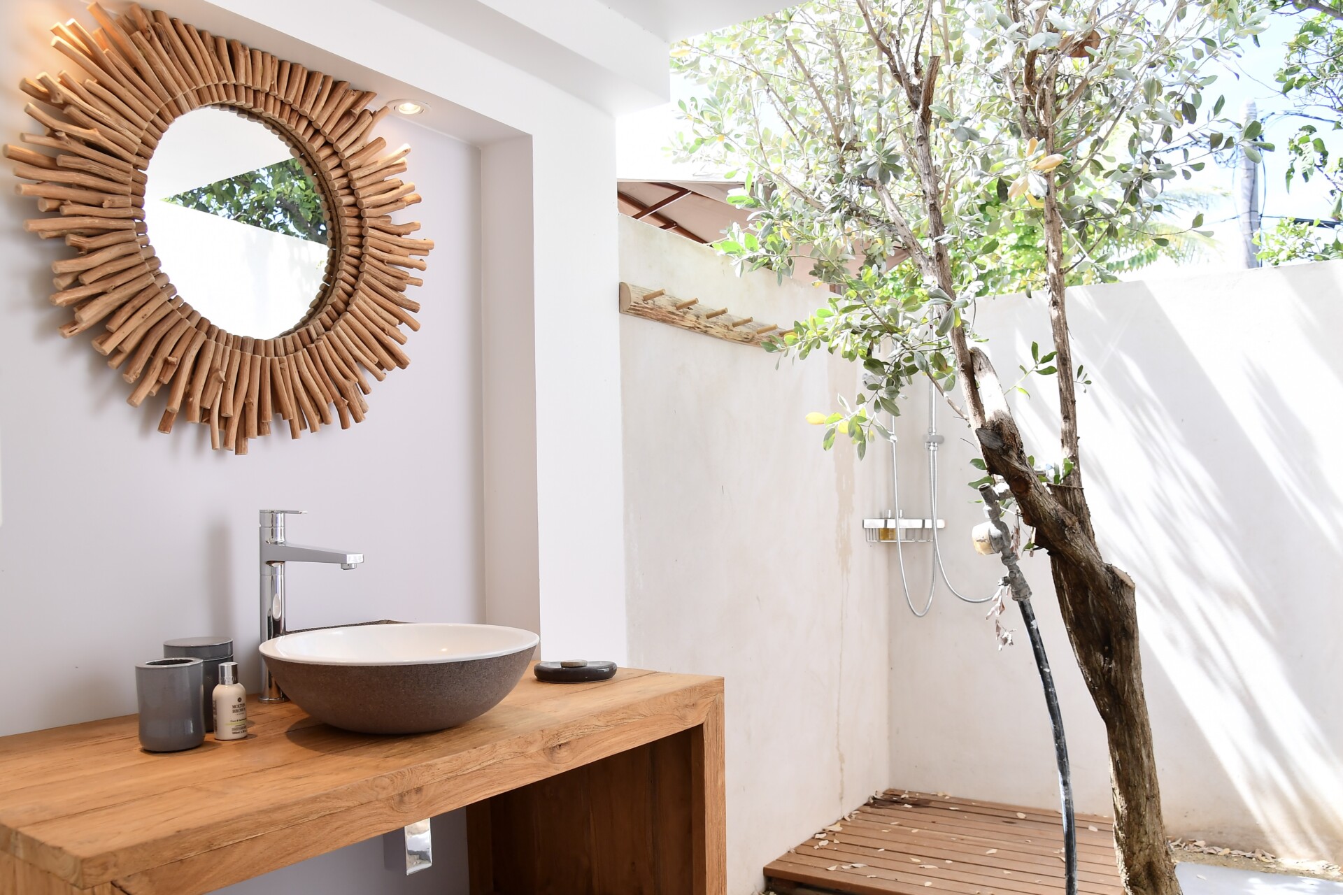 Outside, the villa features a pool and Jacuzzi surrounded by tropical foliage, offering a relaxed transition between interior comfort and outdoor living. Shaded and sun-drenched corners invite long afternoons and easy evenings under the stars.
