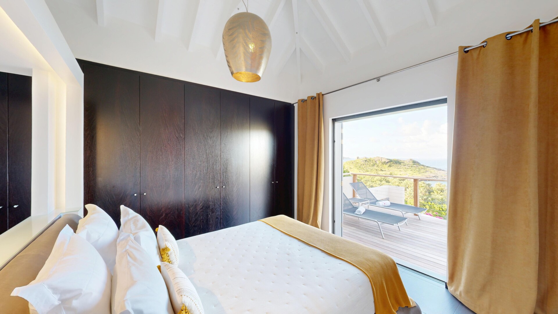 Located on either side of the main living area, the two bedrooms are roughly equal in size and furnishings, and both open onto the terrace and view. Furnished with custom cabinetry and beautifully designed beds imported from Portugal, these rooms have a chic yet inviting ambience.