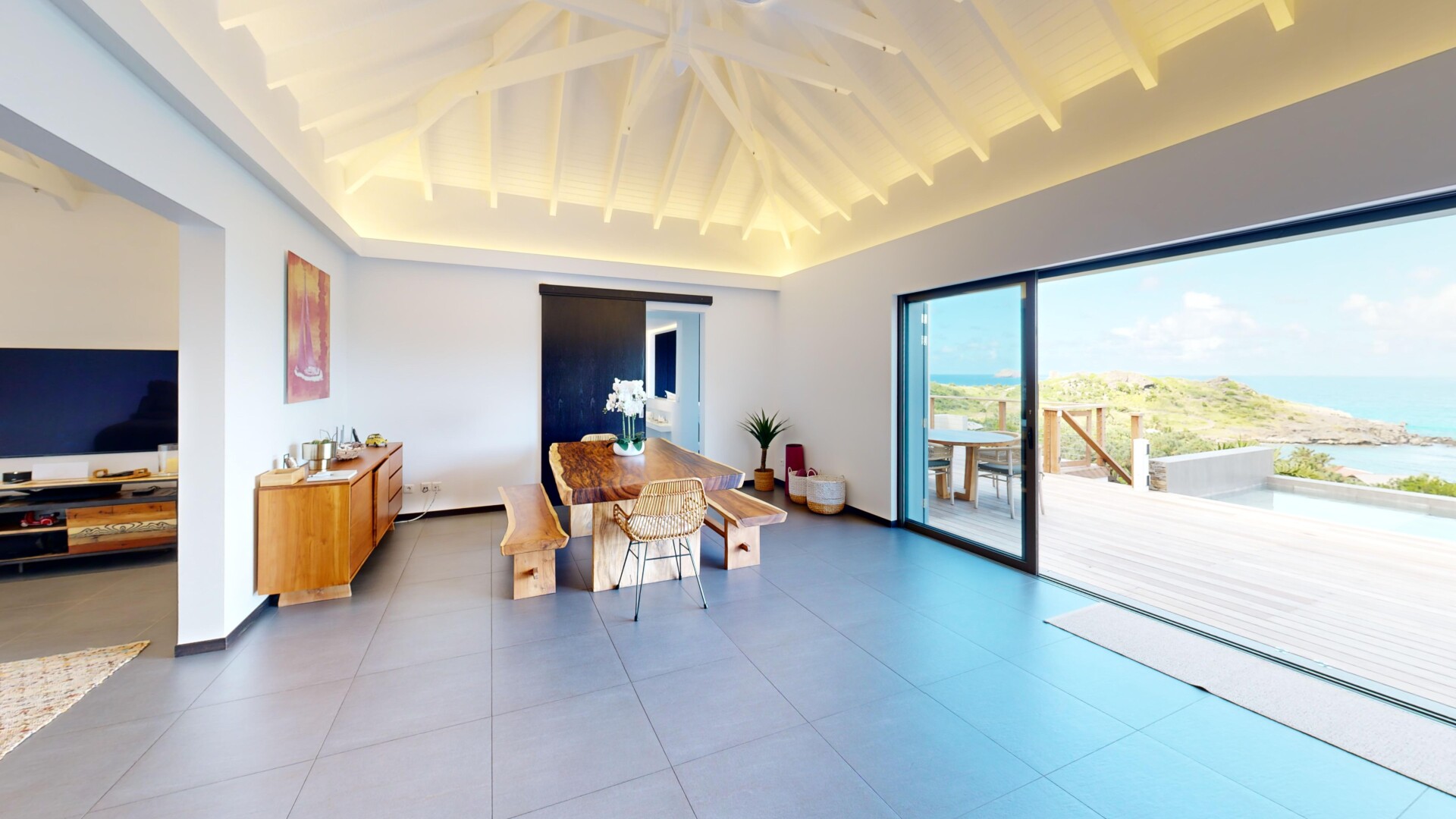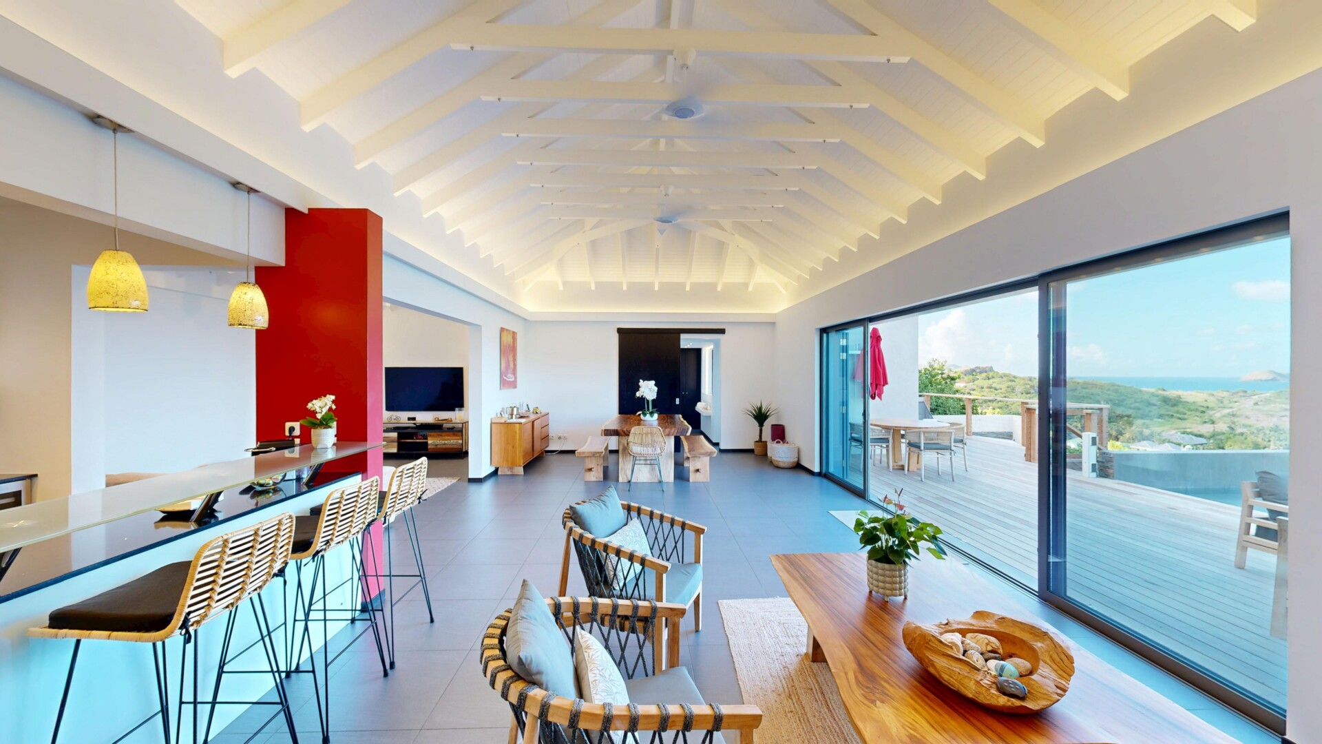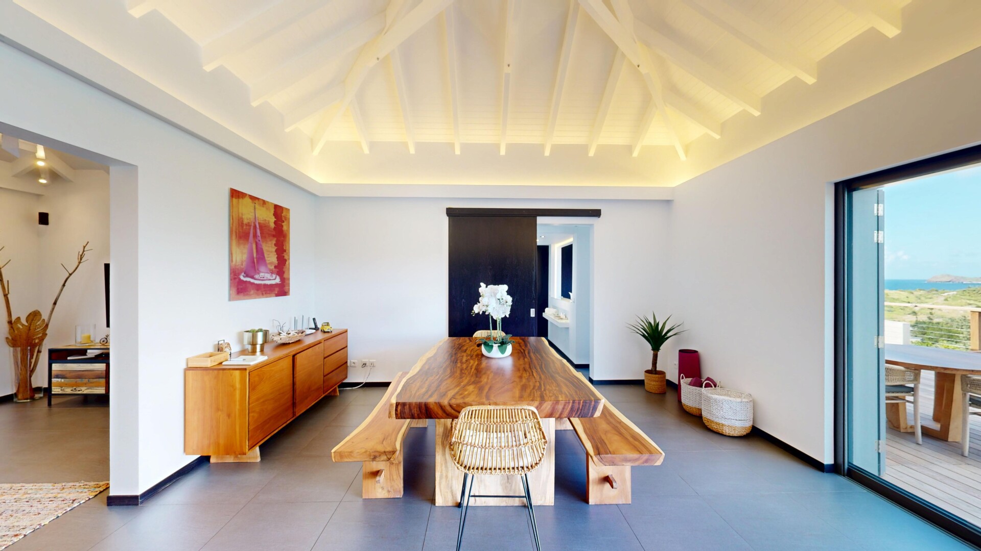 Villa Nita (ITA) is one of the island's finest examples of a new trend in St. Barth interior design and decor: a return to the stylized forms of the 1960's, blending yesterday's curve with today's angle, finding a harmony between the best of the past and the best of the present. Villa ITA does it right, and with a great view and central location as well.