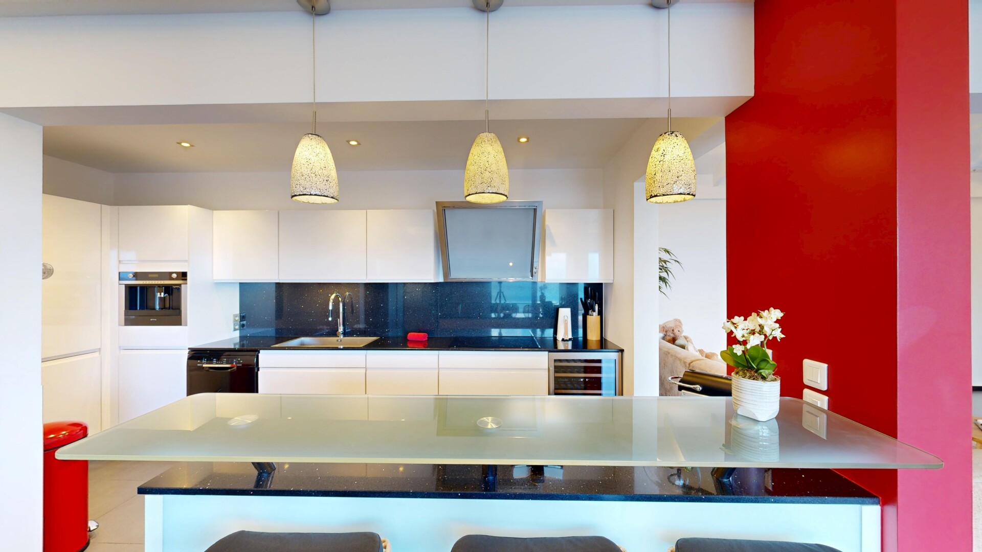 The main living area opens directly on the terrace and sparkling pool via two large sliding glass "hideaway" doors. To the rear of the living room is a separate home cinema room with a top-of-the-line HDTV, Bose surround sound system, and BluRay DVD. The kitchen is practical and stylish, with black countertops, side-by-side SMEG fridge and freezer, a wine-storage unit and many other convenient amenities.