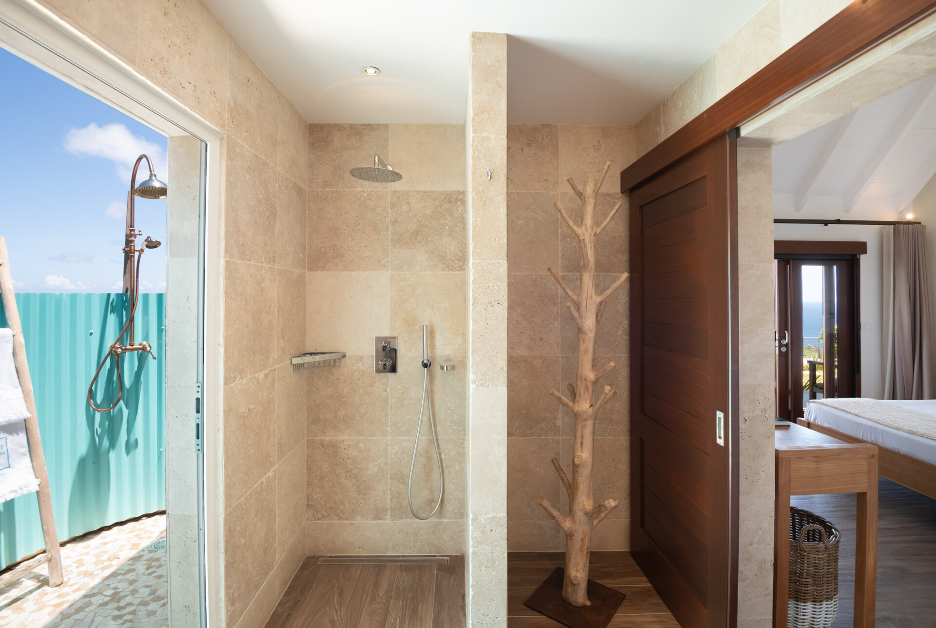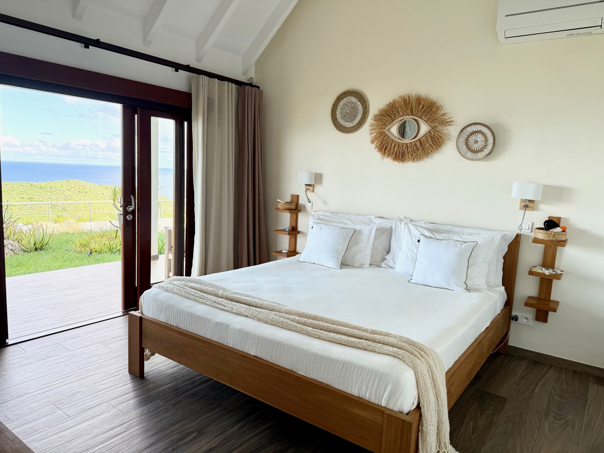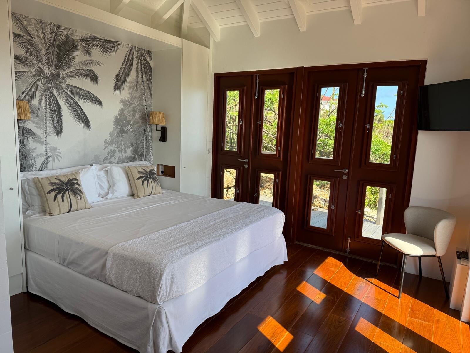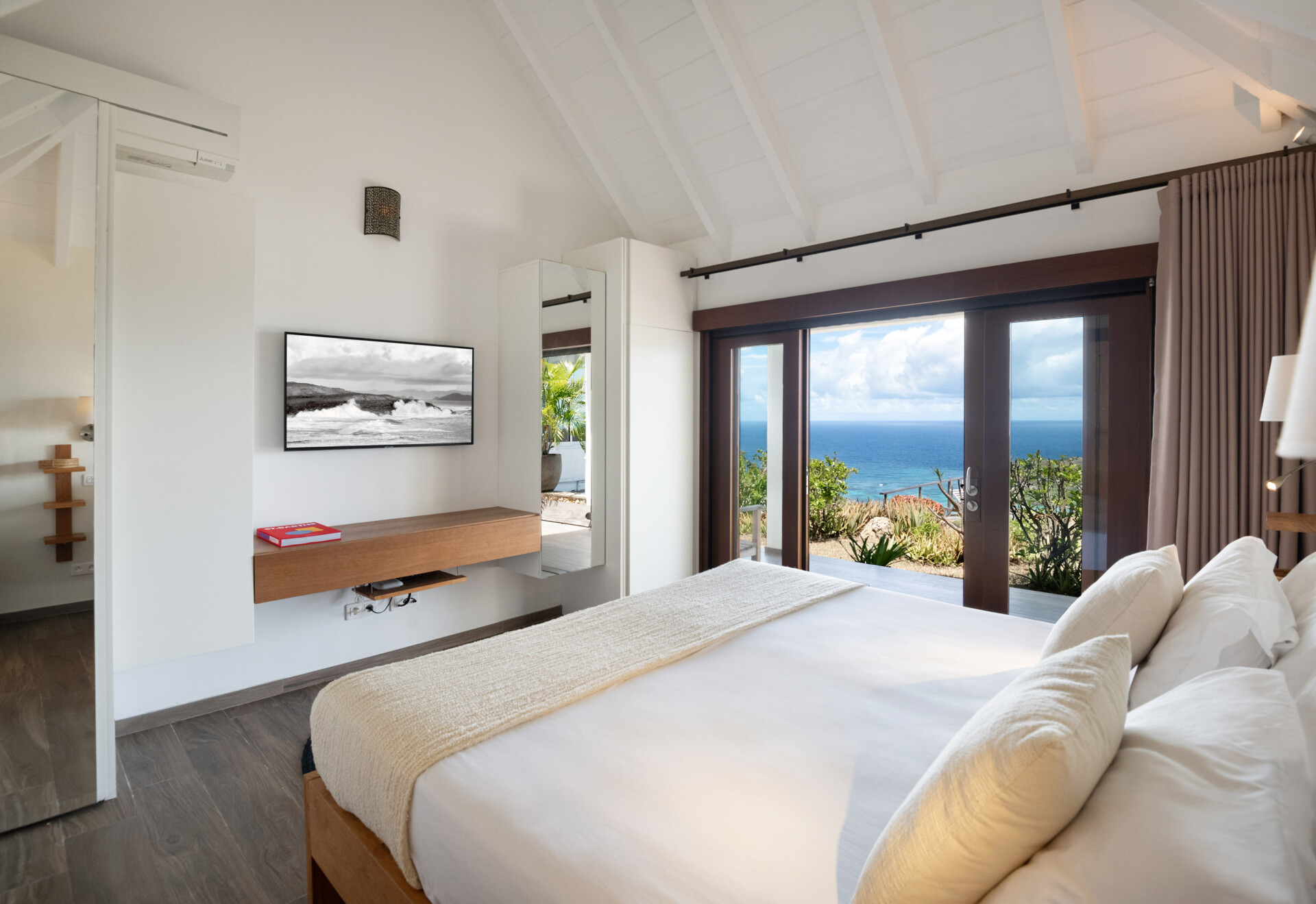 Two of the bedrooms are equal in size and comforts, which makes Villa Ocean Vibes a good choice for sharing with friends. The bedrooms are side by side in their own bungalow, which has a covered terrace. Both of them have his-and-hers closets, smart TVs, and ensuite bathrooms with indoor and outdoor showers. The third bedroom is in its own bungalow a few steps down in the garden.