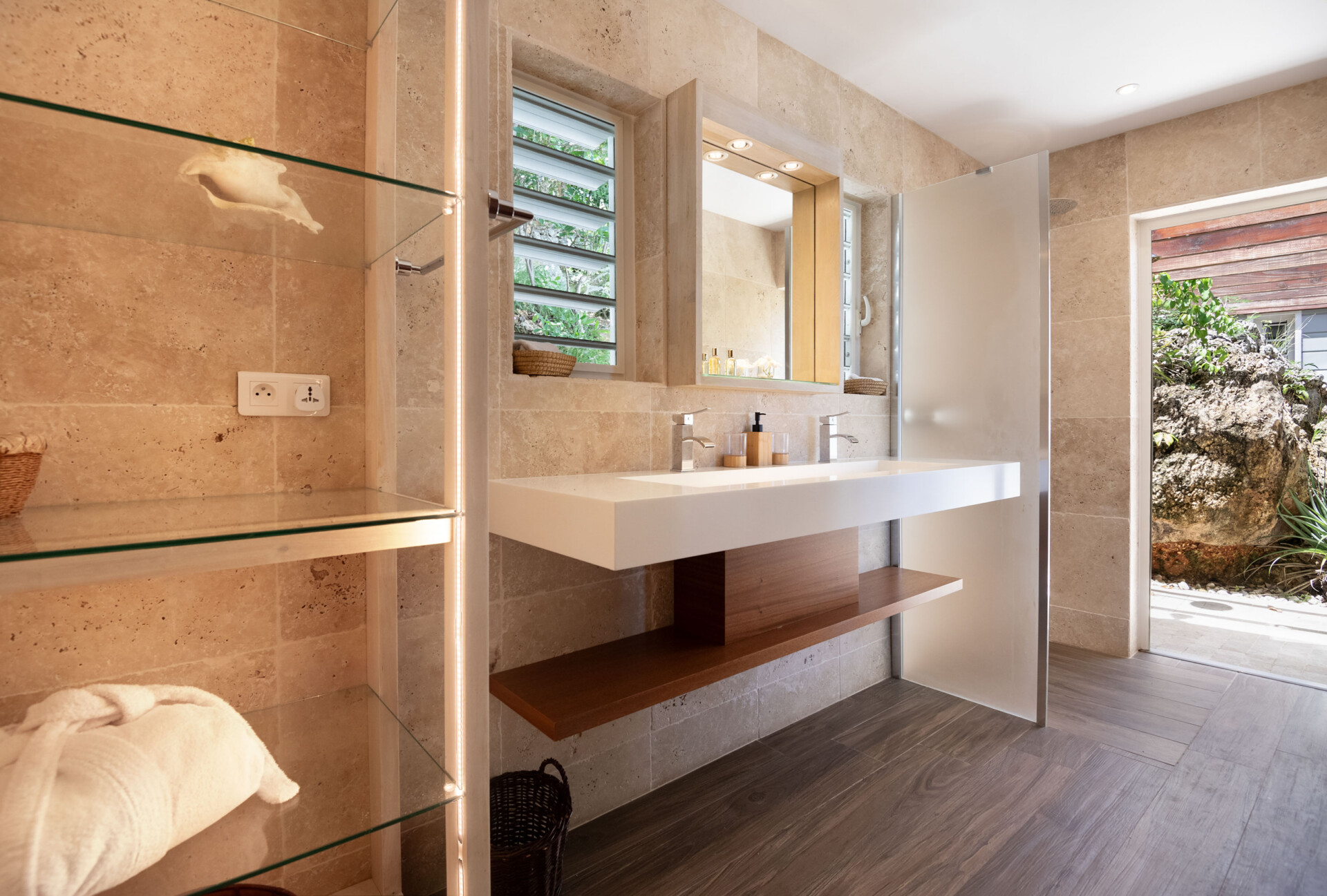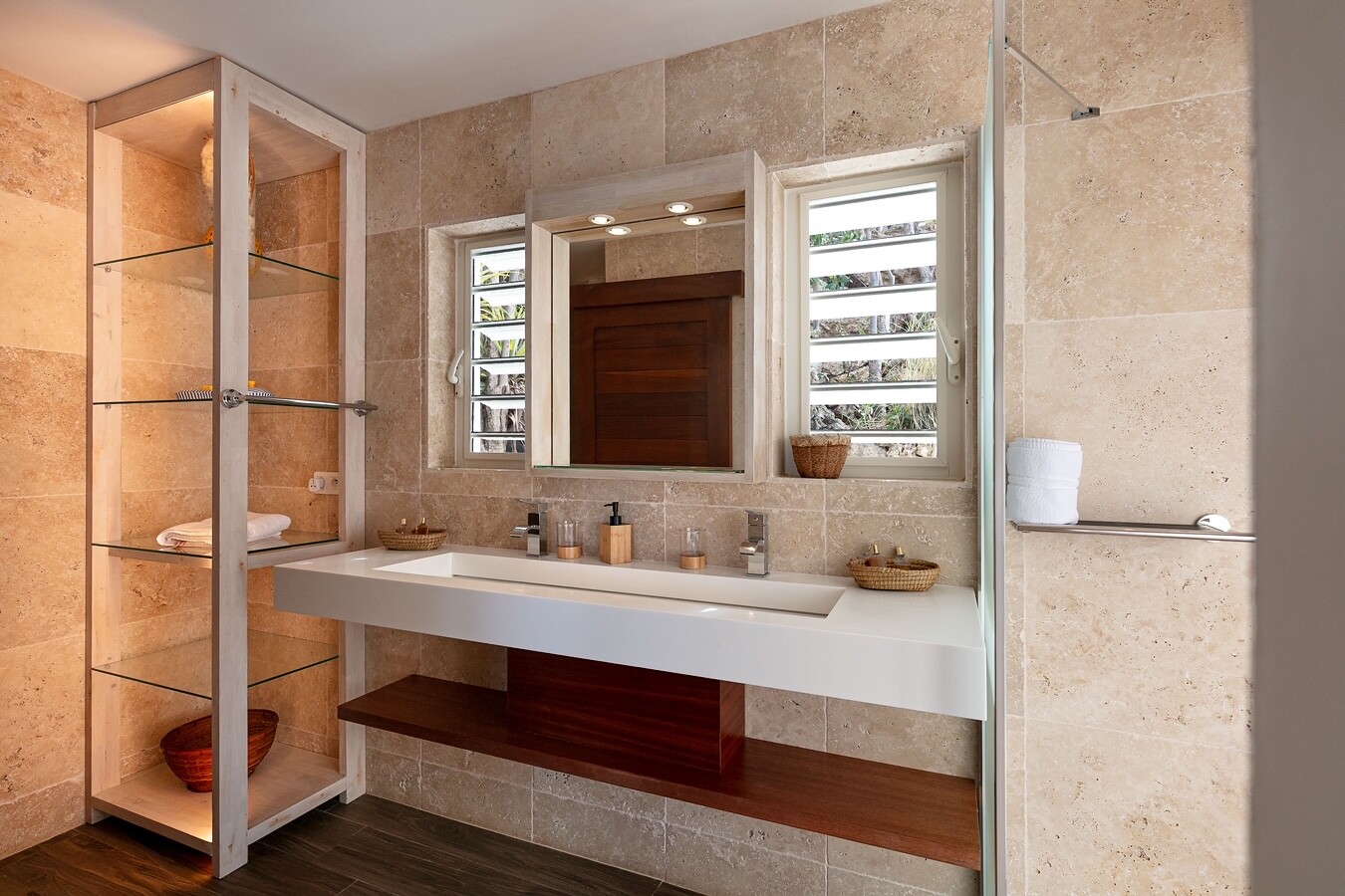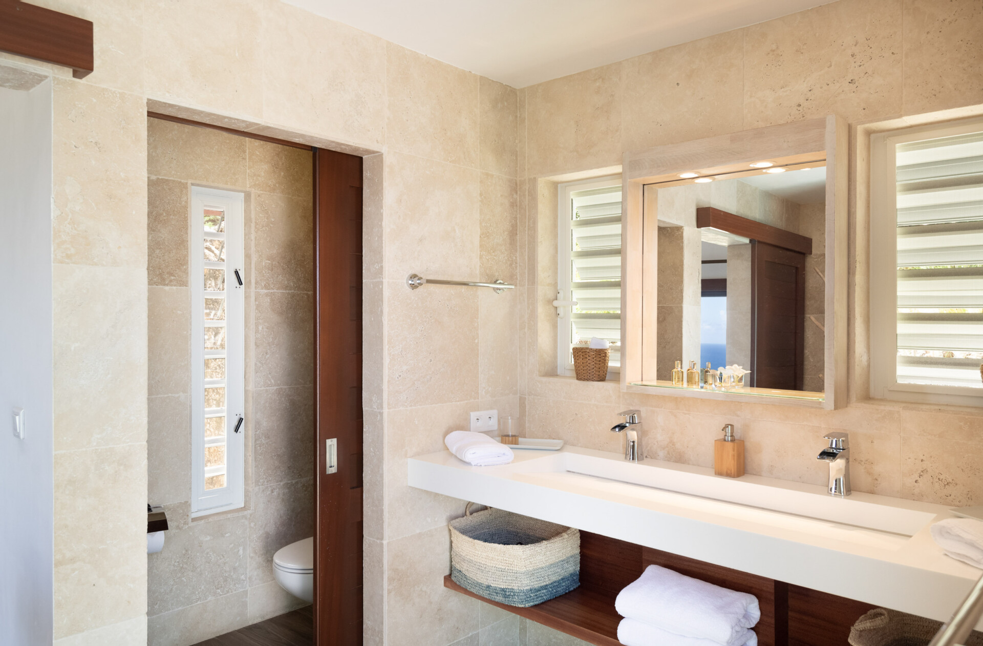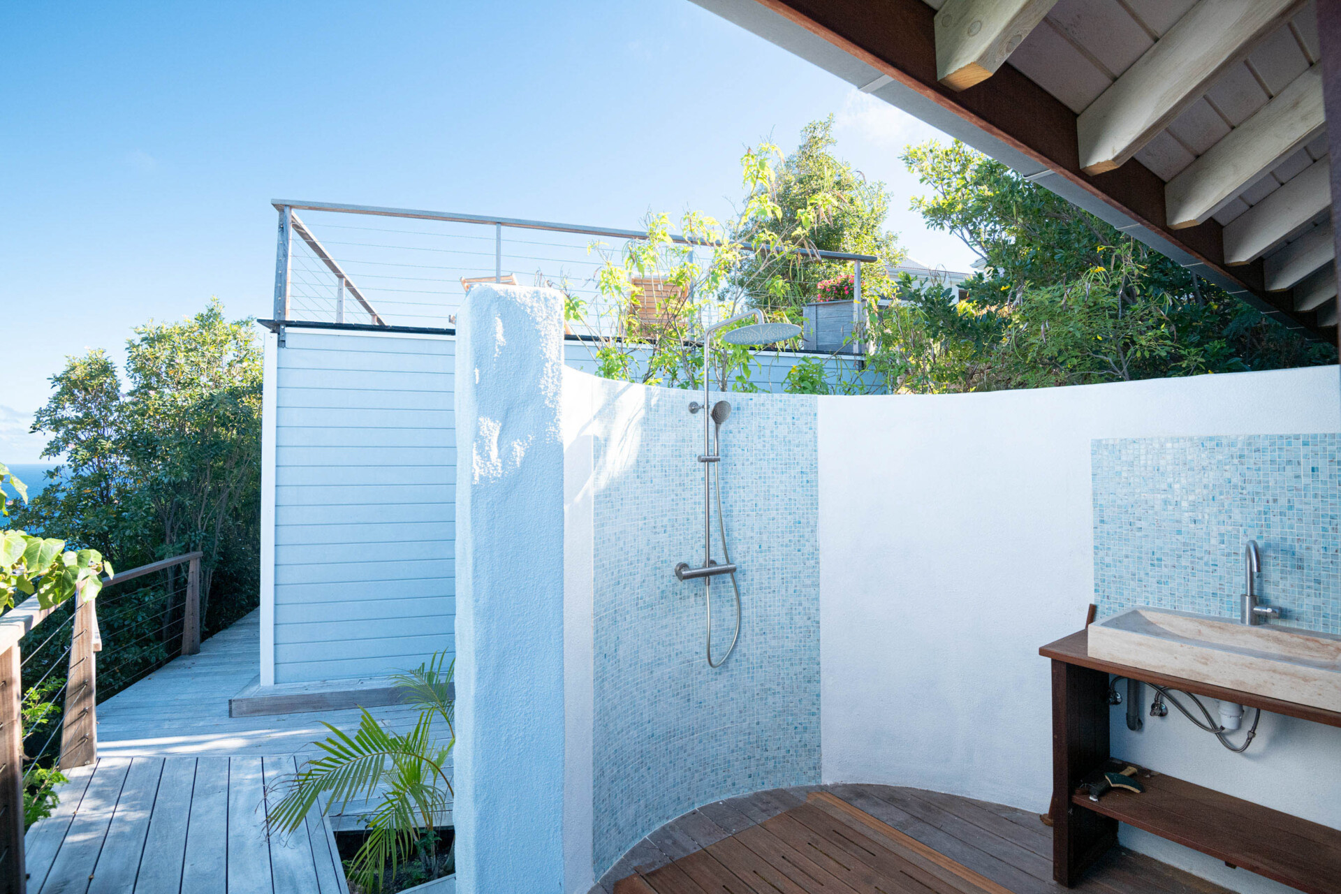 Two of the bedrooms are equal in size and comforts, which makes Villa Ocean Vibes a good choice for sharing with friends. The bedrooms are side by side in their own bungalow, which has a covered terrace. Both of them have his-and-hers closets, smart TVs, and ensuite bathrooms with indoor and outdoor showers. The third bedroom is in its own bungalow a few steps down in the garden.