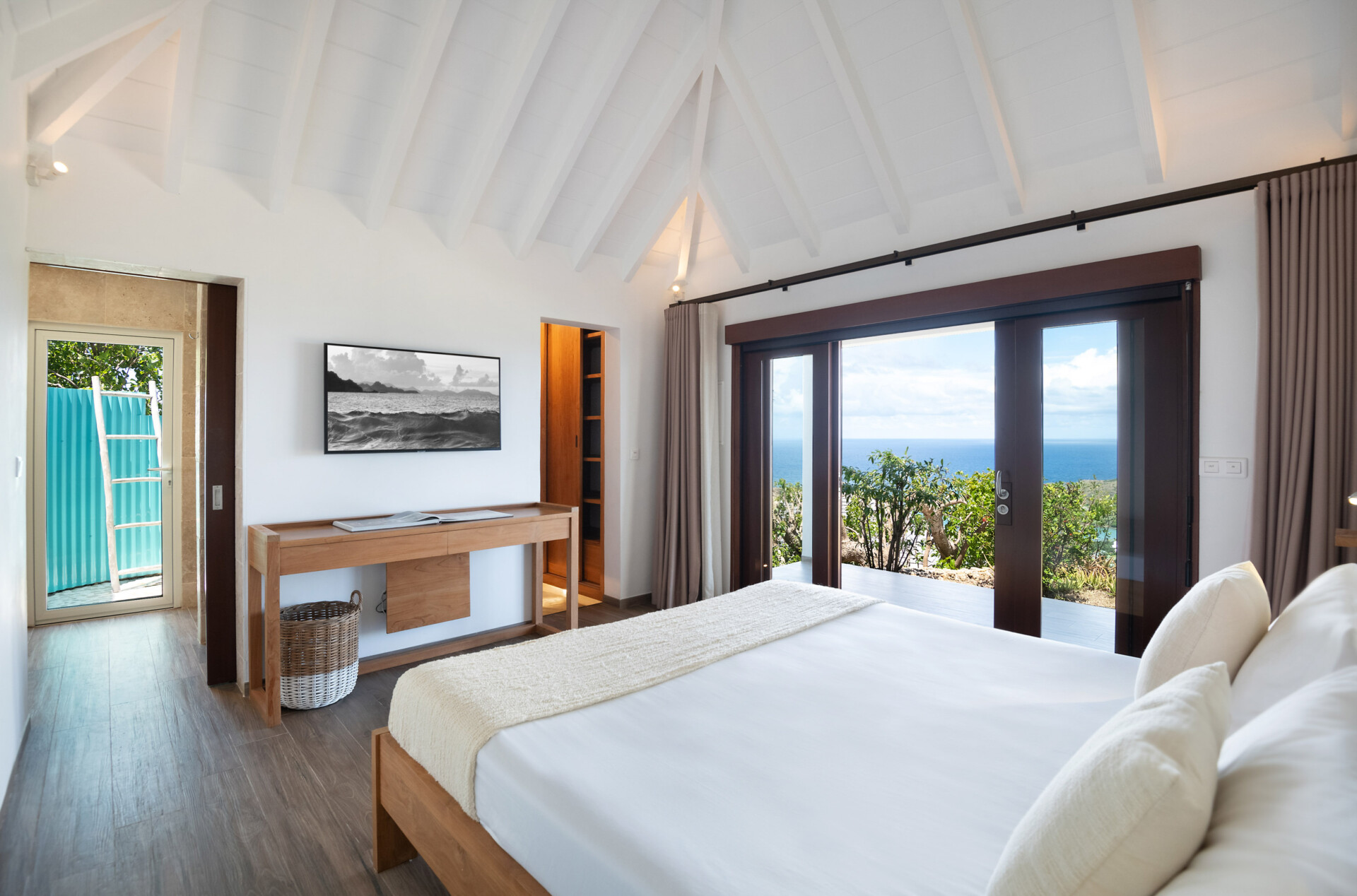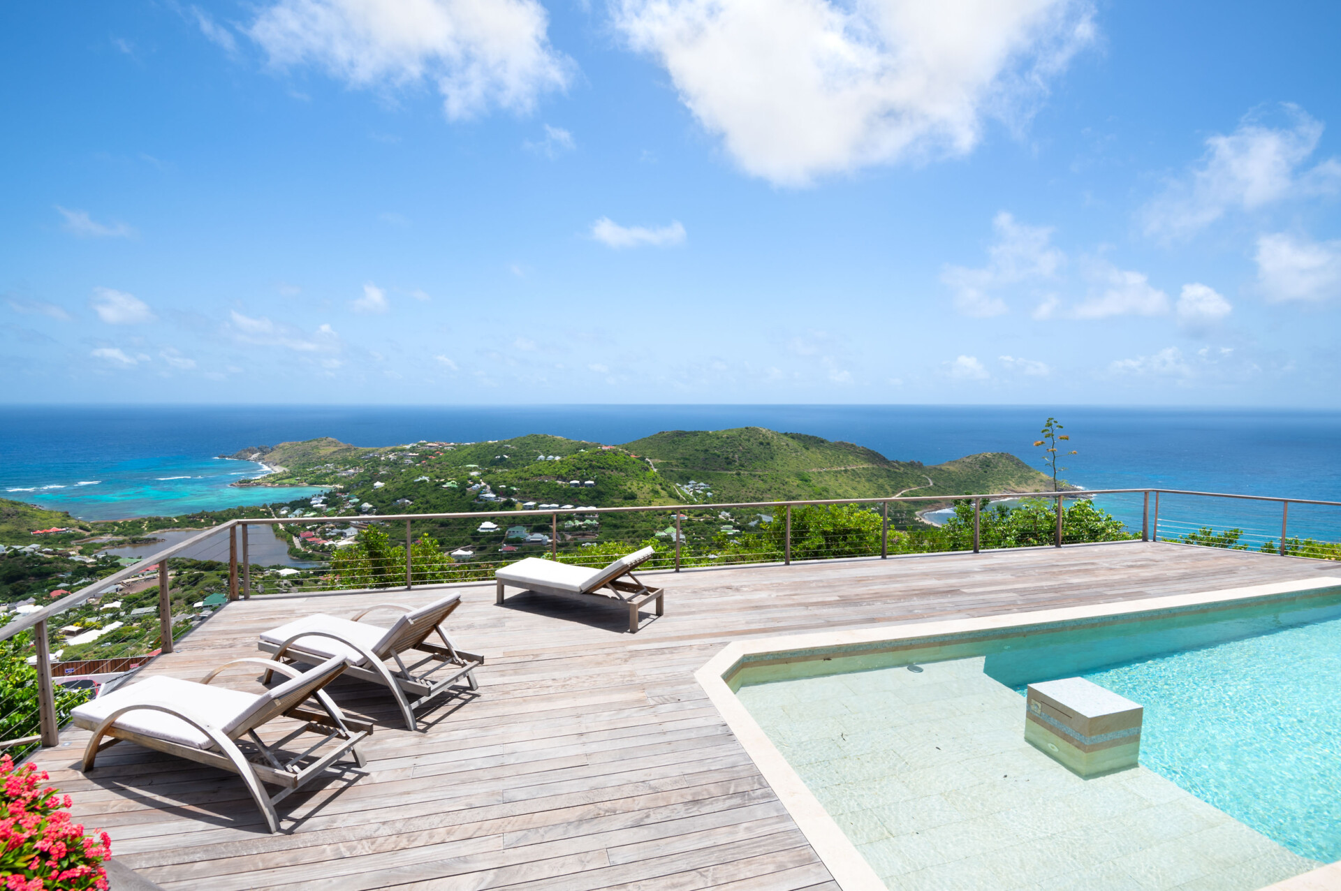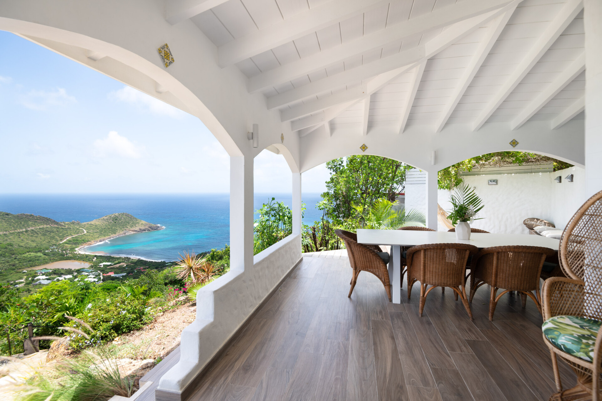The refreshing simplicity and sweetness of Villa Ocean Vibes (OCV) take us back to a simpler life on the island. Situated in Deve, in the hills of Vitet, the recently renovated luxury rental property has a very large pool area and terrace. Inside, there are closed-in living spaces, which include various places to lounge and enjoy the stunning ocean views that stretch from St. John to Toiny.