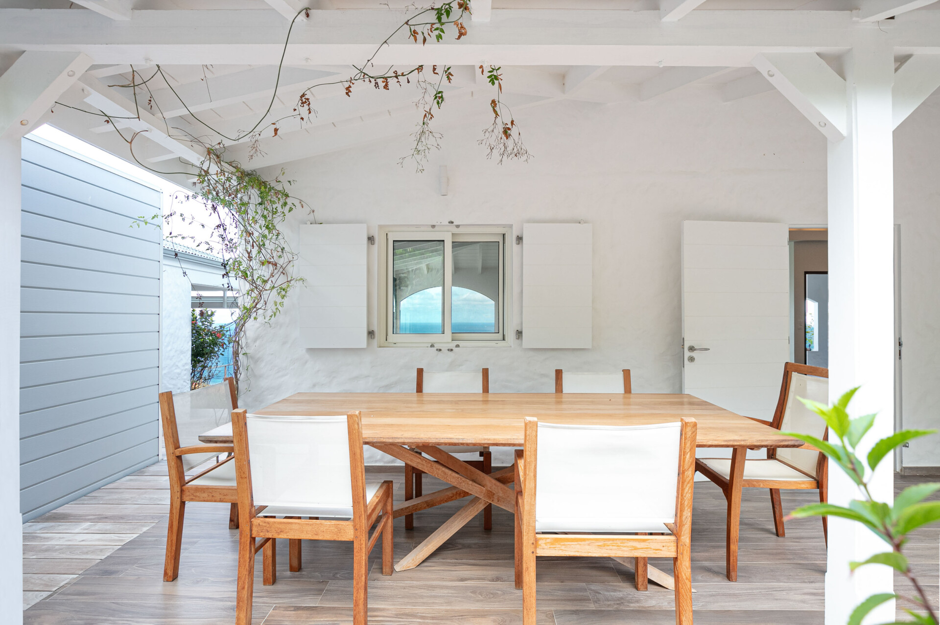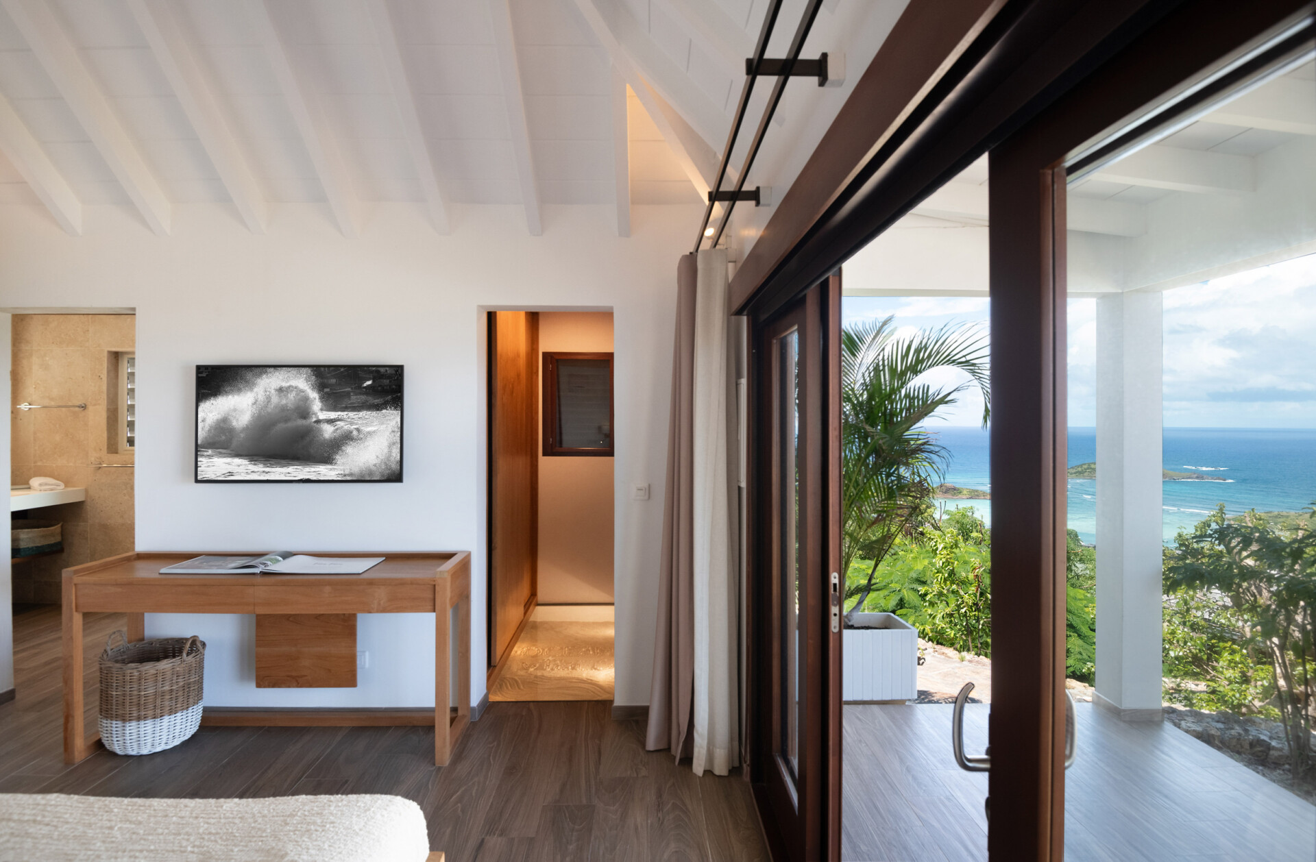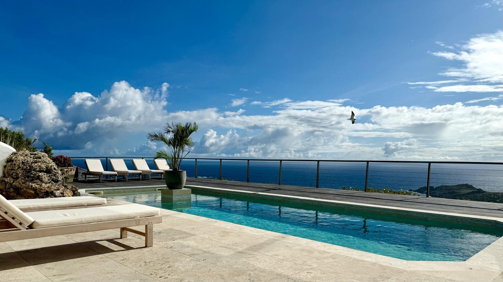 The refreshing simplicity and sweetness of Villa Ocean Vibes (OCV) take us back to a simpler life on the island. Situated in Deve, in the hills of Vitet, the recently renovated luxury rental property has a very large pool area and terrace. Inside, there are closed-in living spaces, which include various places to lounge and enjoy the stunning ocean views that stretch from St. John to Toiny.
