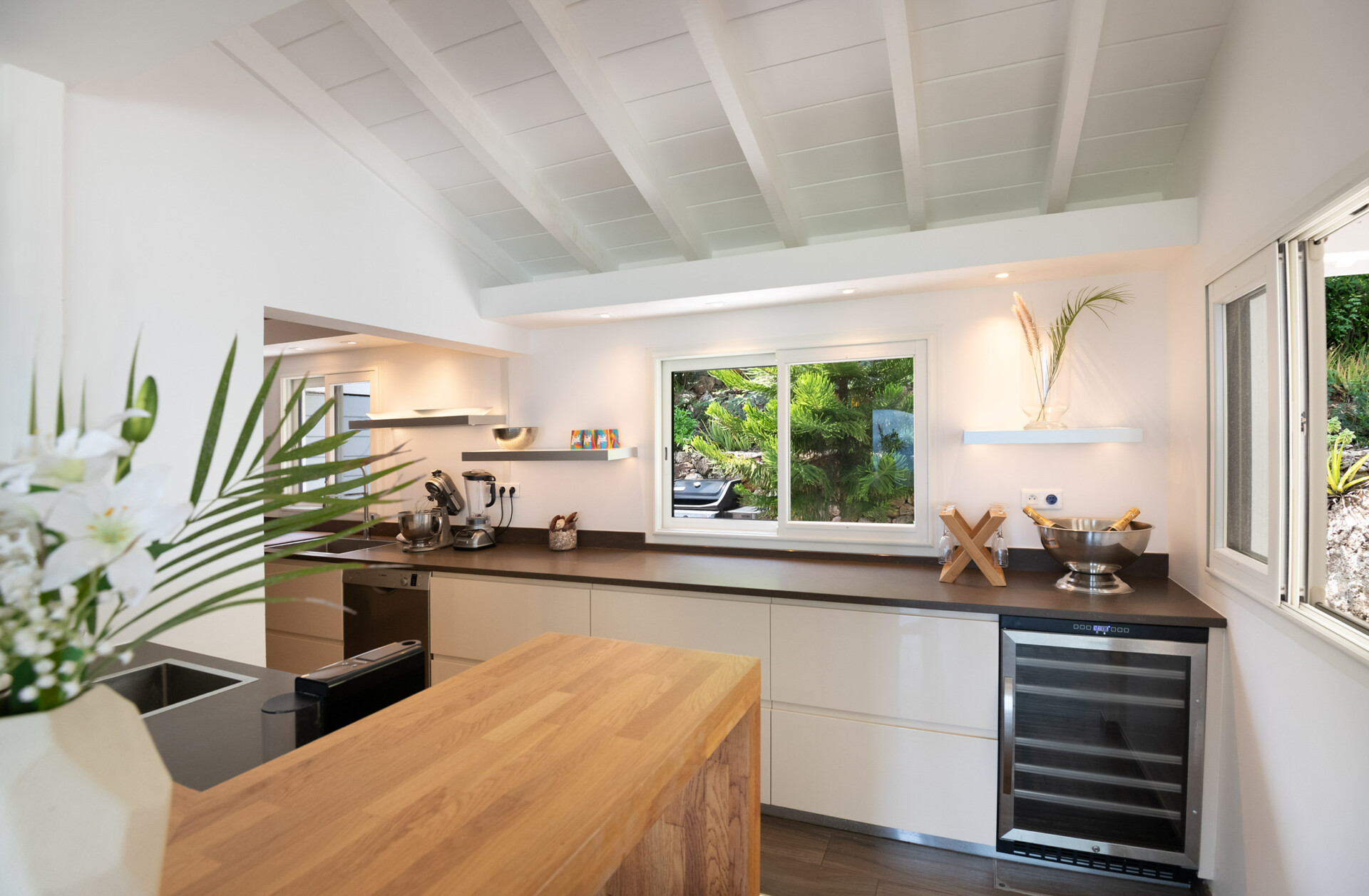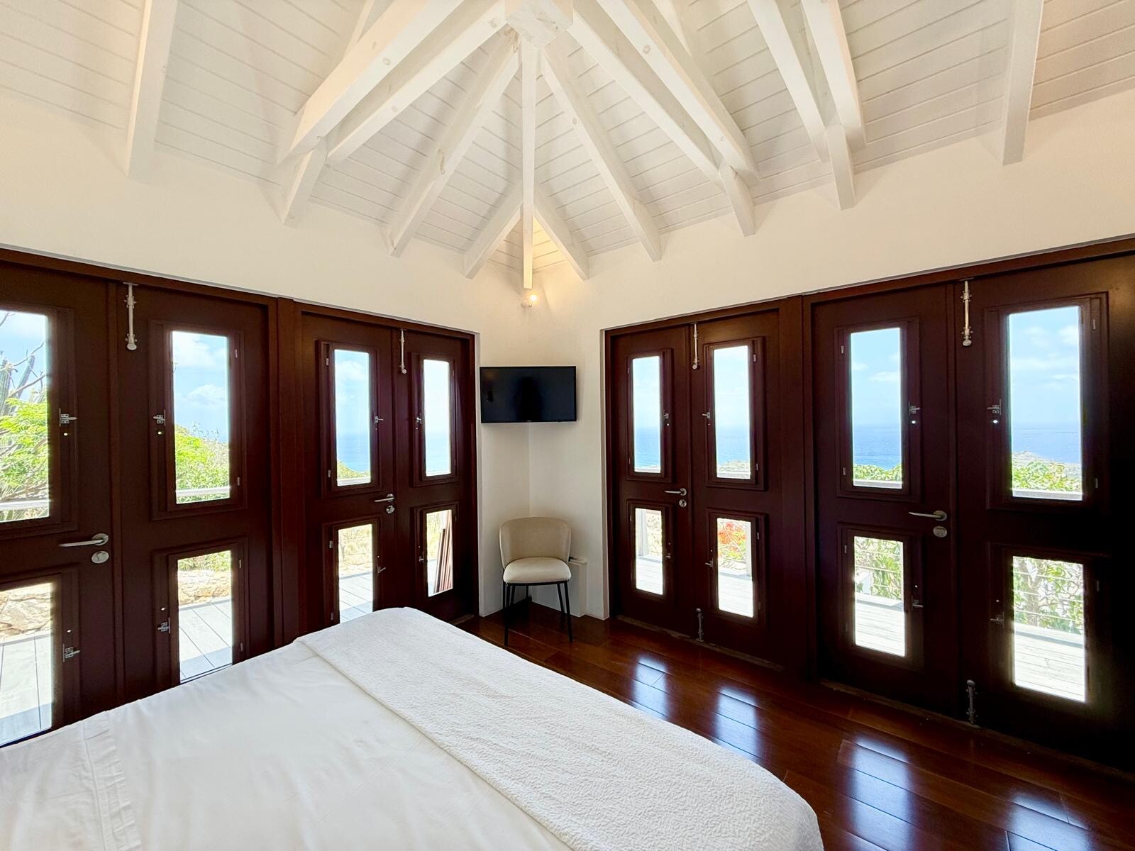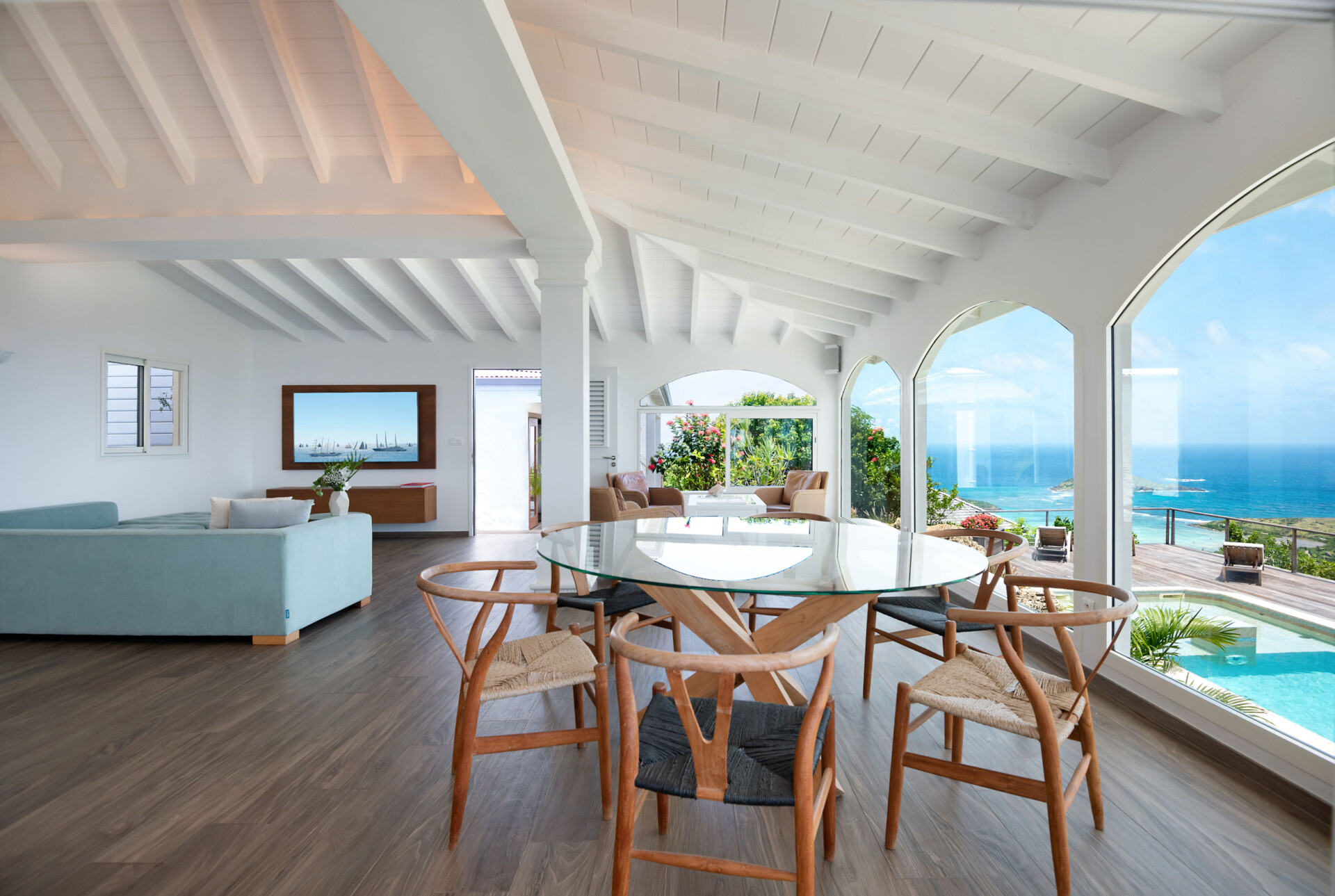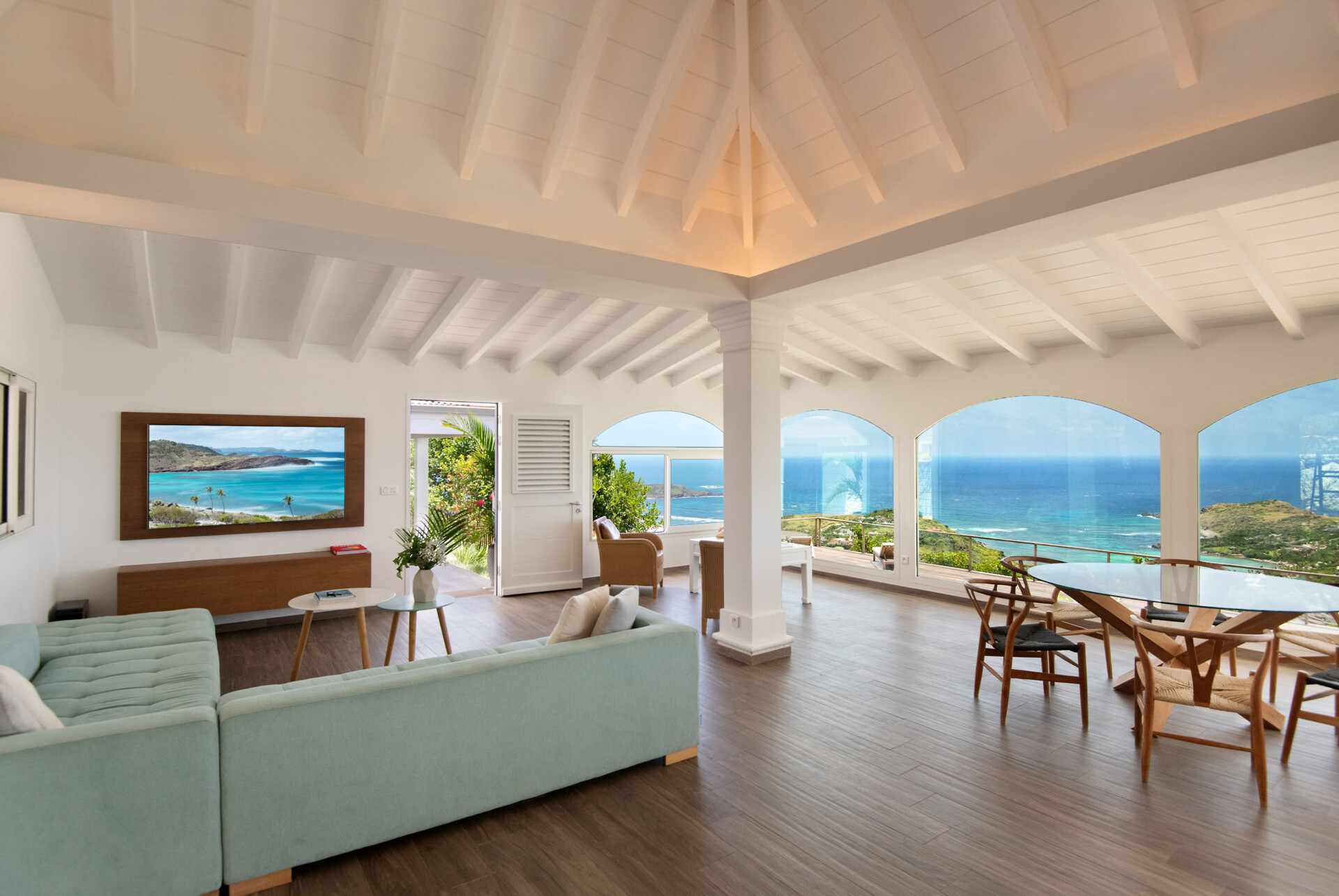 In the main room, in front of those floor-to-ceiling arched windows, there is a seating area with a large couch in the back, more seating in the front, a TV, and an indoor dining table. The big, well-equipped kitchen in the back enjoys the same lovely views. There is an outdoor dining area that also has that view, plus a second that’s in the garden and sheltered from inclement weather.