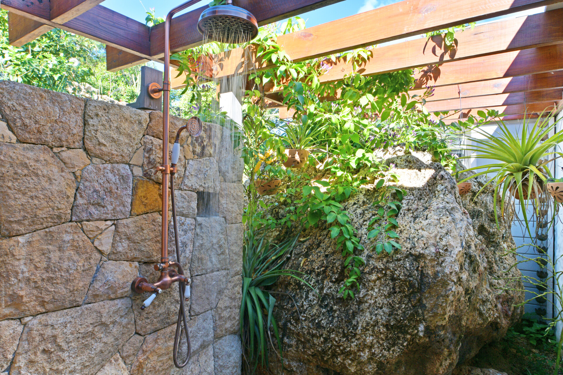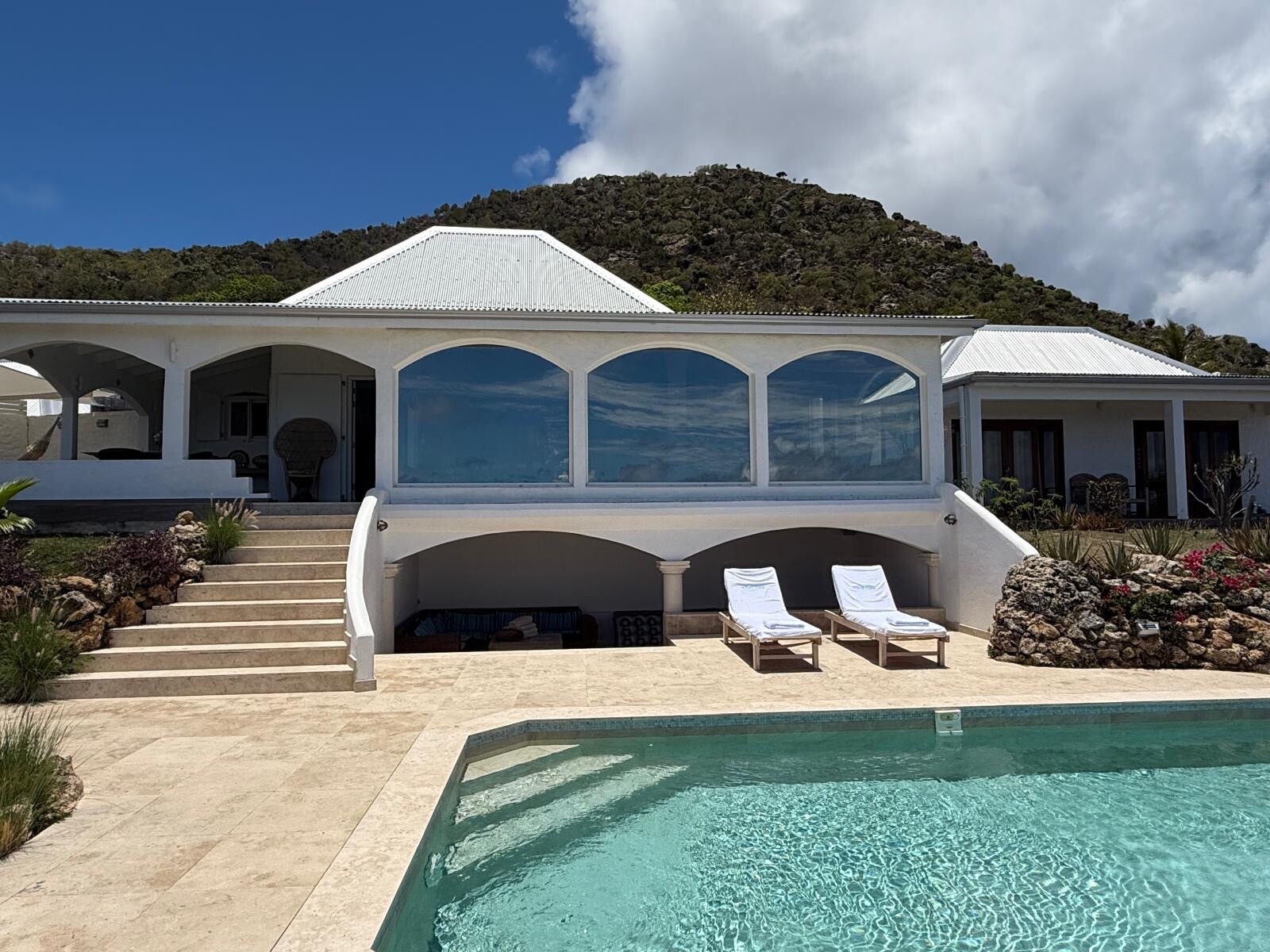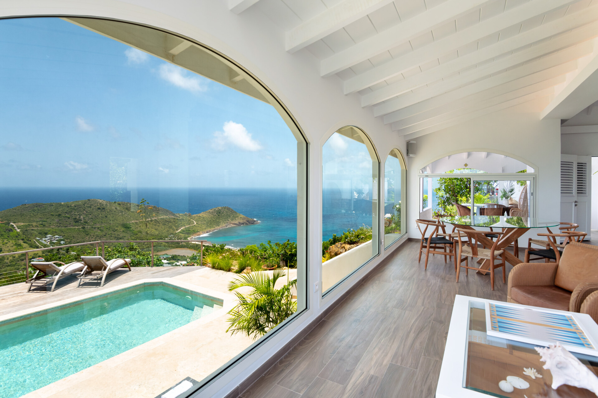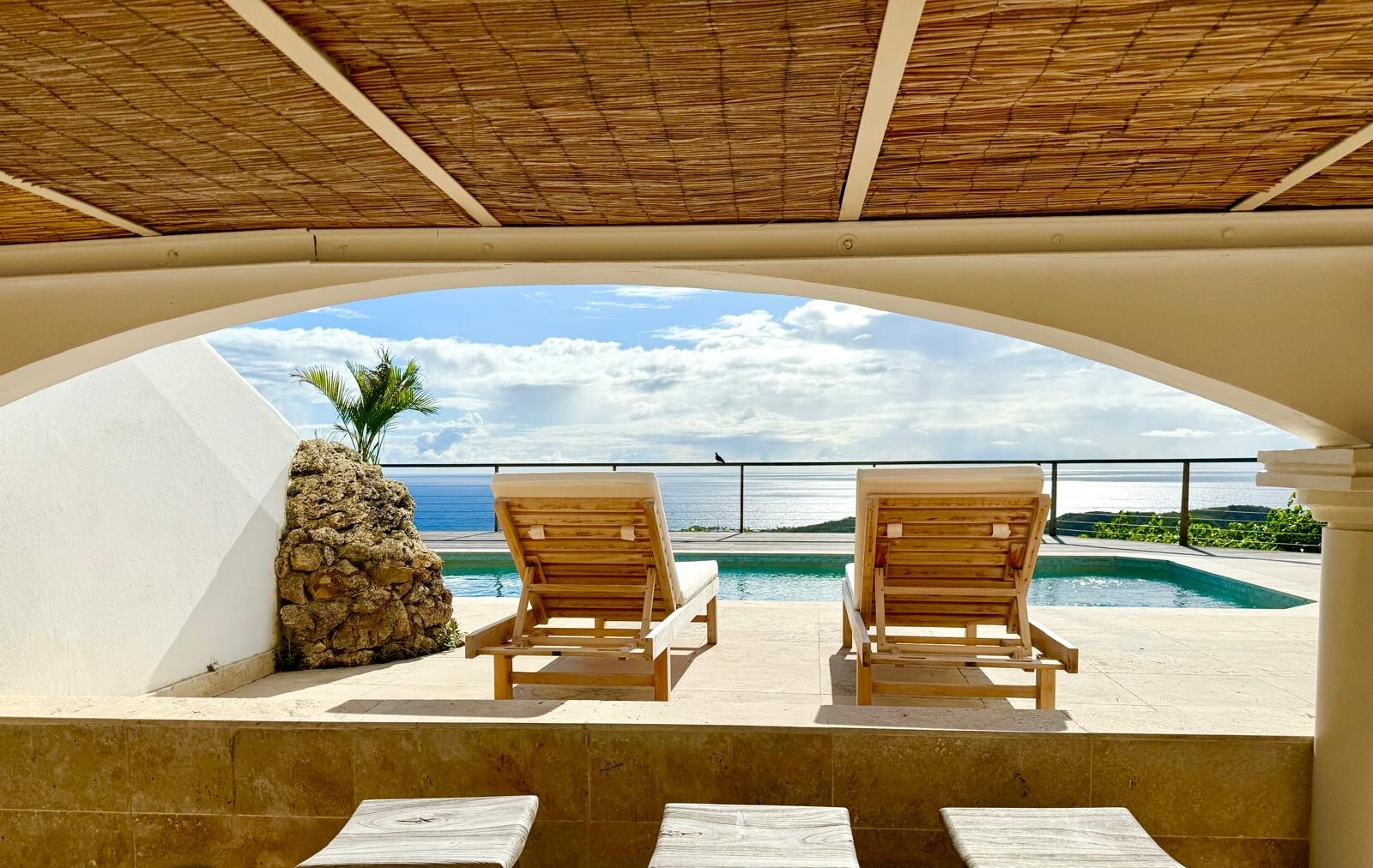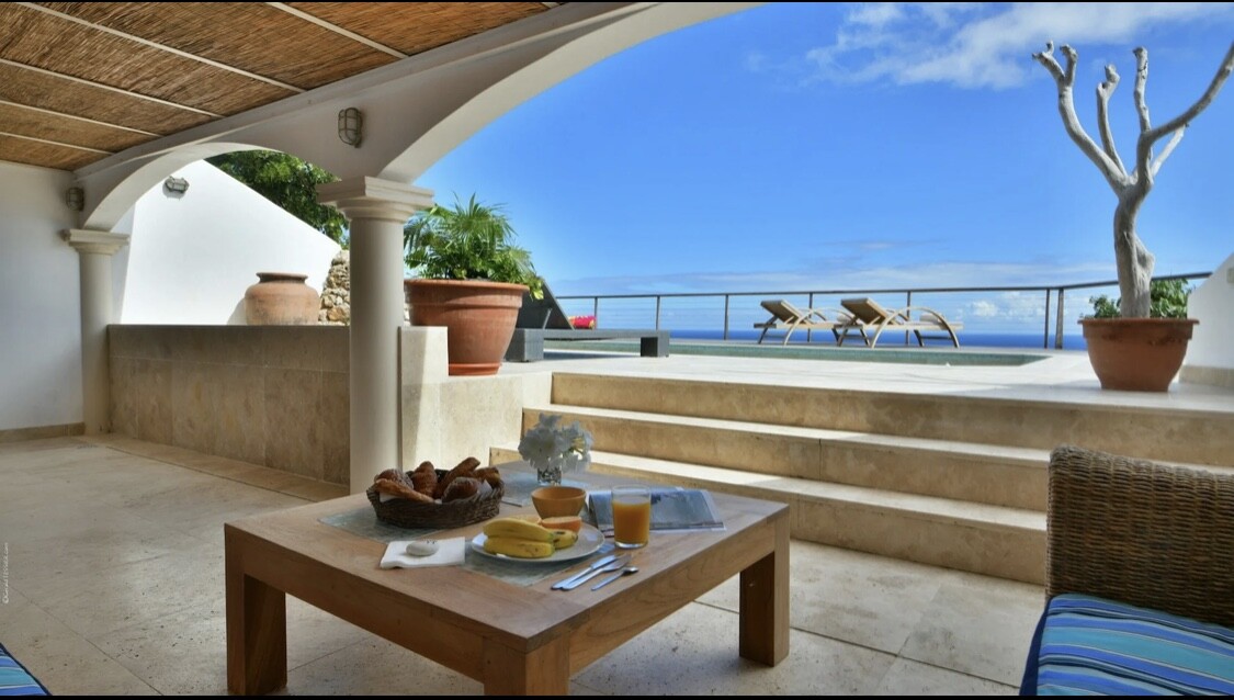 Along with having a general, pleasingly vintage feel, Villa Ocean Vibes is distinguished by the arched windows in the living room. This unique feature gives the vacation house a special feeling inside. One level below that, with the large sundeck and the heated swimming pool, those arches are repeated to create a covered sitting area where guests can enjoy a break from the Caribbean sun.