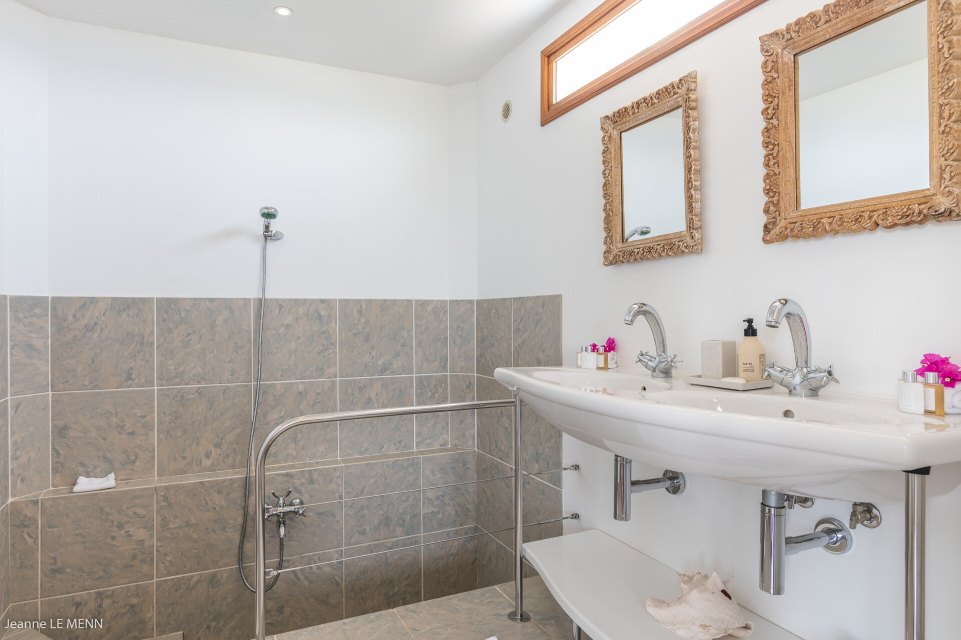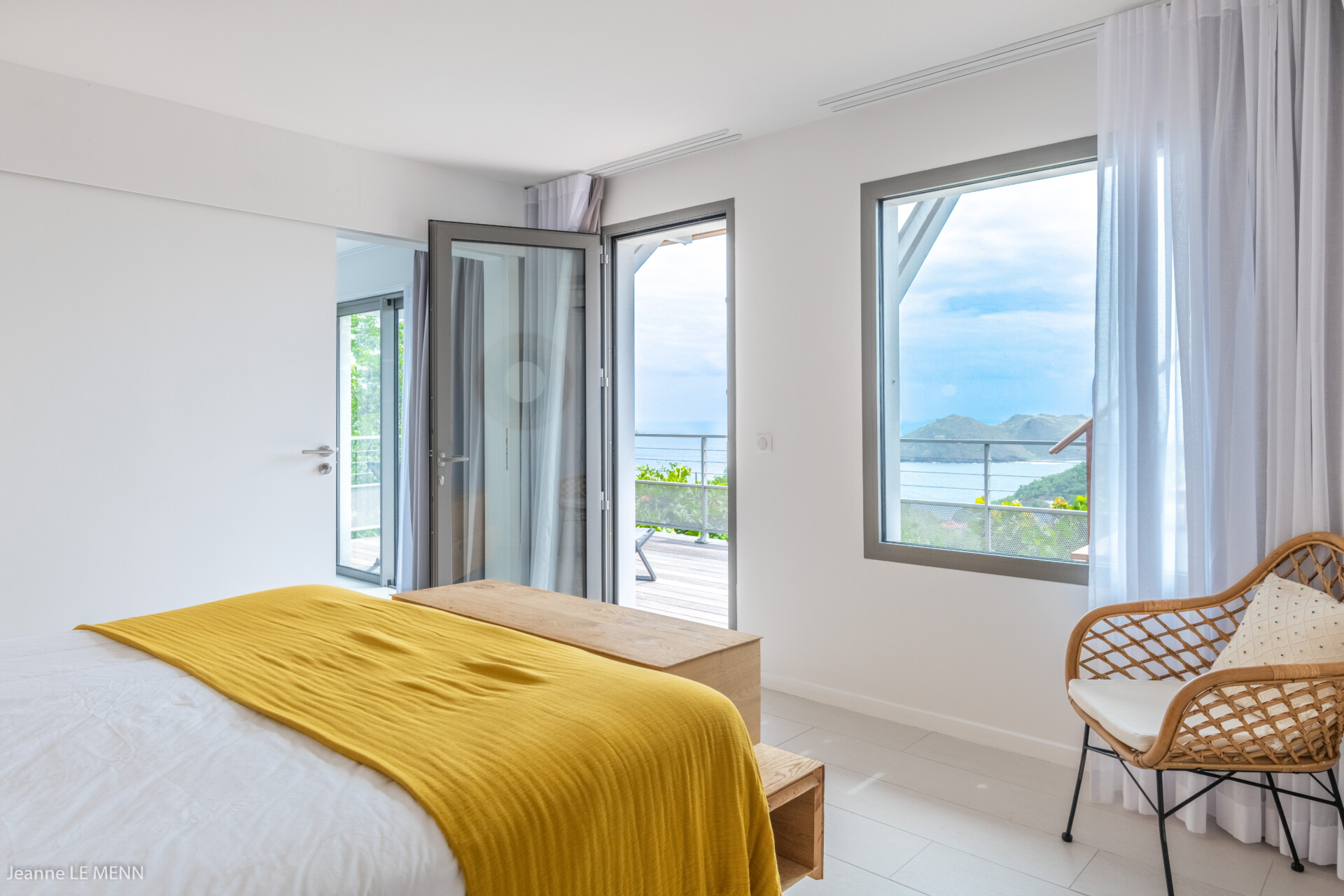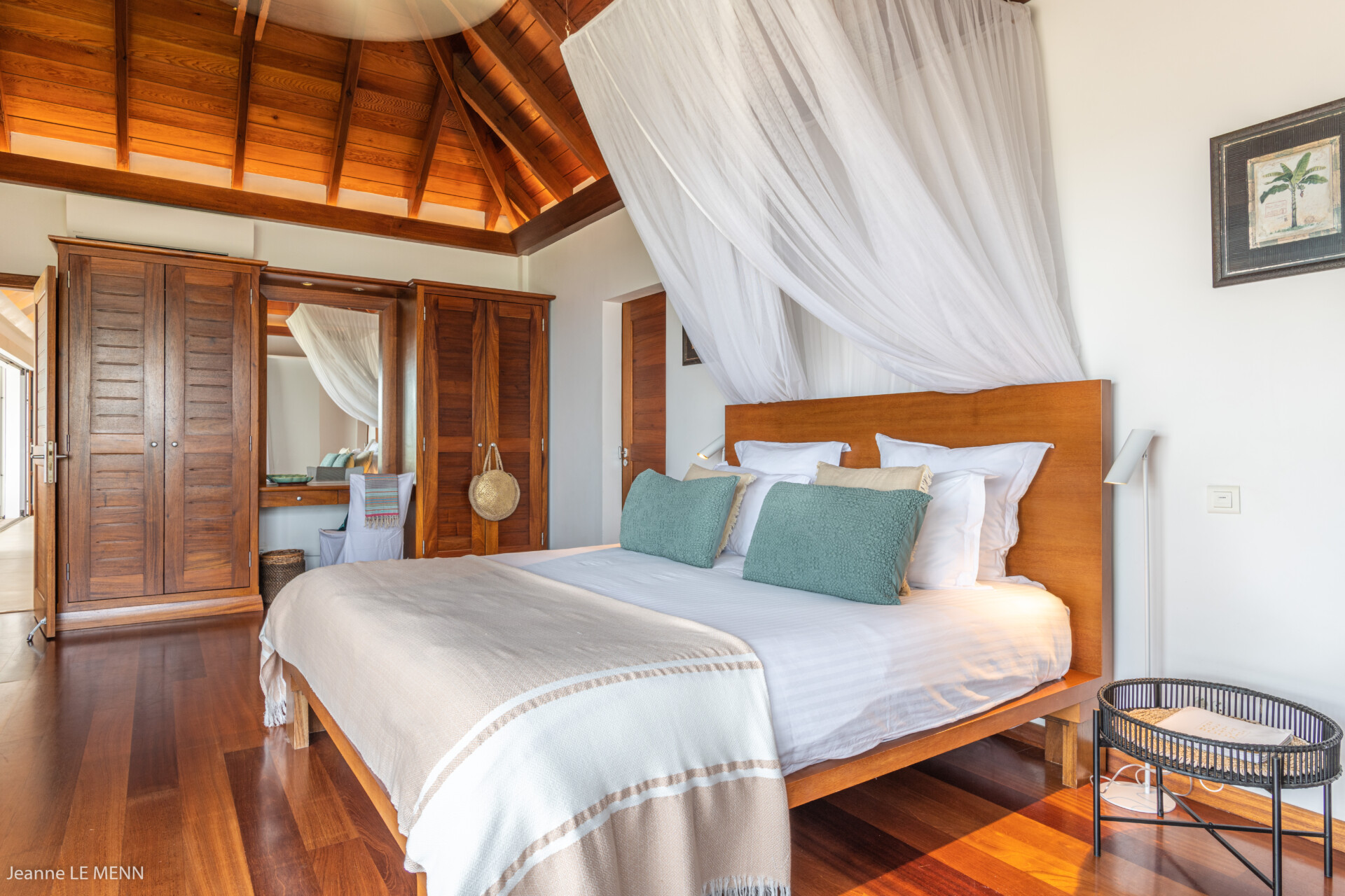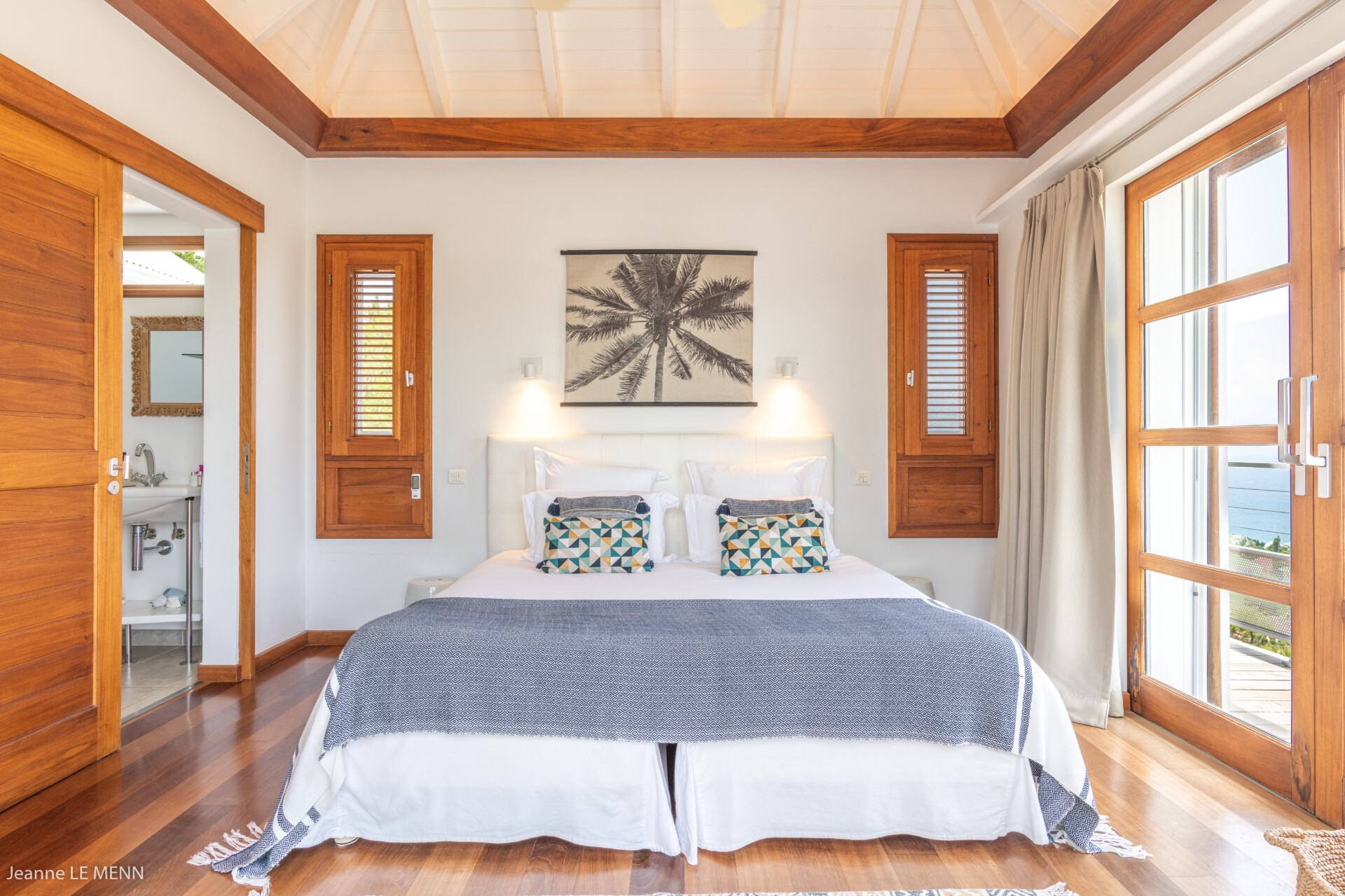 The romantic master bedroom contains a king bed and elegantly appointed bathroom. Along with two more of the bedrooms, it has picture windows on two sides, creating postcard views of the island and sea. The two guest bedrooms connect, which makes them especially appealing for families with young children. A fourth bedroom is quite comfortable, with a queen bed, next to the guest bathroom and outdoor shower, making it best suited to young children or a nanny. A newly appointed fifth bedroom is situated downstairs.