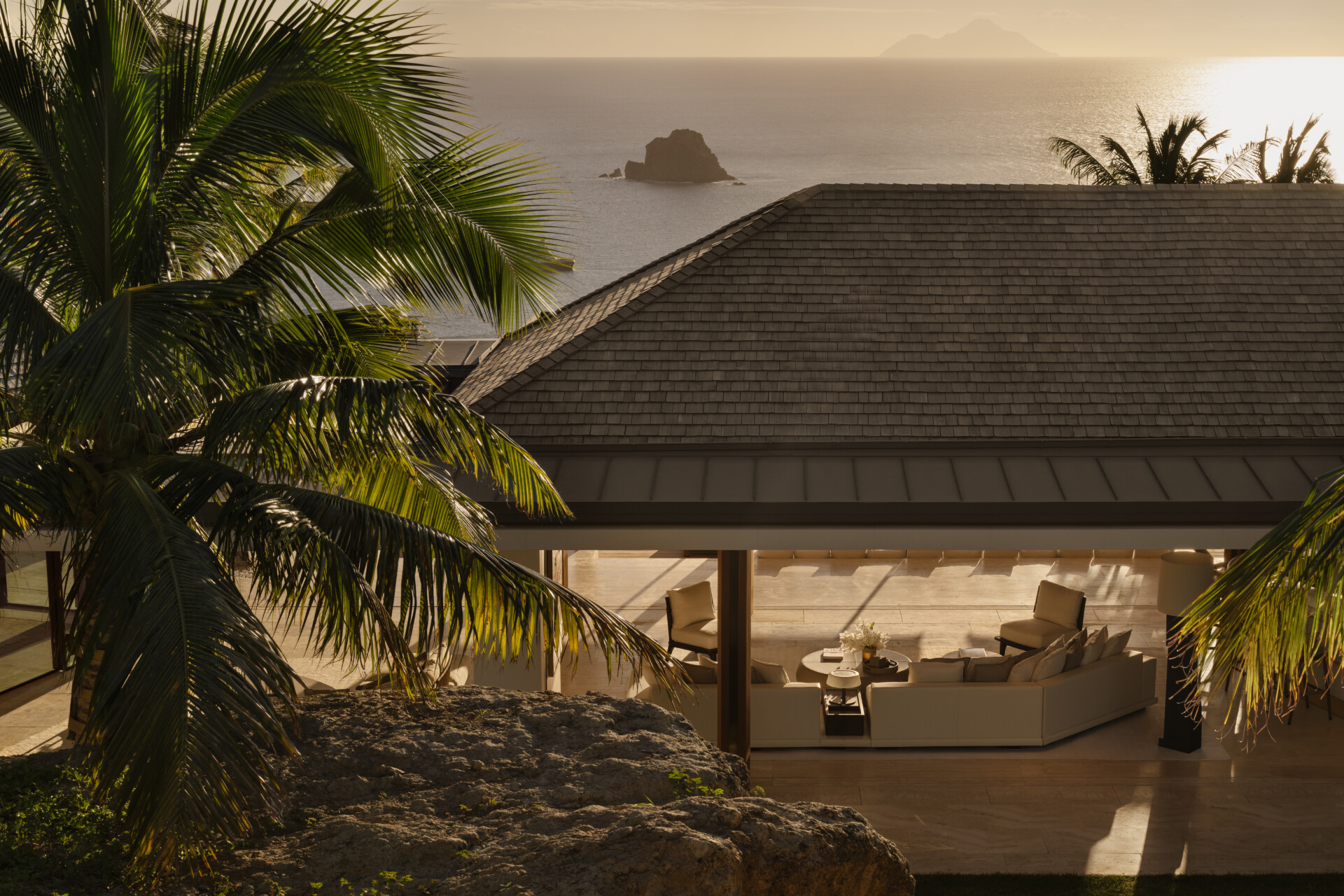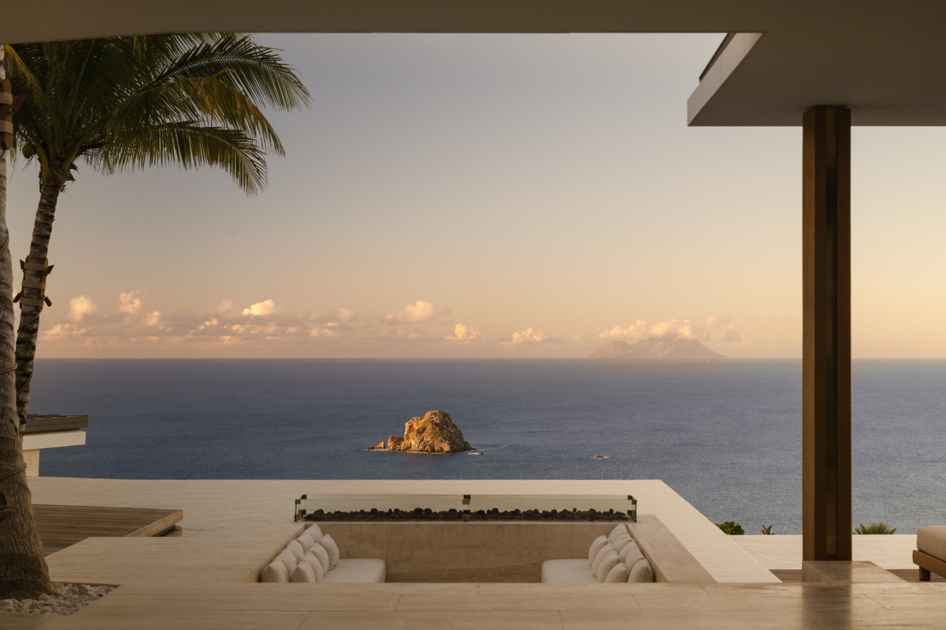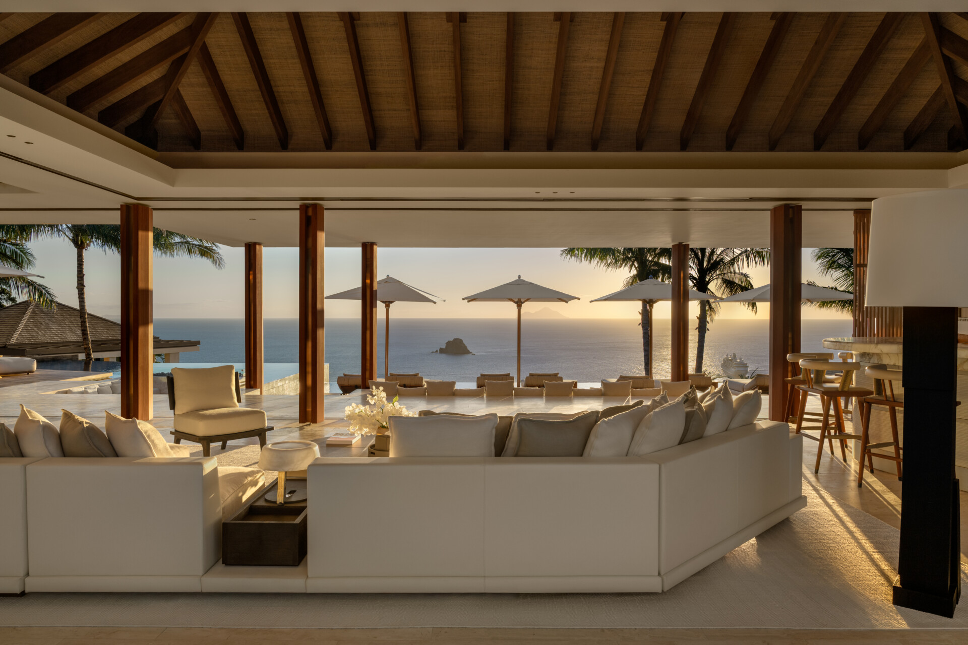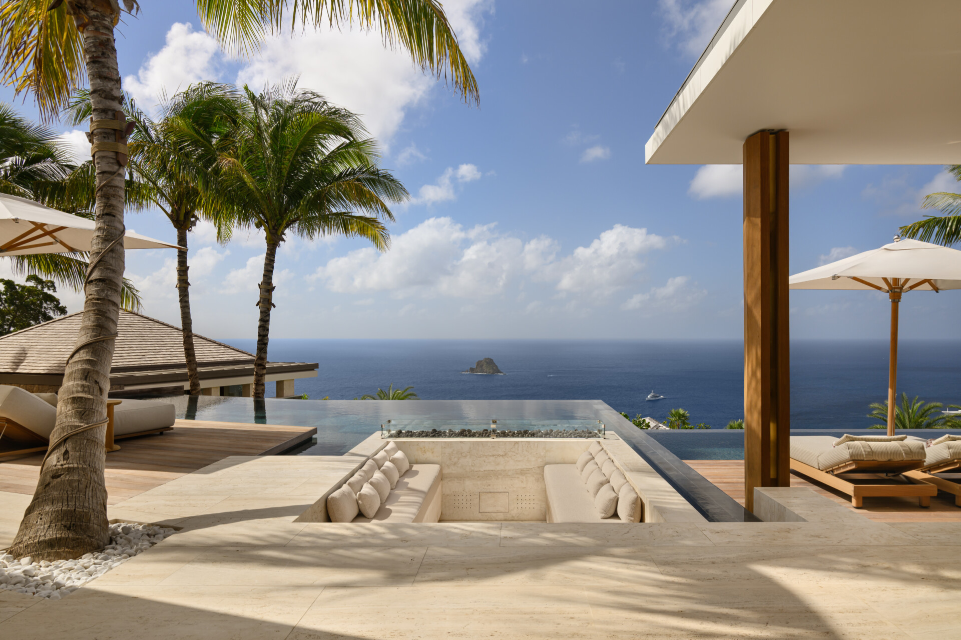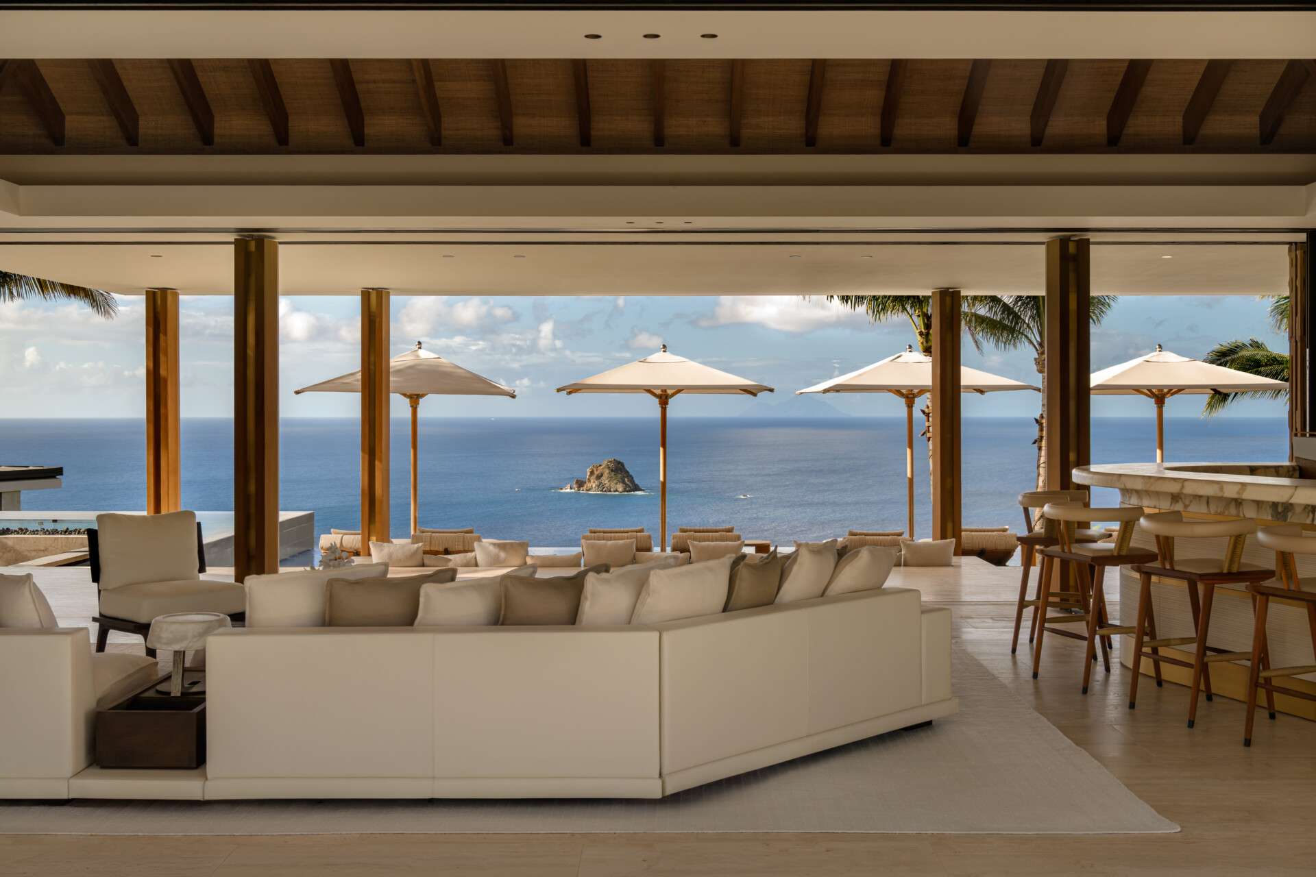 At the highest crest of Colombier, where the horizon opens wide and the sea stretches endlessly toward Flamands and the protected shores of Colombier, Villa Omai Zilé commands one of the most extraordinary vantage points on St. Barth. Sunrise arrives in quiet brilliance. Sunset lingers in molten gold. From every angle, the villa engages in a living dialogue with sea and sky.