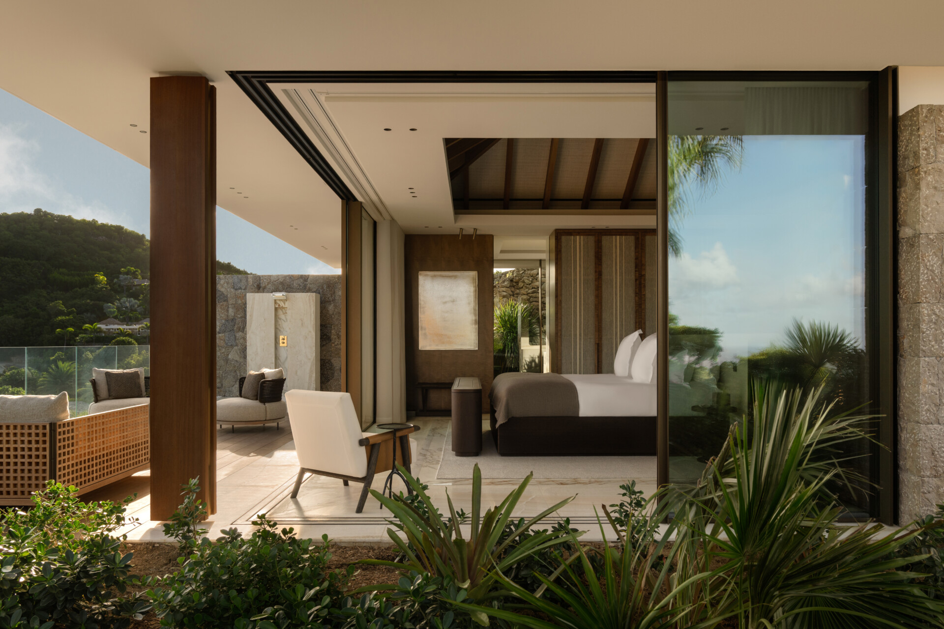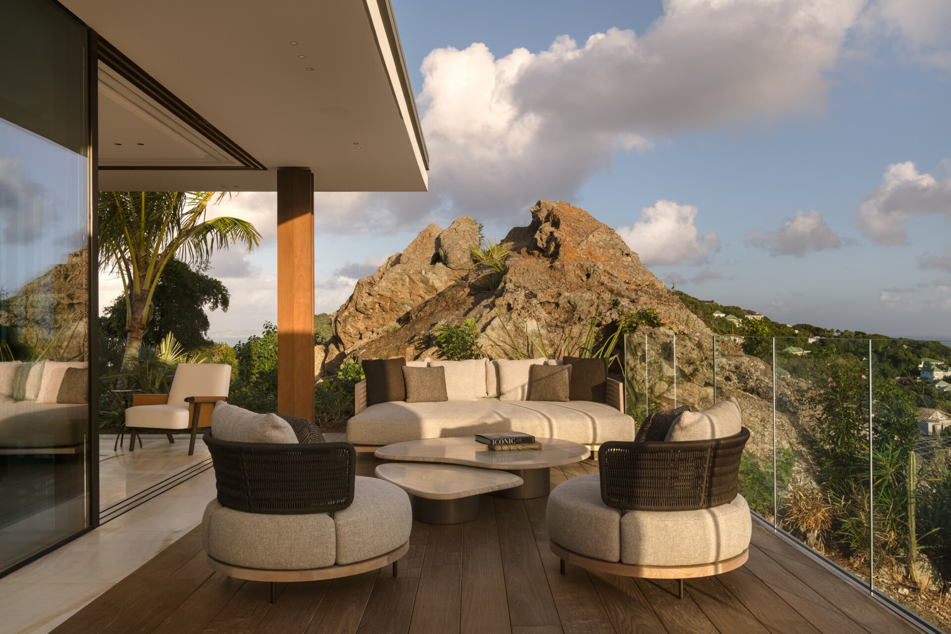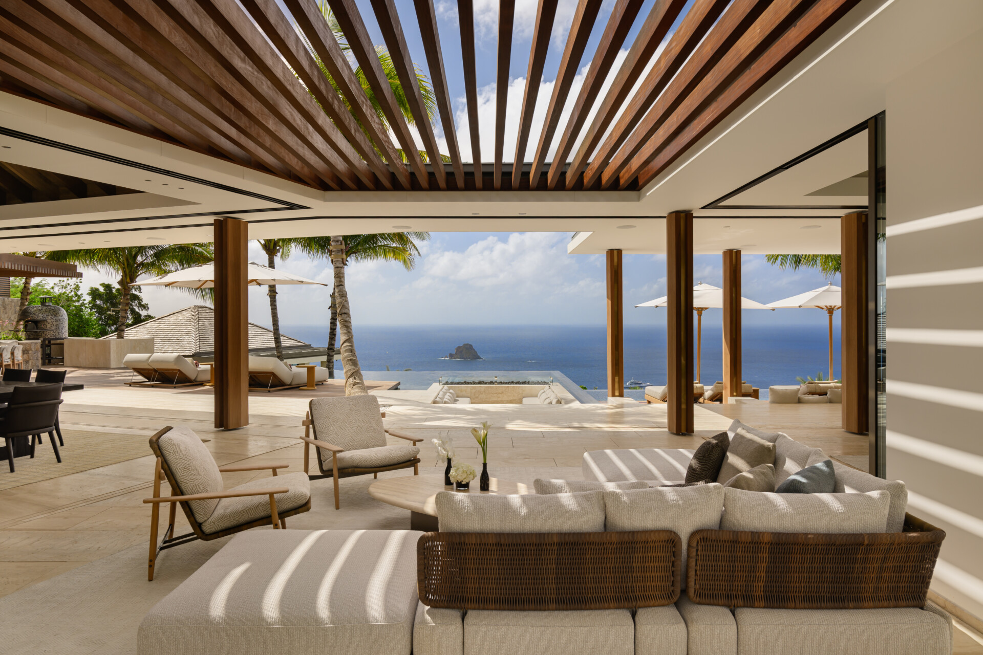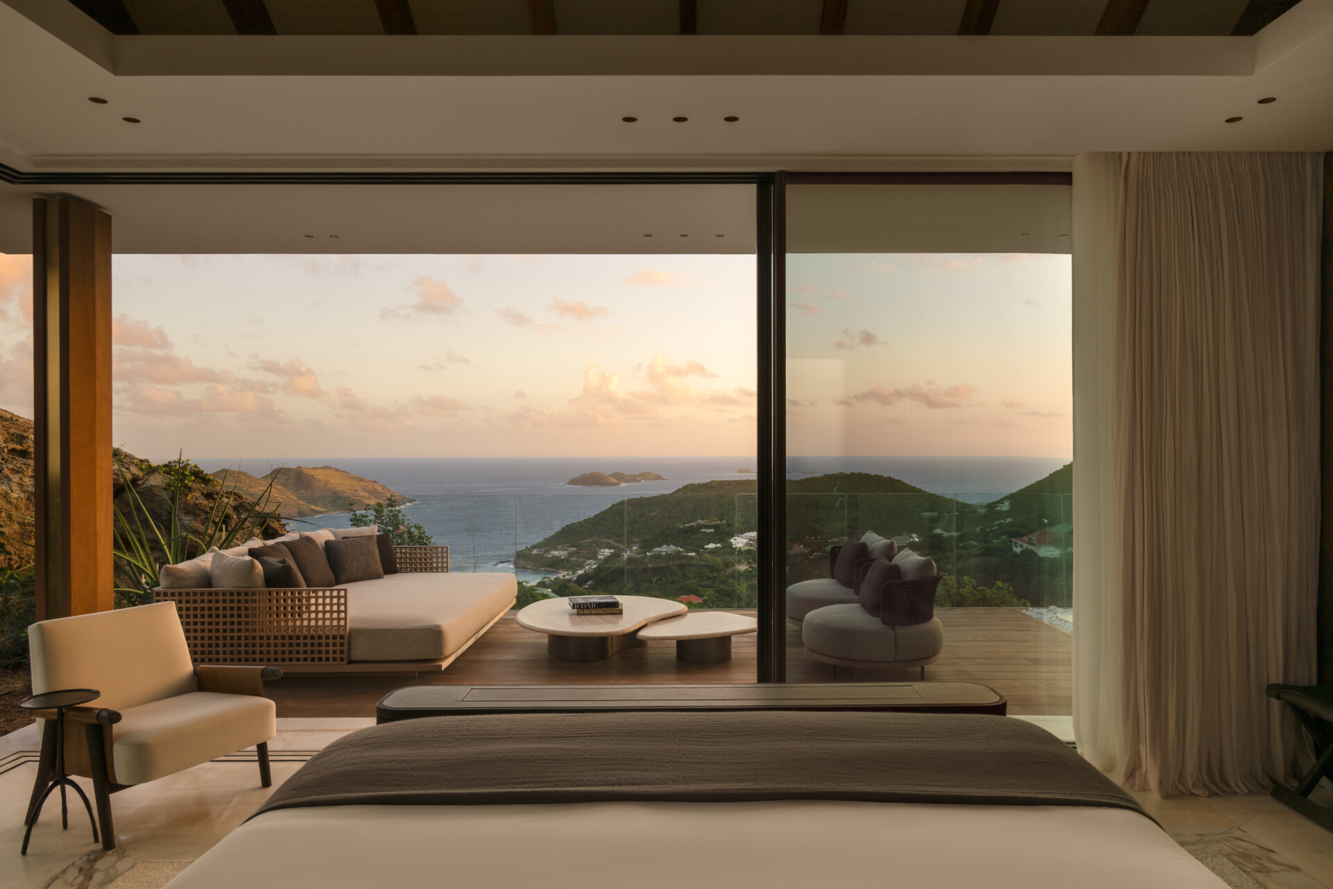At the highest crest of Colombier, where the horizon opens wide and the sea stretches endlessly toward Flamands and the protected shores of Colombier, Villa Omai Zilé commands one of the most extraordinary vantage points on St. Barth. Sunrise arrives in quiet brilliance. Sunset lingers in molten gold. From every angle, the villa engages in a living dialogue with sea and sky.