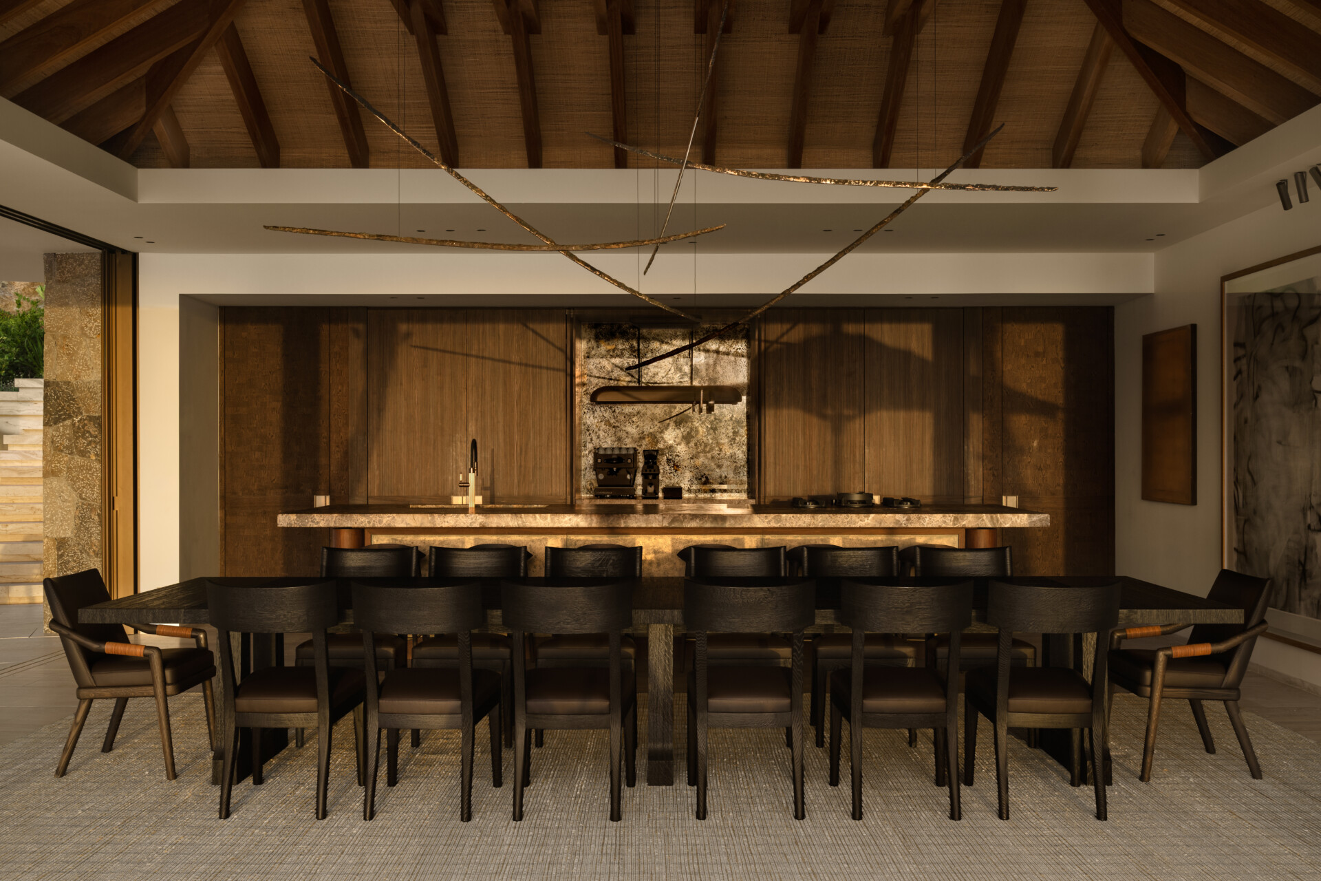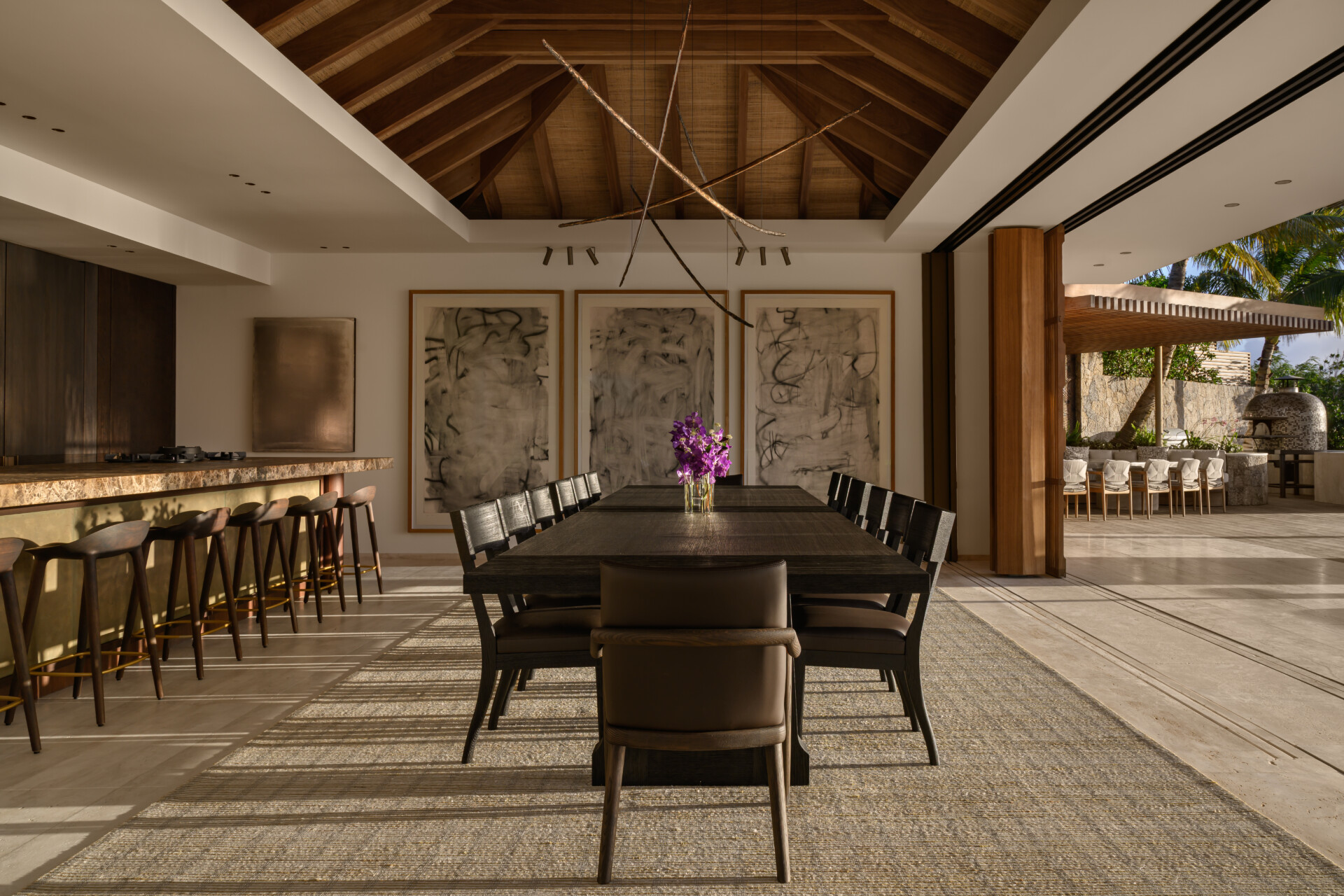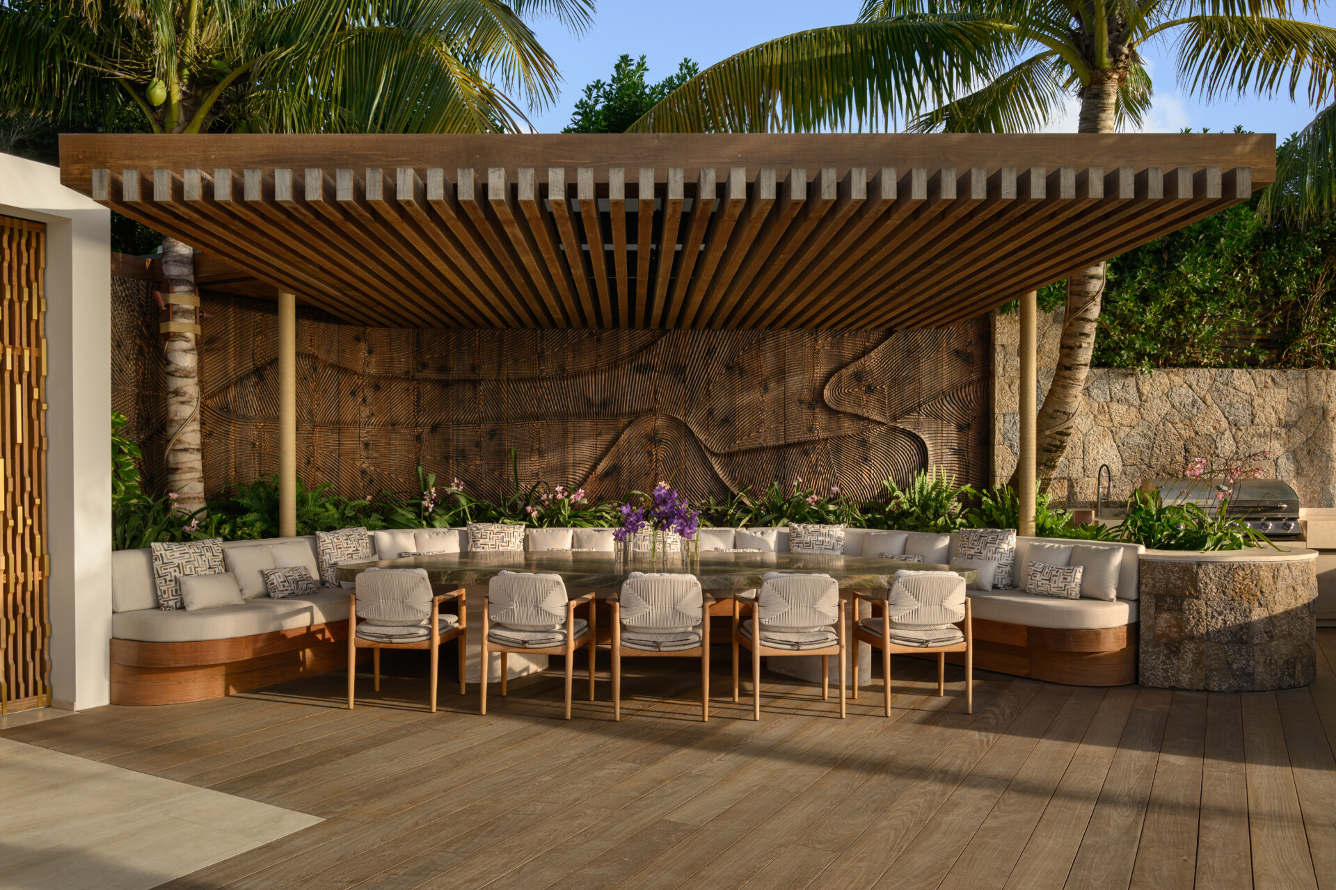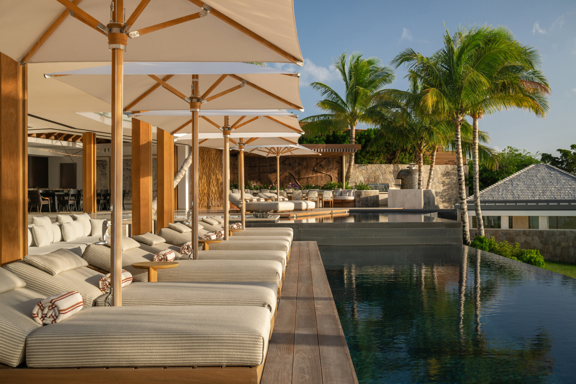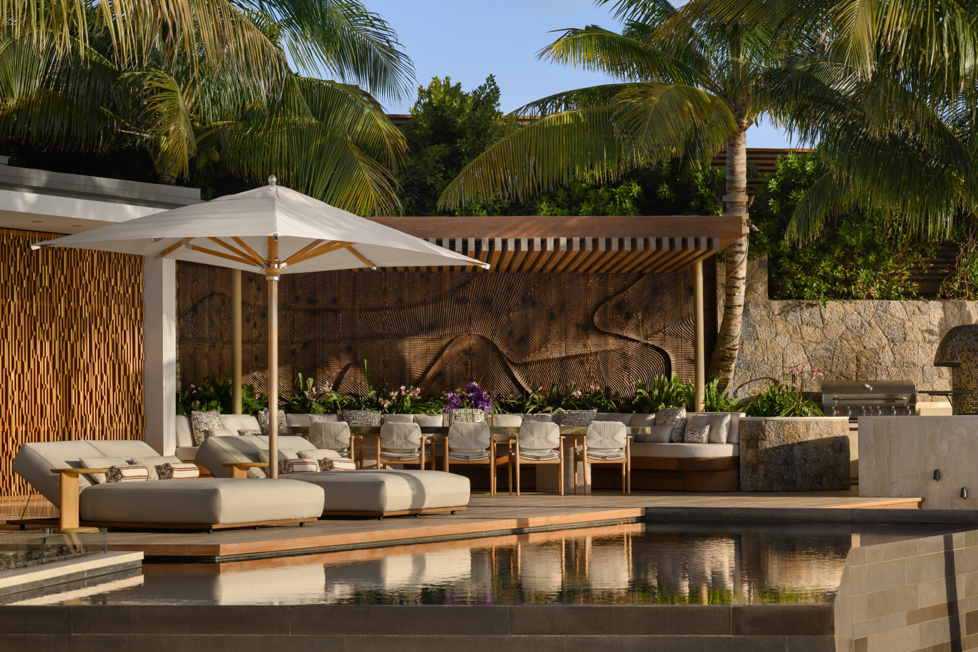 Outdoors, the estate becomes a private landscape of experience. Pergola dining beneath the stars. A Neapolitan pizza oven glowing at dusk. A brasero warming conversation long after sunset. Sun terraces tracing the movement of light. A tranquil pond reflecting palms and sky. The gardens are not decoration - they are part of the architecture, shaping moments of solitude and celebration alike.