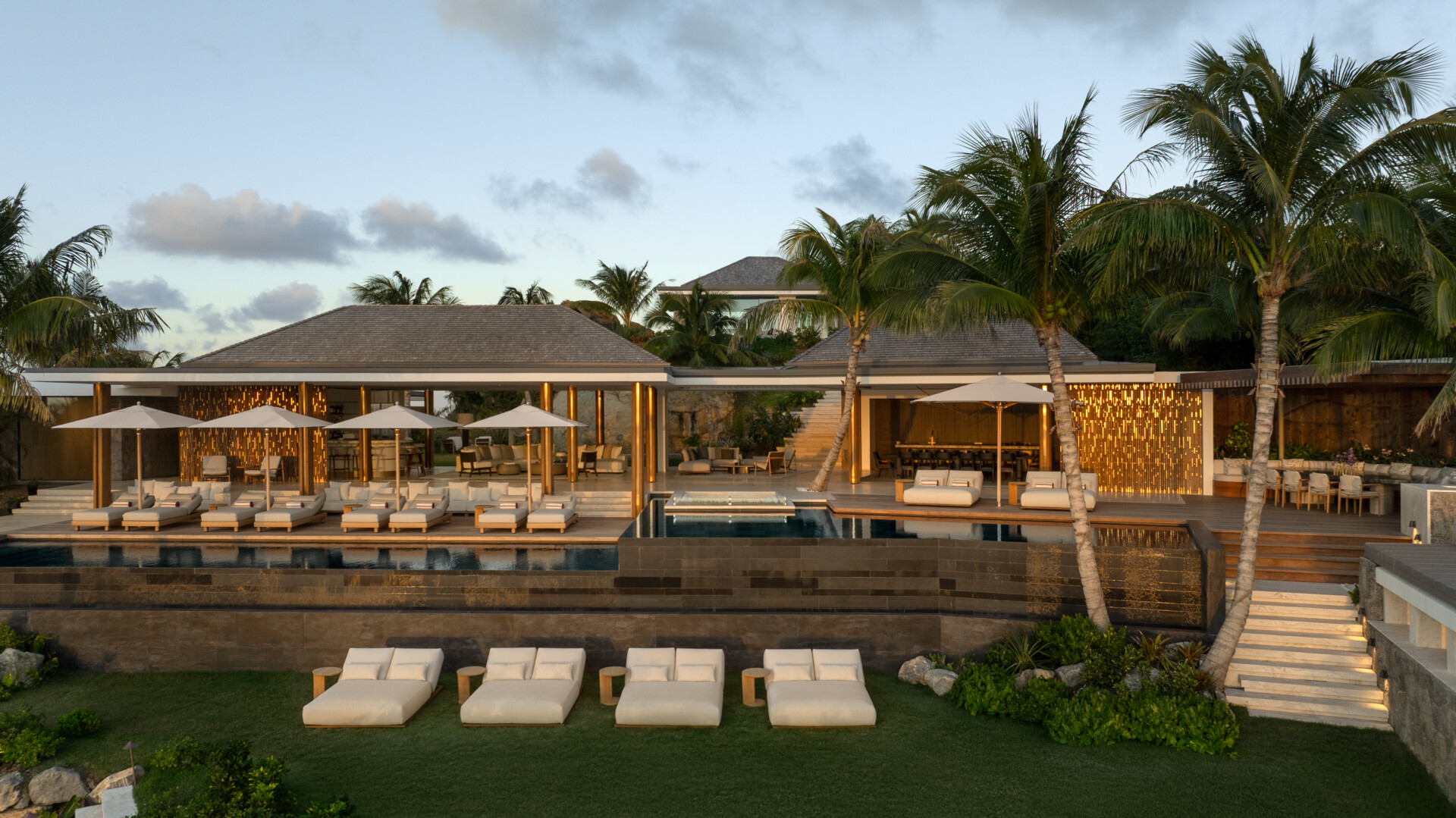 The interiors unfold with cinematic precision. A show-kitchen with bar anchors the dining space, seamlessly supported by a professional kitchen designed for refined culinary experiences. A separate living salon with its own show-bar invites evening gatherings, while sliding walls dissolve the boundary between inside and out. Two heated infinity pools extend toward the horizon, mirroring the sky and amplifying the sense of space.