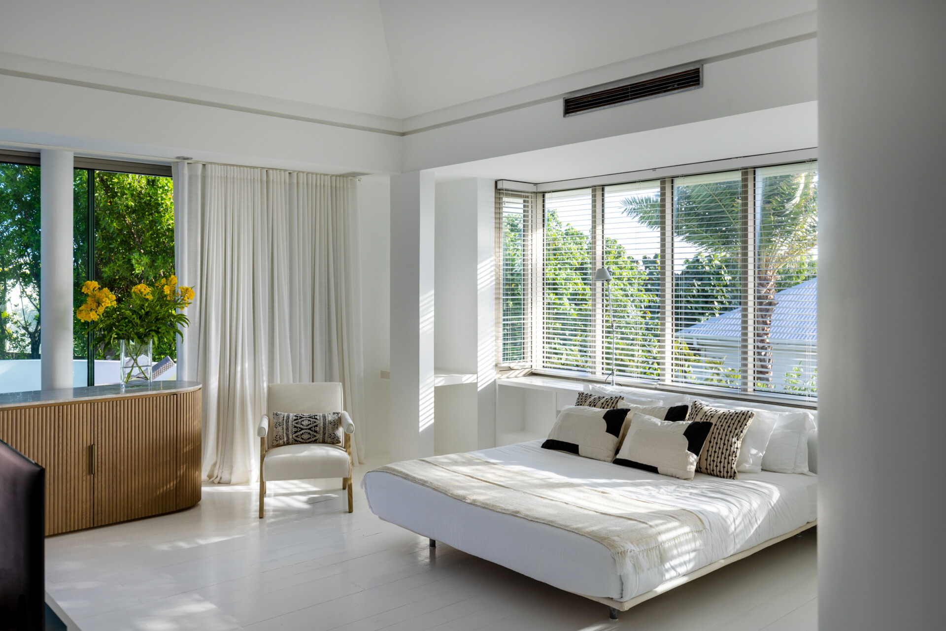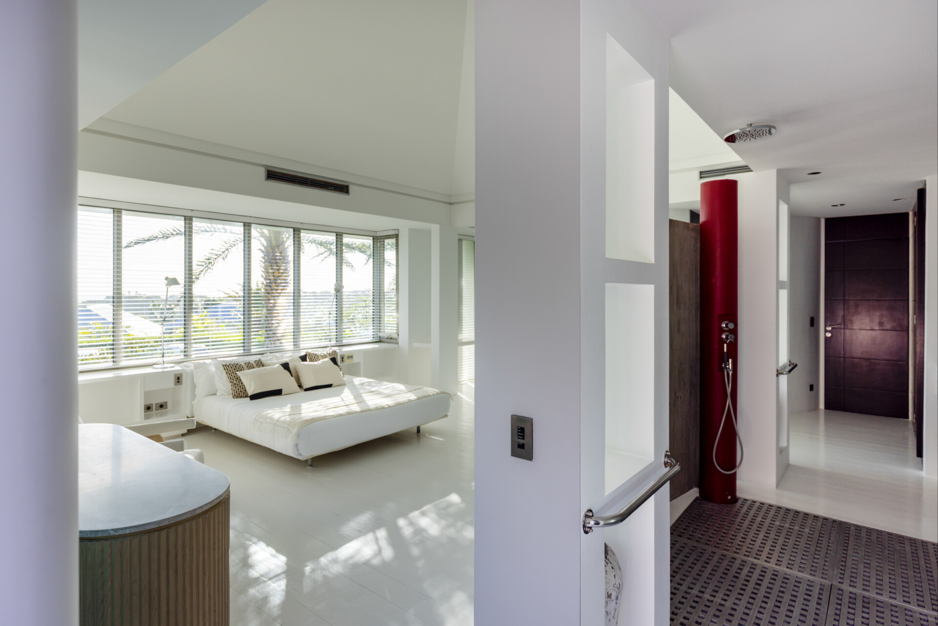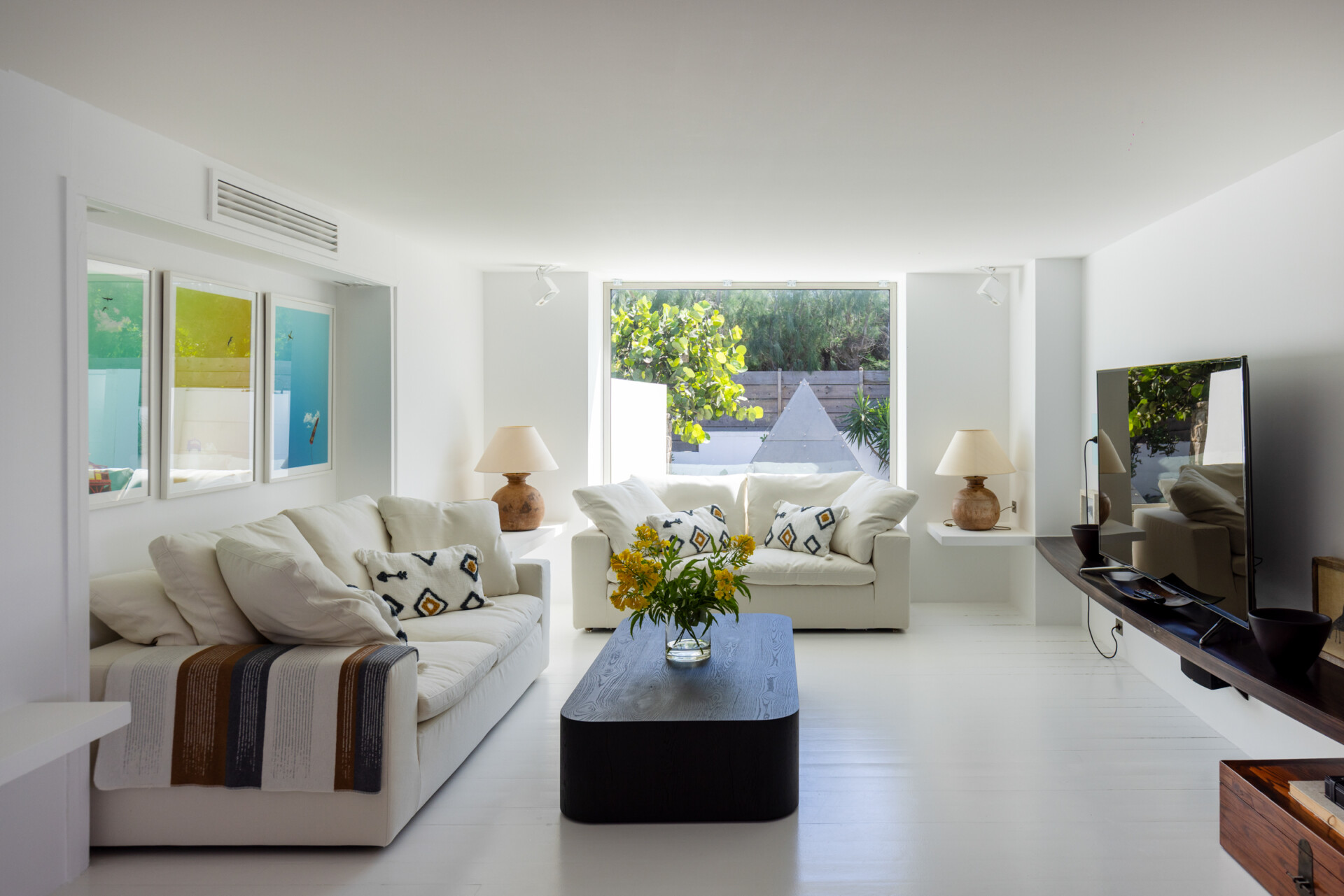 Large contemporary and minimalist living room with large white sofas. Open to the terrace and faces ocean view. Separate TV room with DVD Player, 3D Flat screen TV, Wifi. Small Office with printer and fax machine. A private toilet is located between the 2 bedrooms for guests.